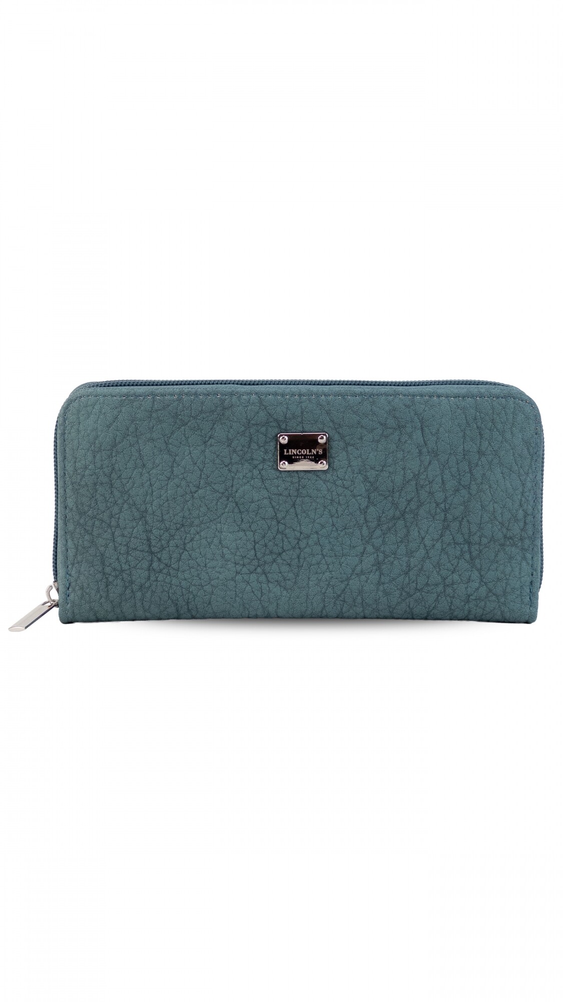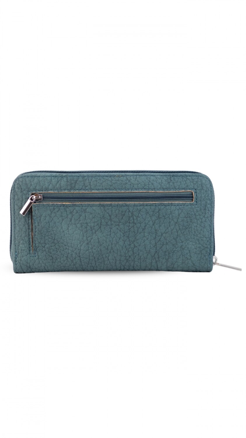 Billetera larga con cierre alrededor. Incluye varias reparticiones con tarjeteros y bolsillos a de más de un bolsillo con cierre en el interior. Monedero con cierre atrás.