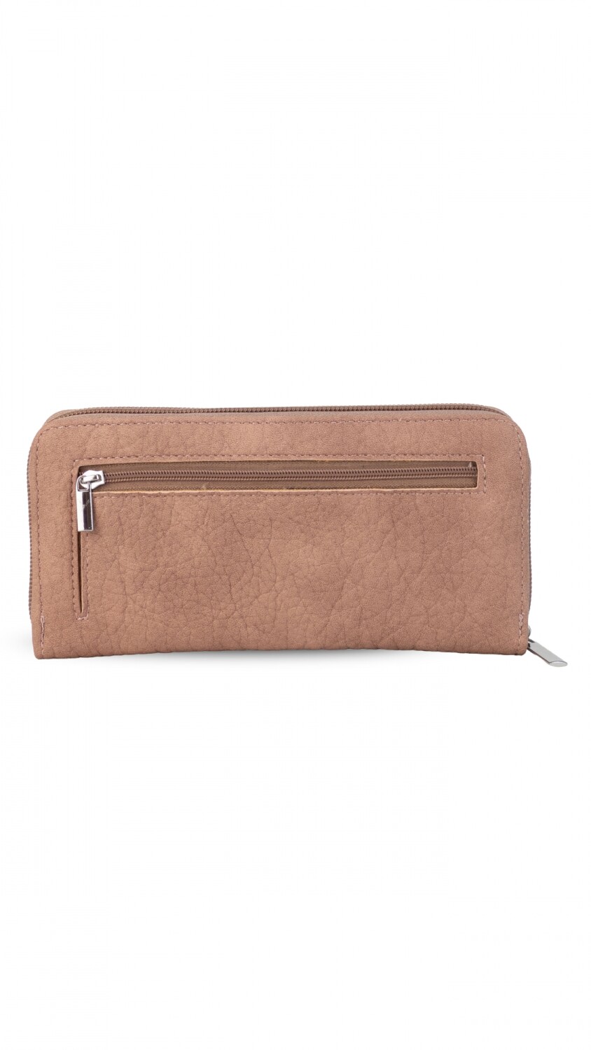 Billetera larga con cierre alrededor. Incluye varias reparticiones con tarjeteros y bolsillos a de más de un bolsillo con cierre en el interior. Monedero con cierre atrás.