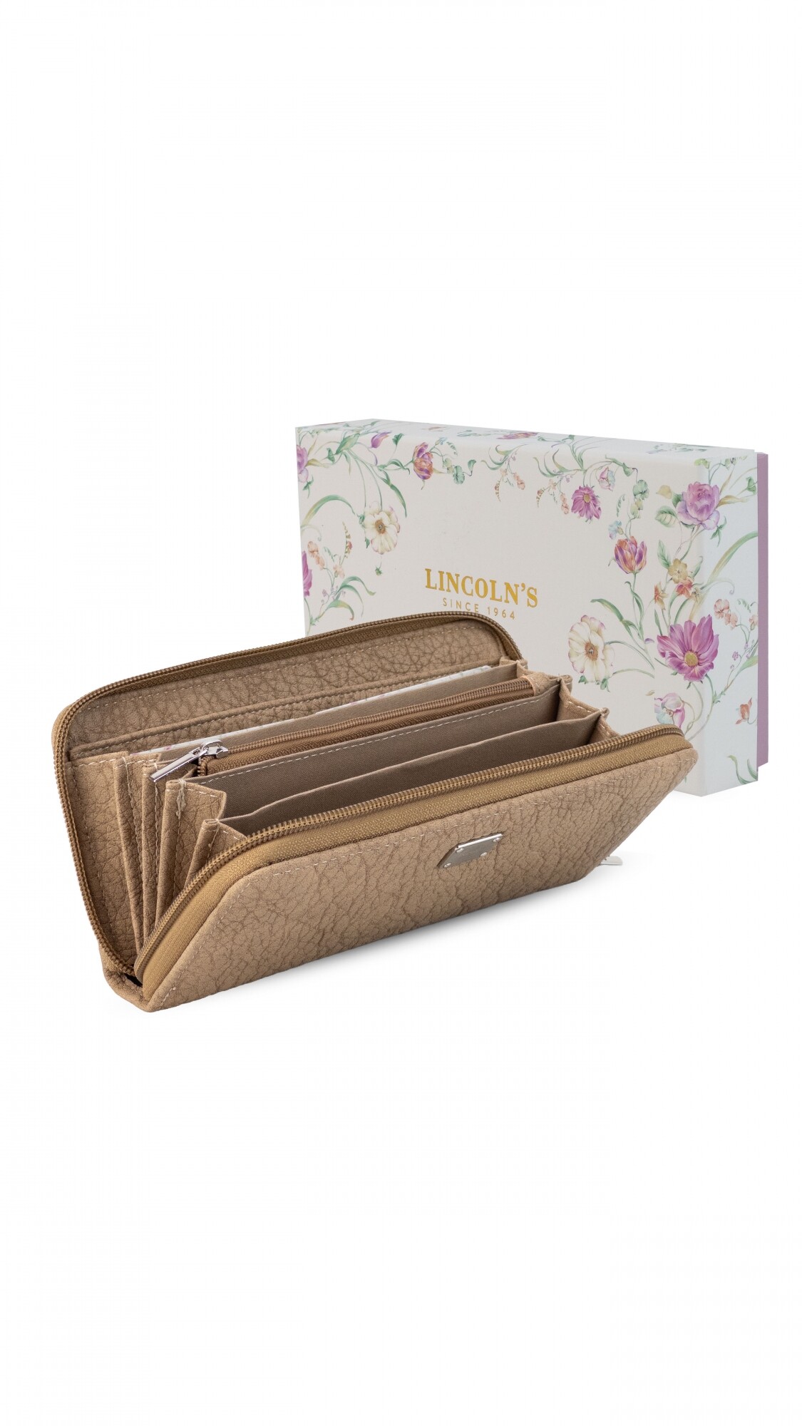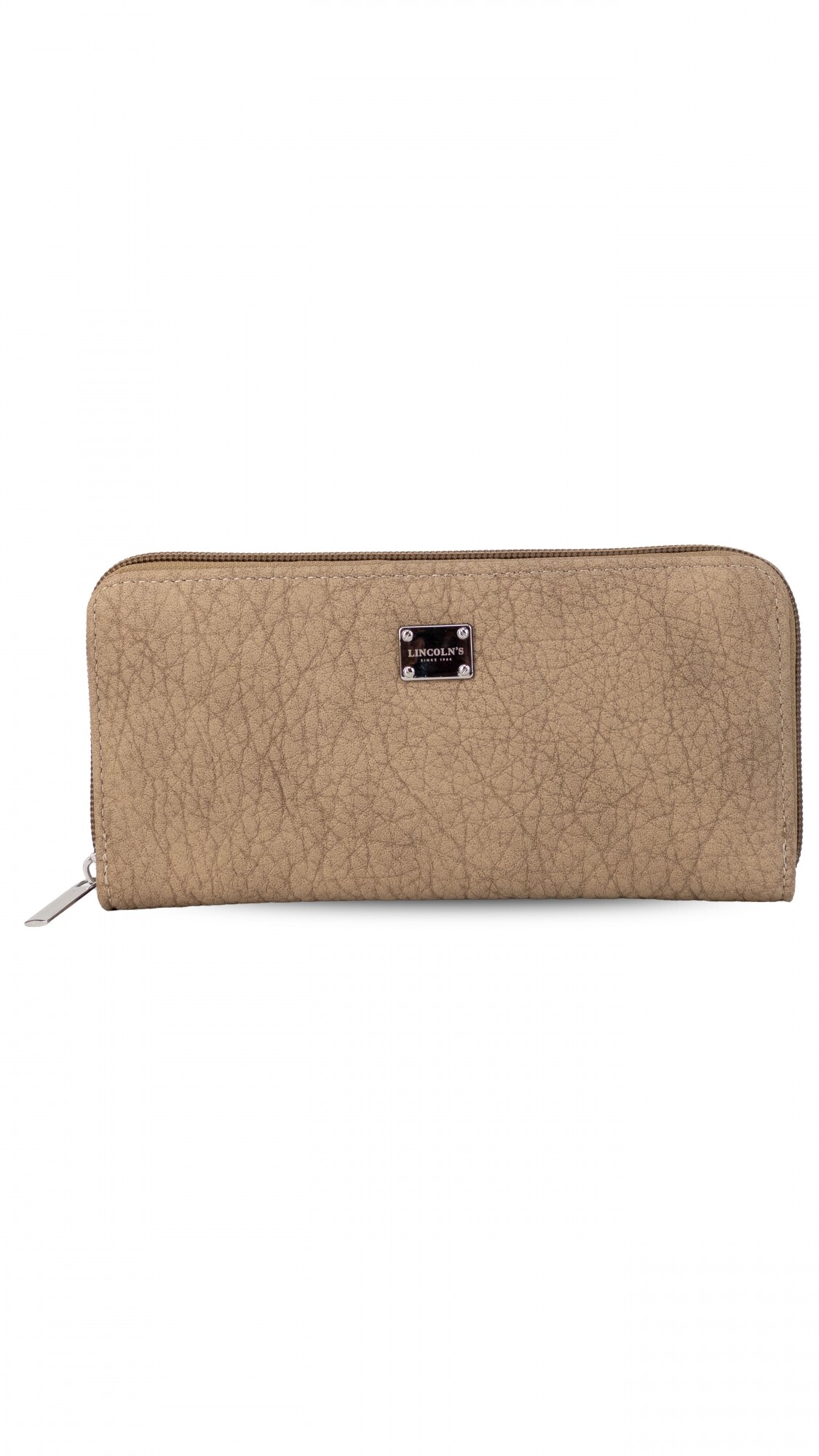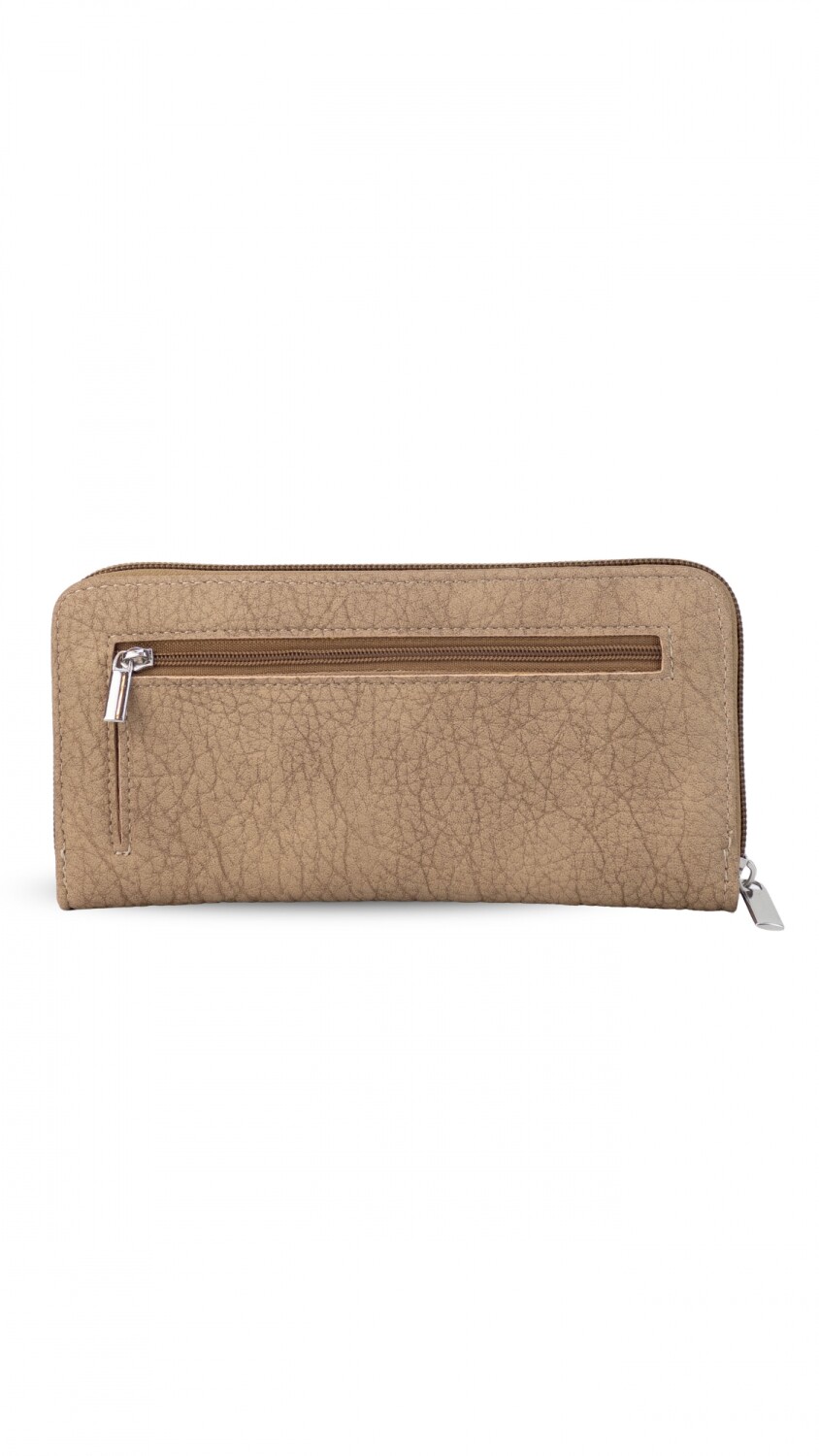 Billetera larga con cierre alrededor. Incluye varias reparticiones con tarjeteros y bolsillos a de más de un bolsillo con cierre en el interior. Monedero con cierre atrás.