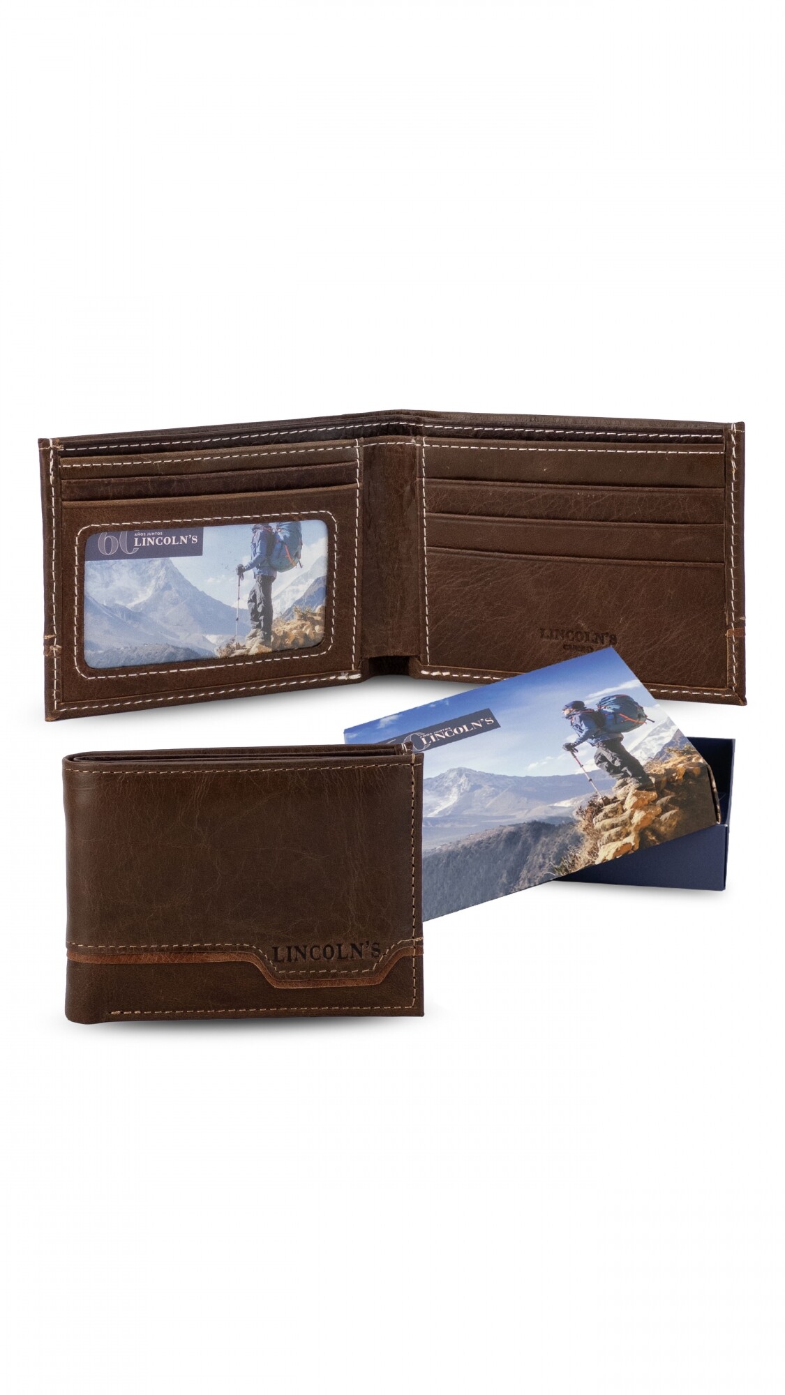 Billetera en cuero con volante interior con visor y tarjeteros. Doble repartición para billetes.
