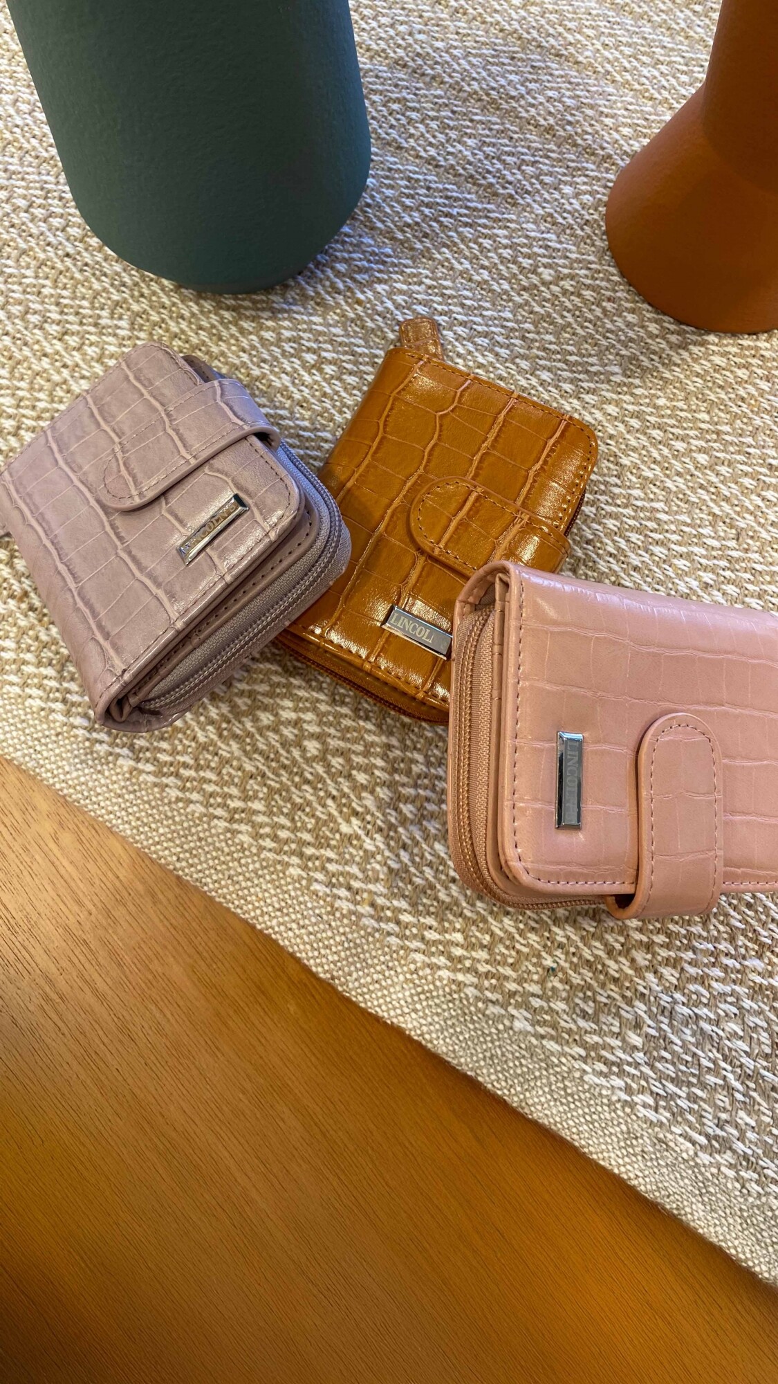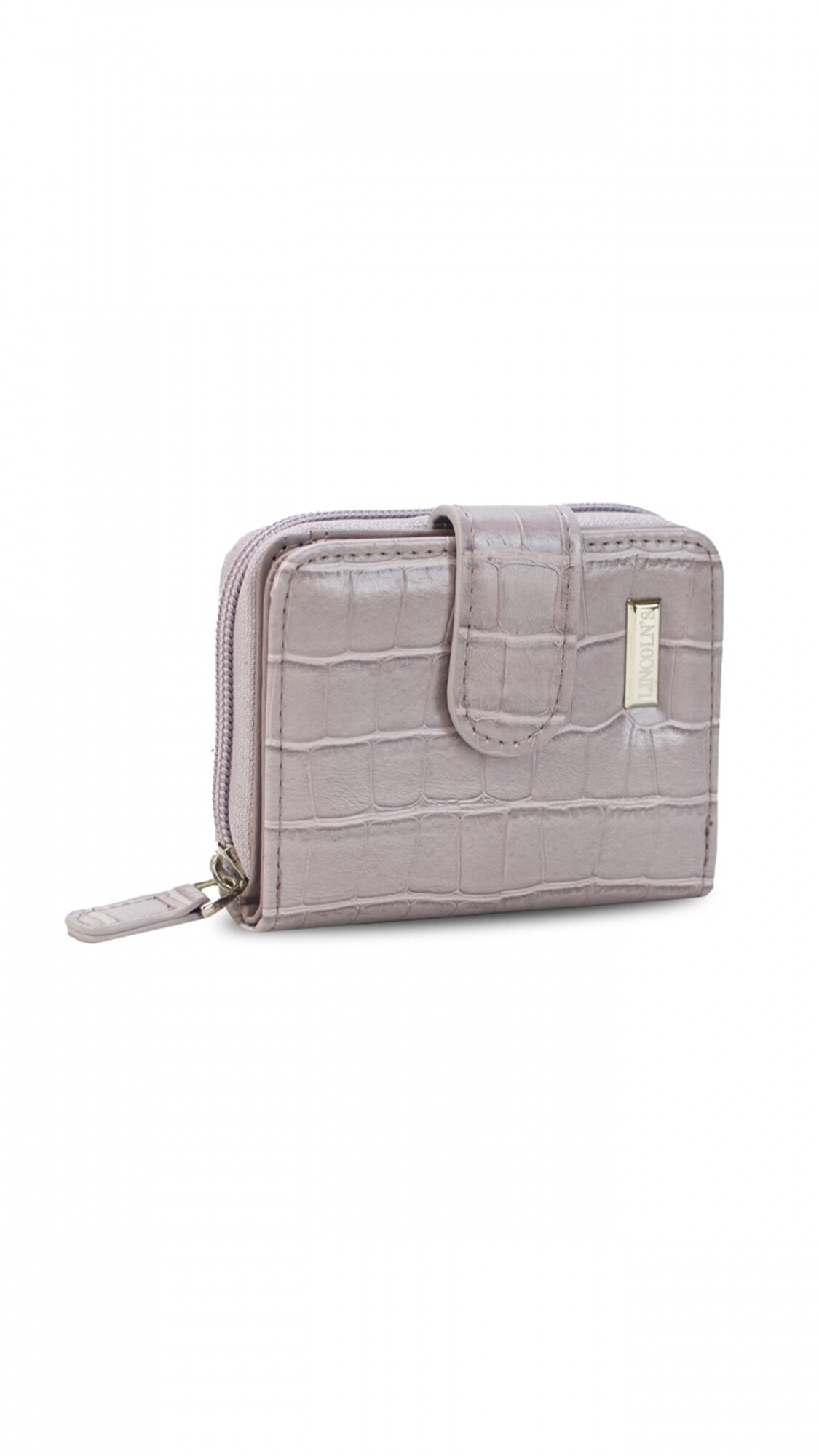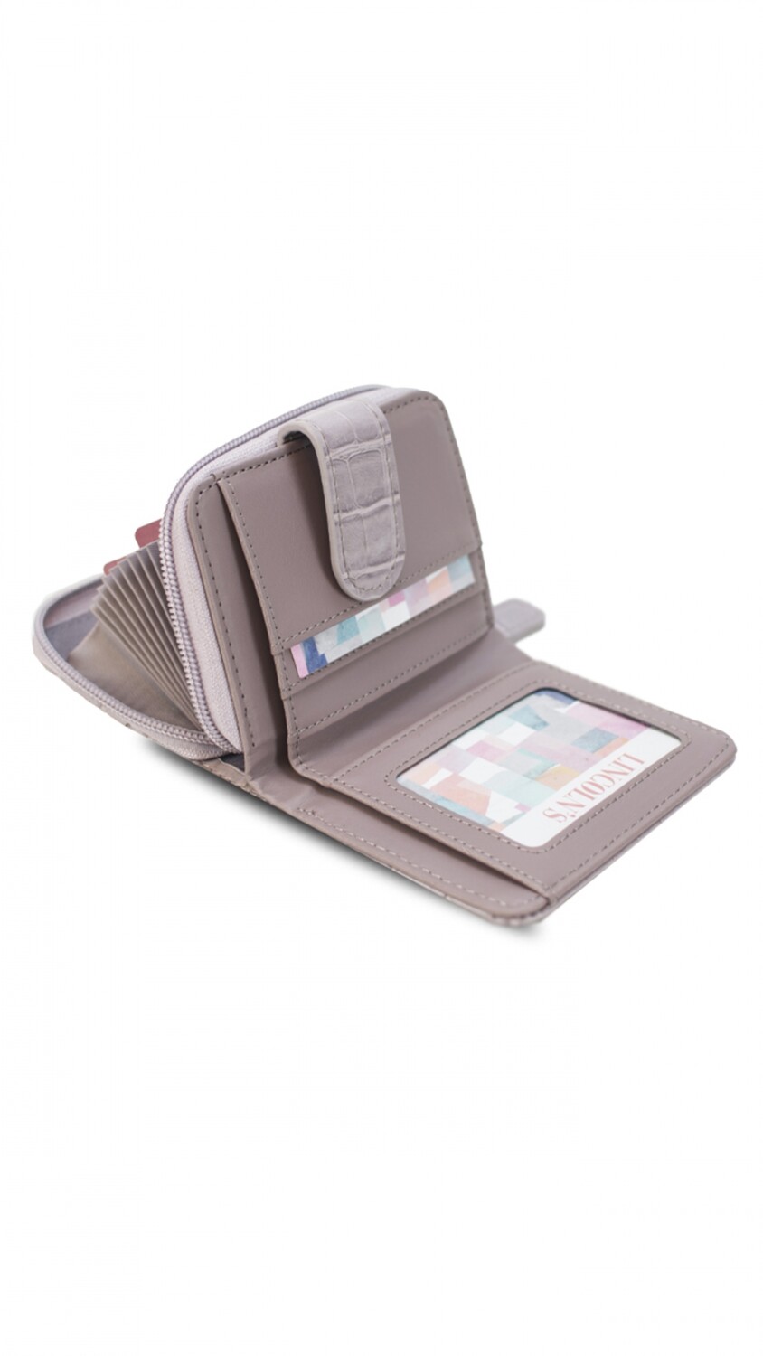 Interior con tarjeteros, visor, bolsillos y repartición para billetes.