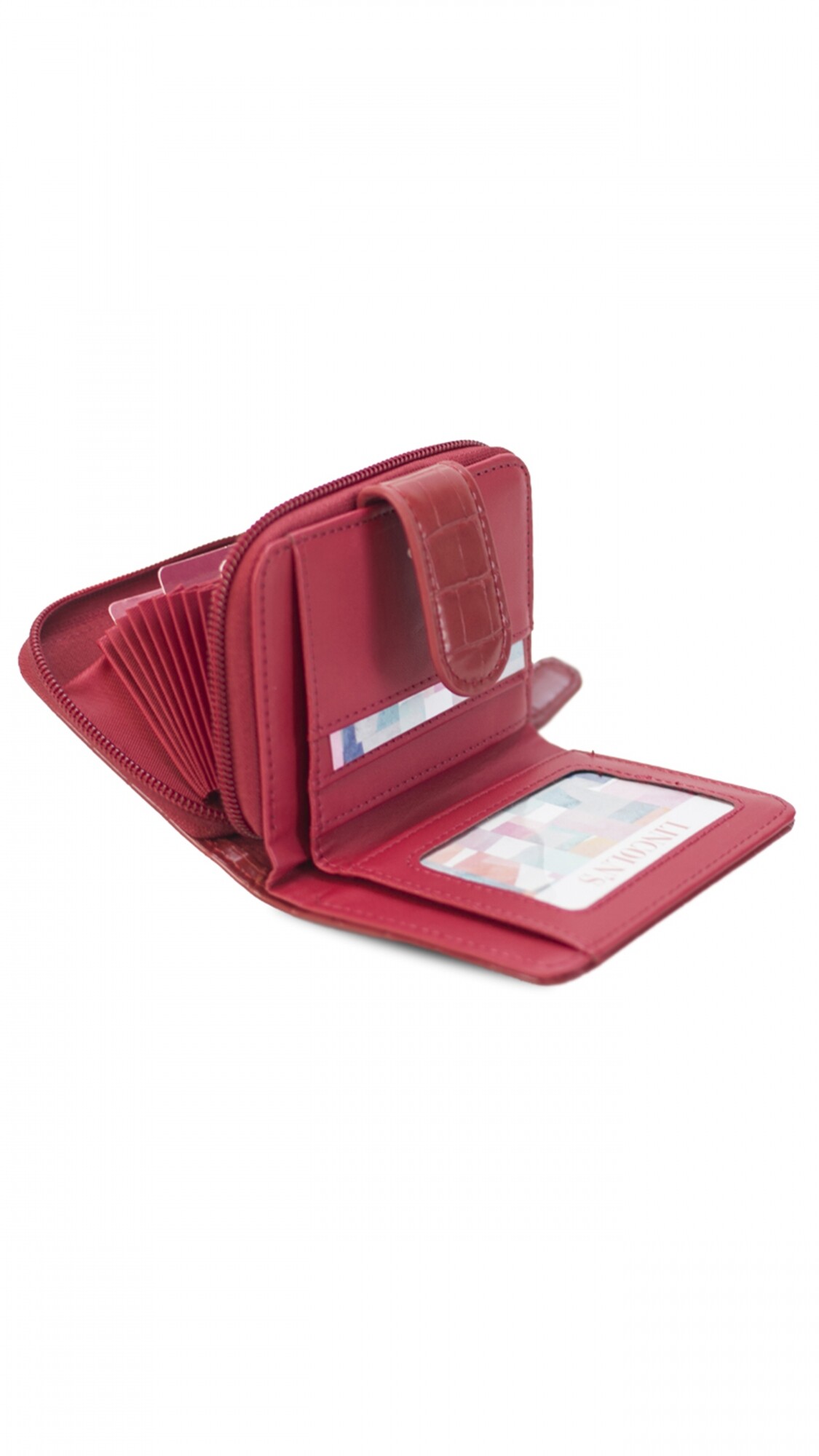 Interior con tarjeteros, visor, bolsillos y repartición para billetes.