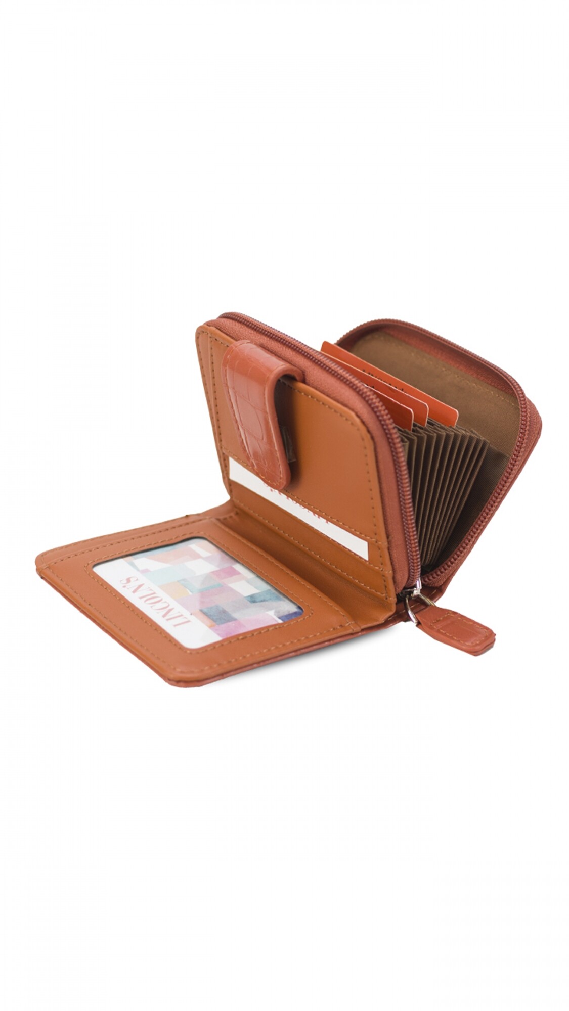 Interior con tarjeteros, visor, bolsillos y repartición para billetes.
