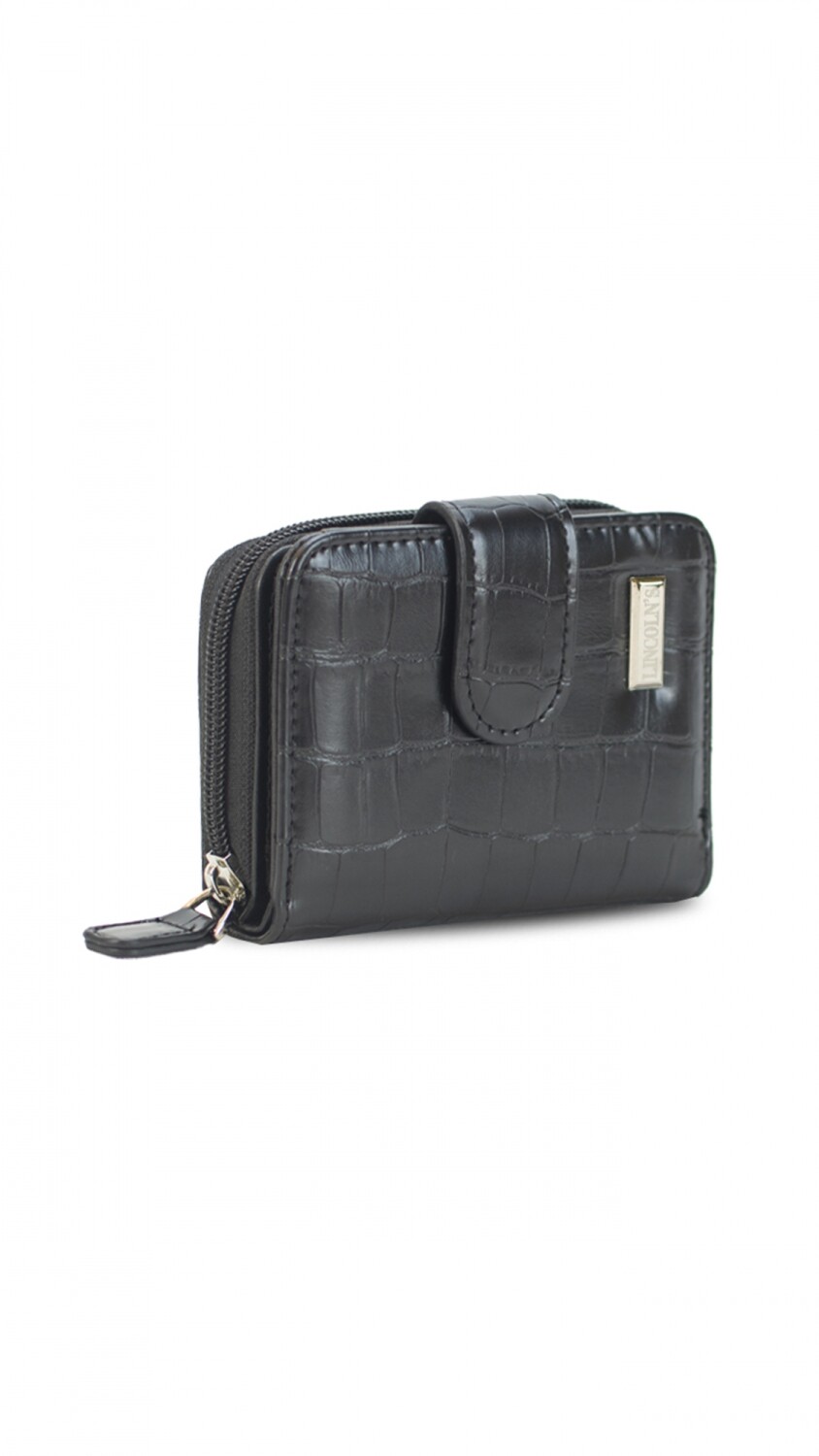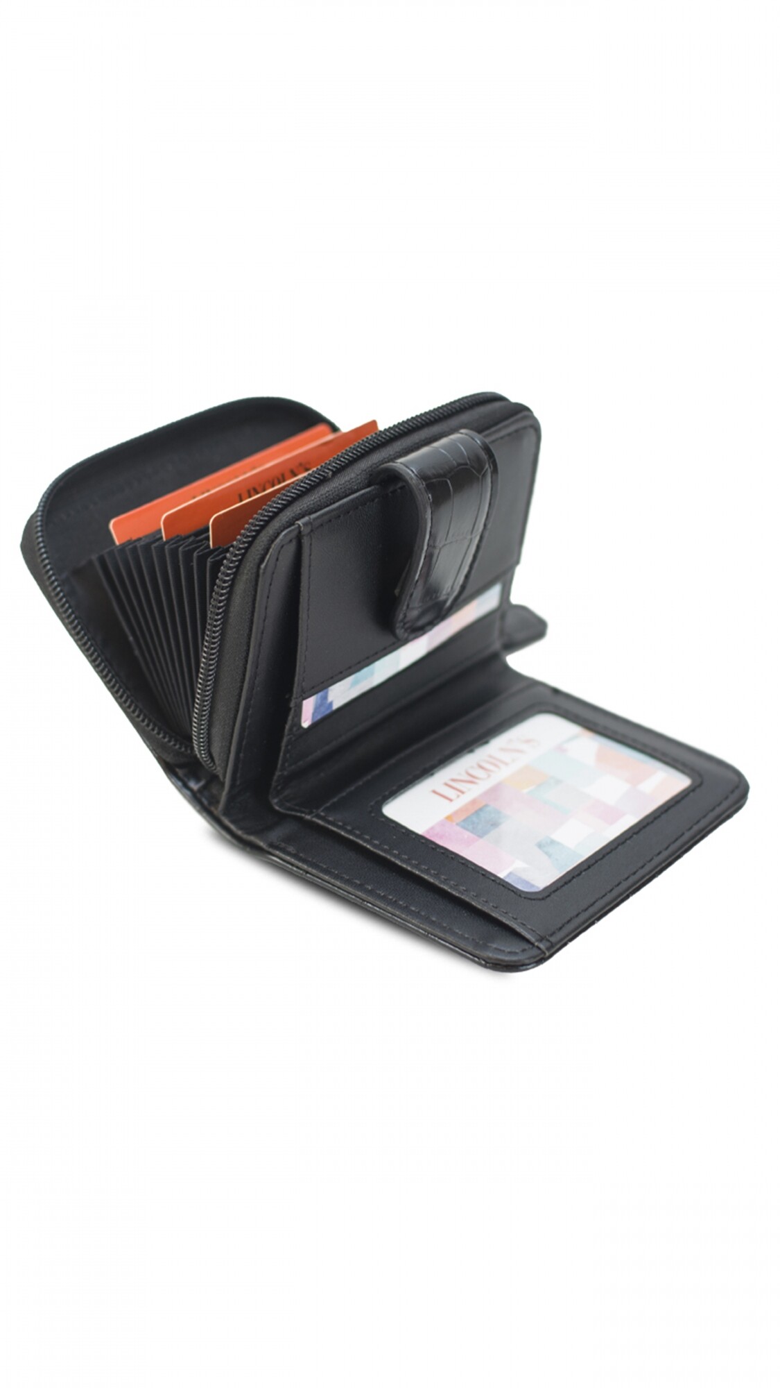 Interior con tarjeteros, visor, bolsillos y repartición para billetes.