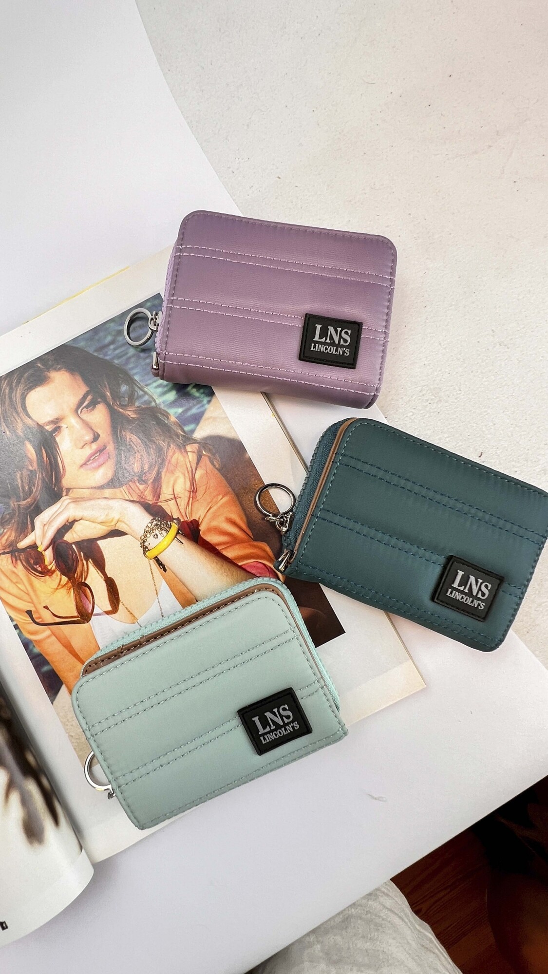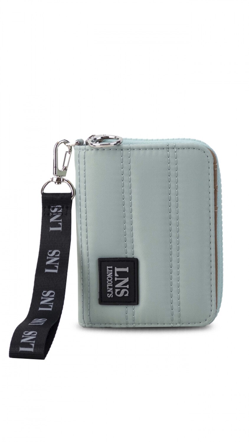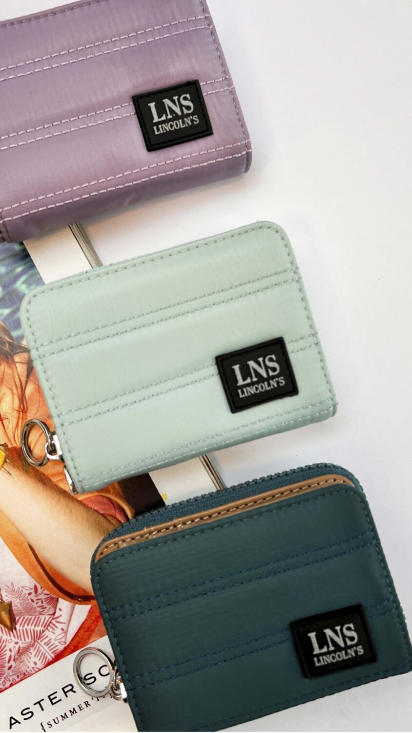 Billetera corta con cierre alrededor y tapa. Tela capitoneada.