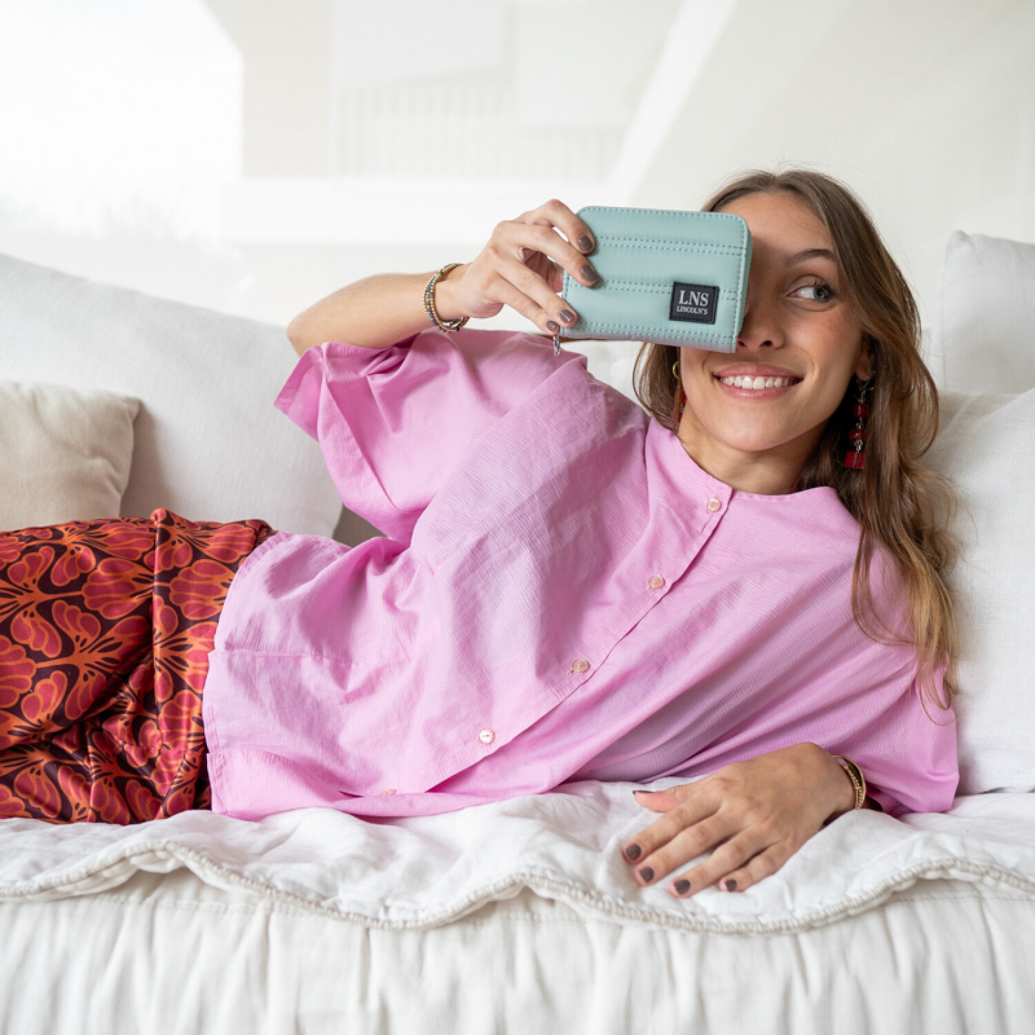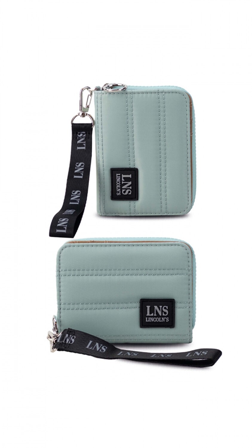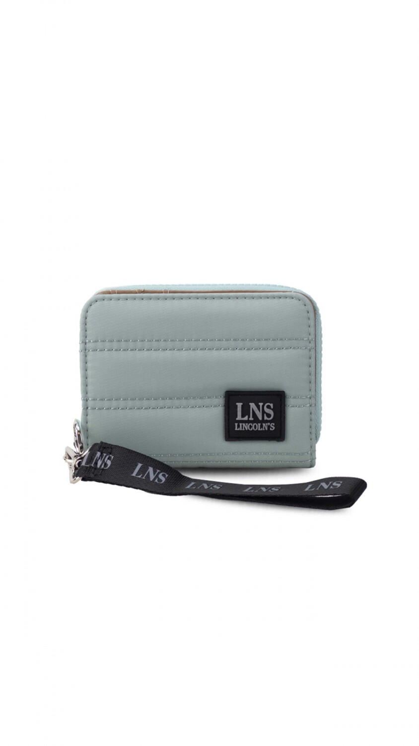 Billetera corta con cierre alrededor y tapa. Tela capitoneada.
