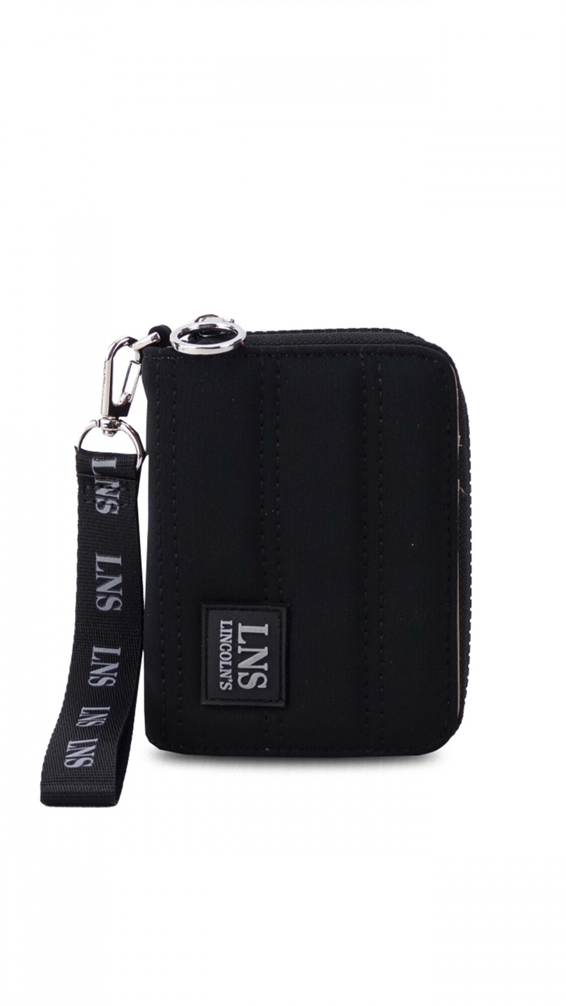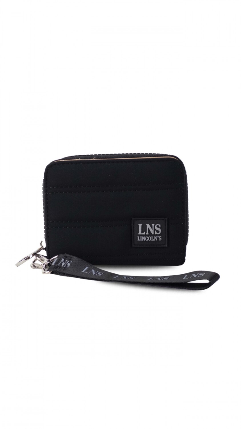Billetera corta con cierre alrededor y tapa. Tela capitoneada.