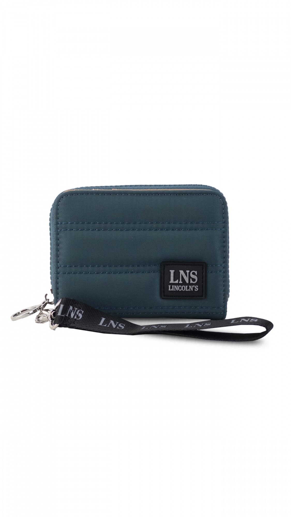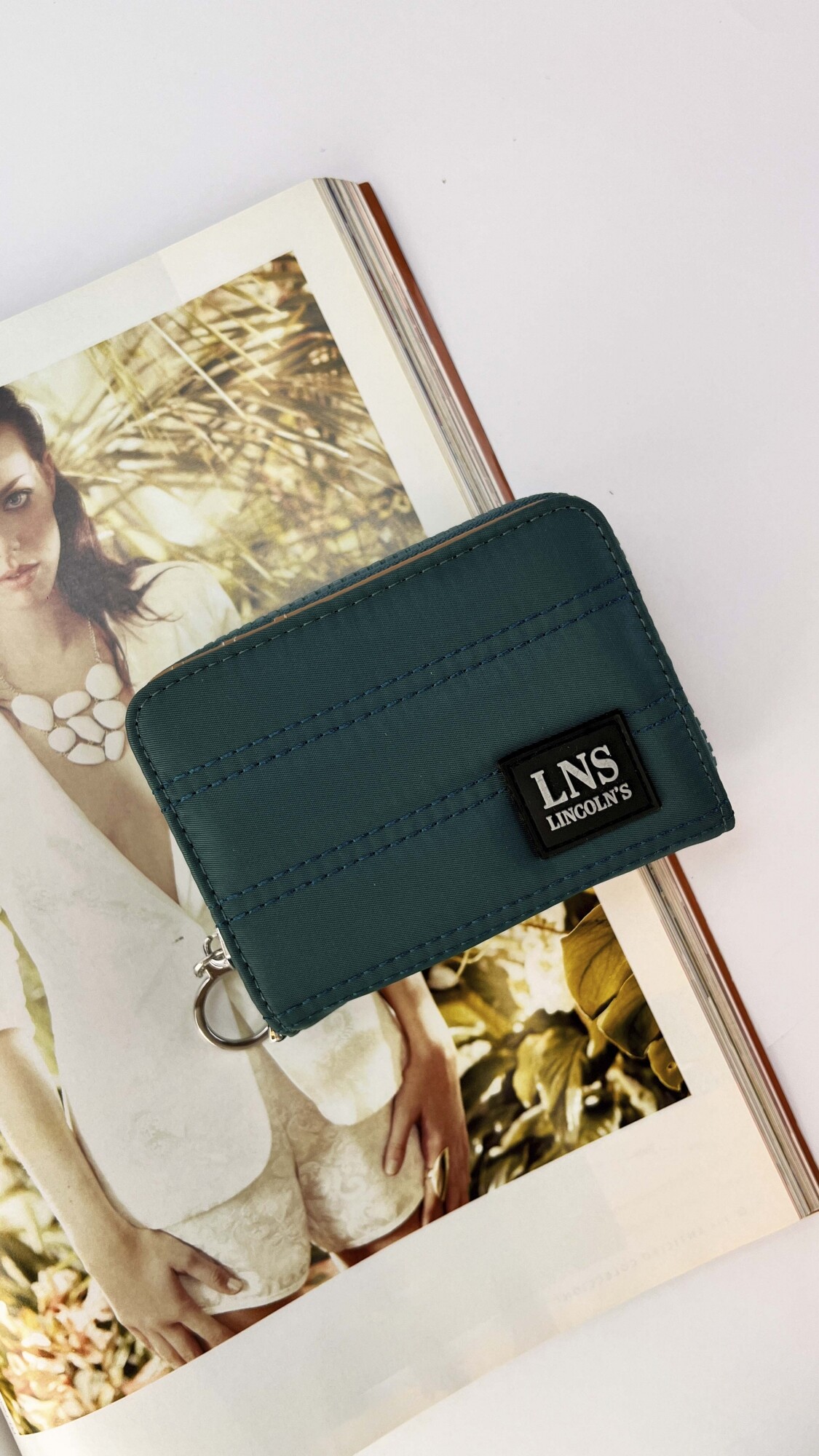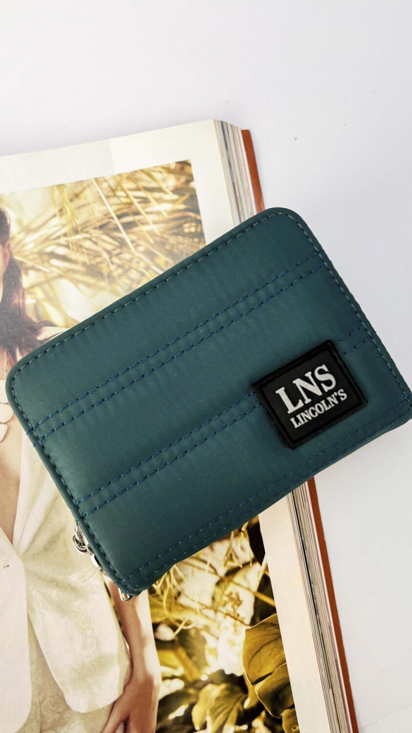 Billetera corta con cierre alrededor y tapa. Tela capitoneada.