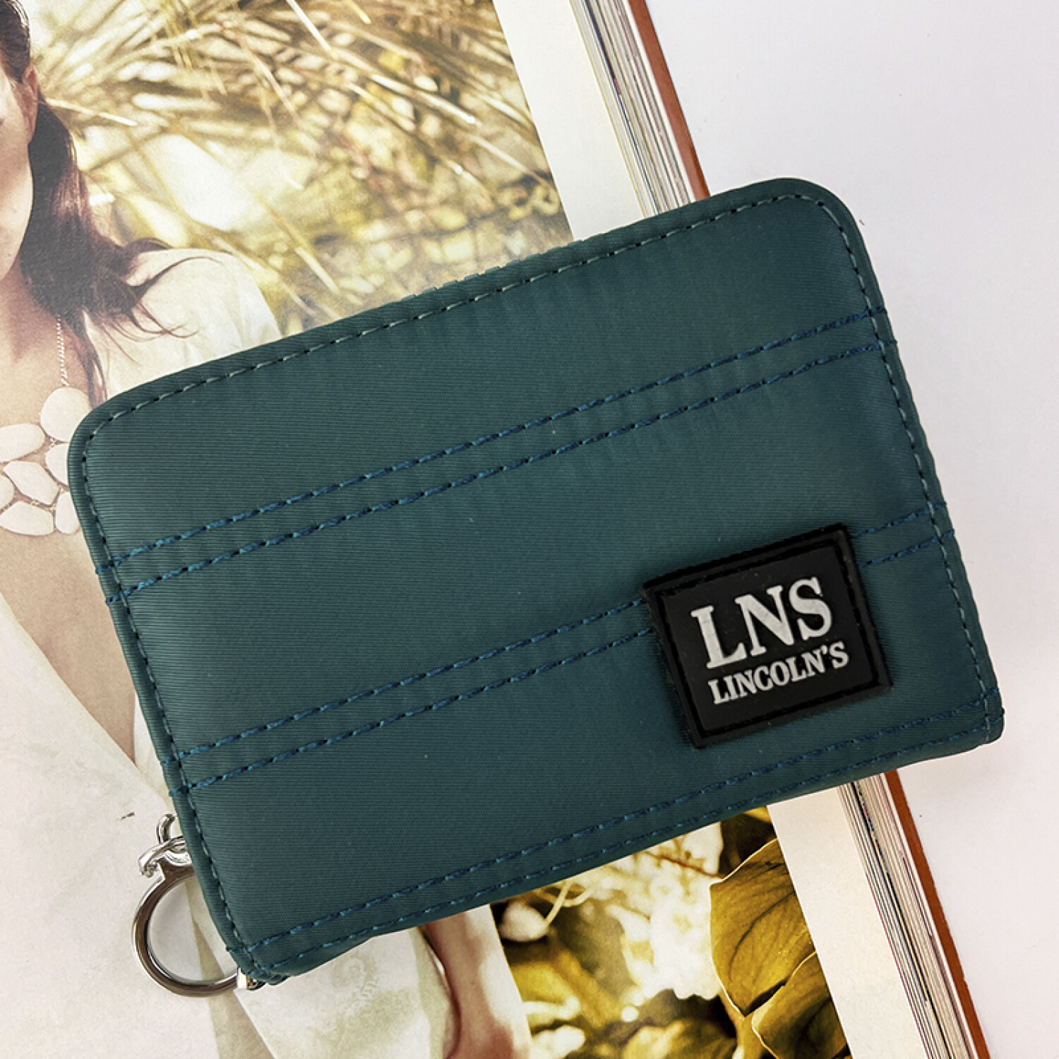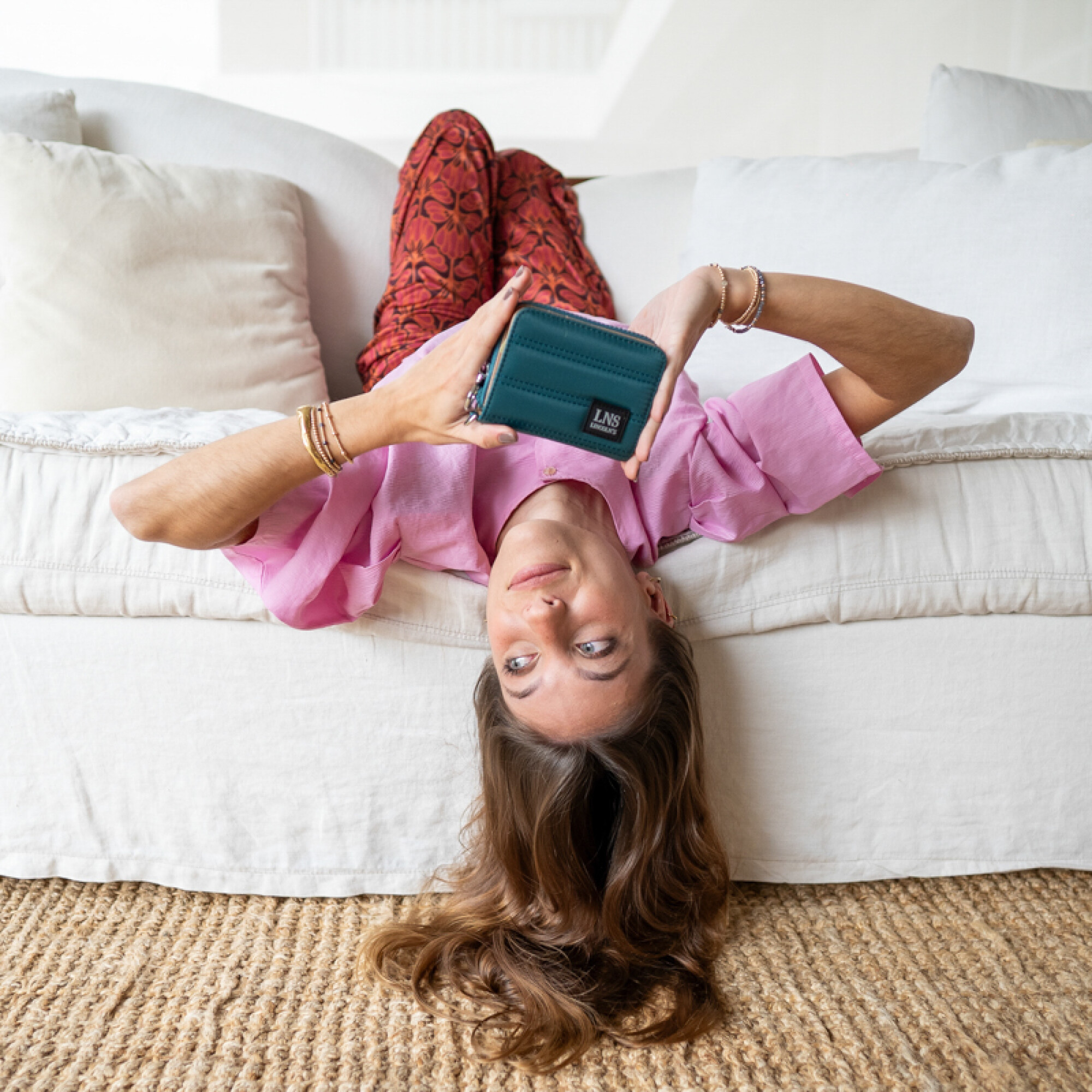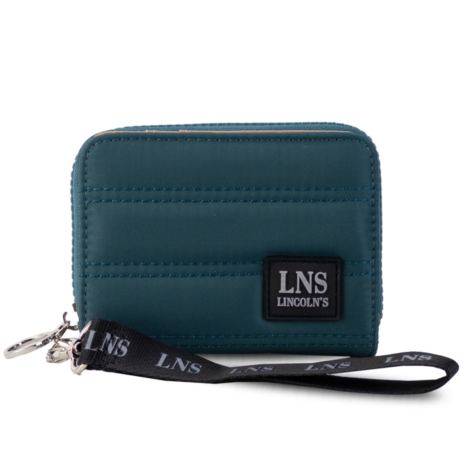 Billetera corta con cierre alrededor y tapa. Tela capitoneada.