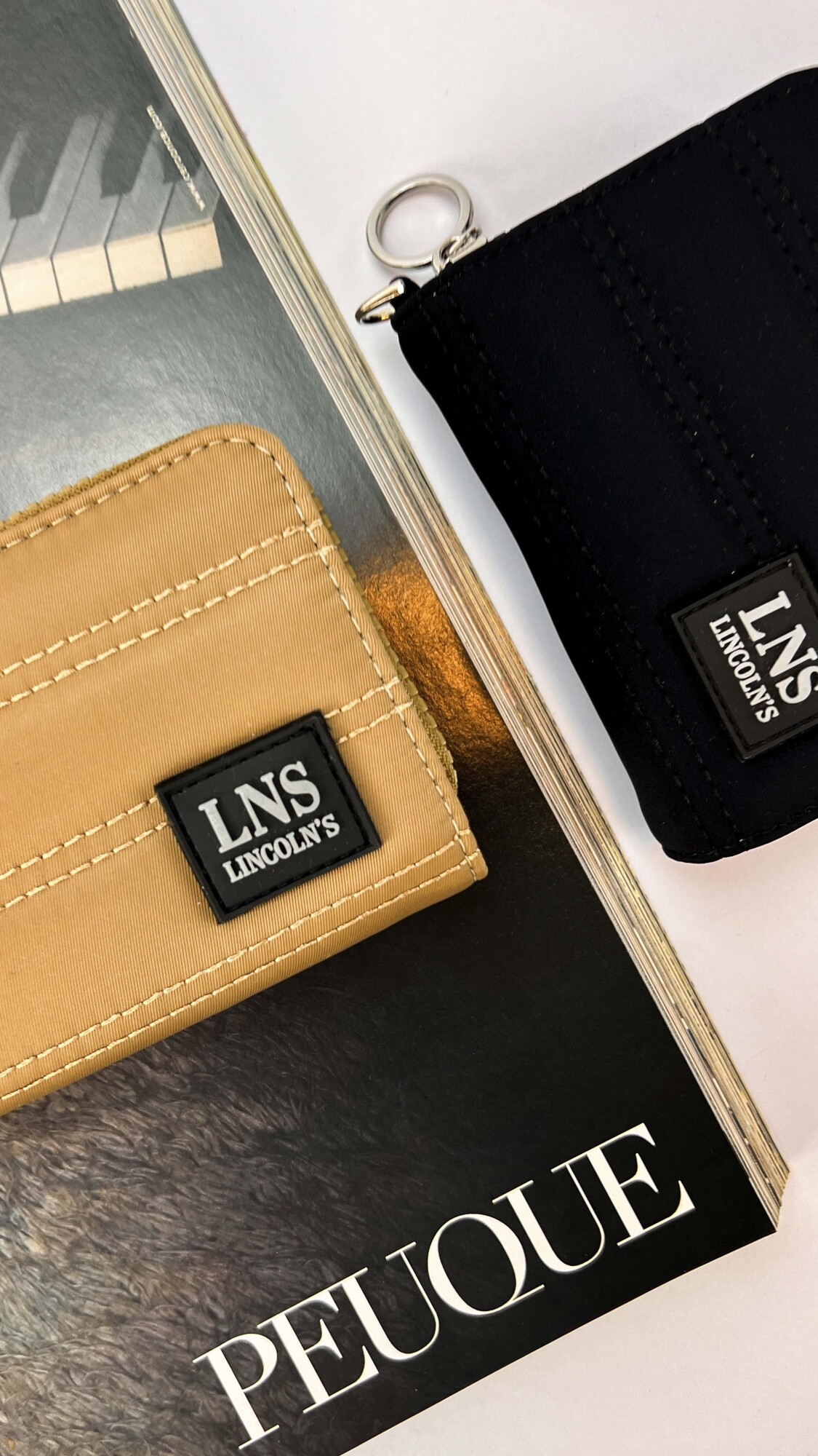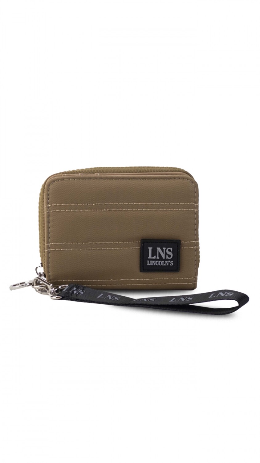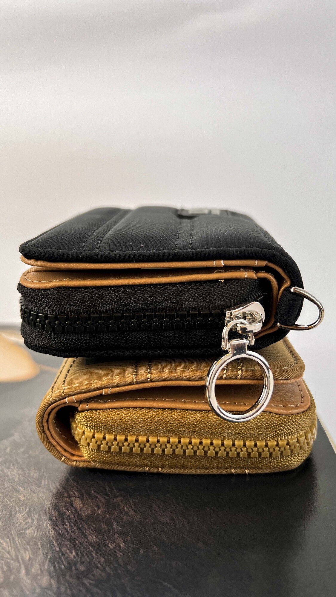 Billetera corta con cierre alrededor y tapa. Tela capitoneada.