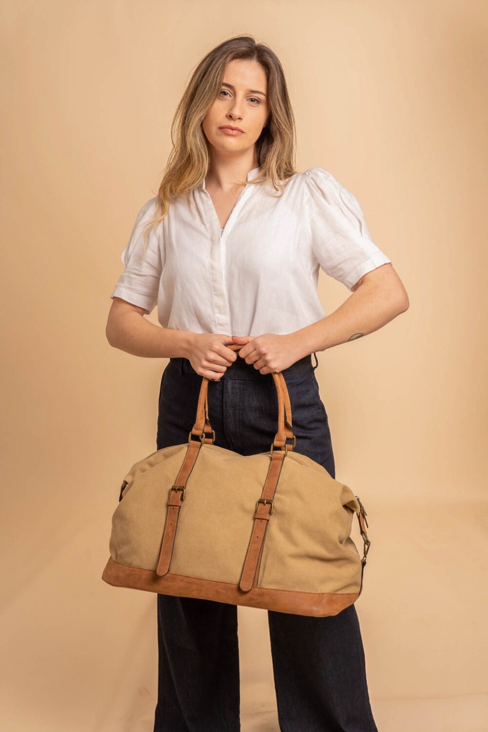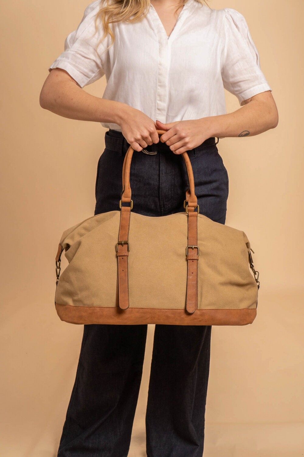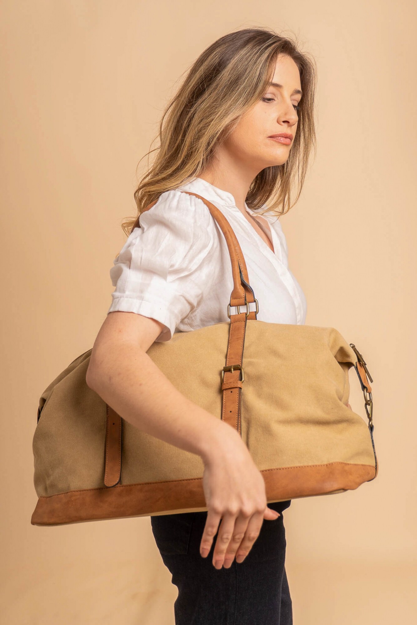Bolso de viaje amplio y resistente, confeccionado en tela Canvas con detalles en símil cuero. incluye asas dobles y correa ajustables para llevar al hombro o cruzado. diseño practico y elegante, ideal para escapadas y uso diario