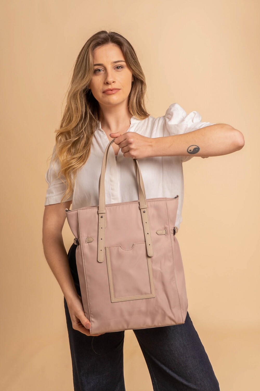 Bandolera elegante. Cuenta con asas dobles, correa ajustable y bolsillo frontal. Ideal para uso diario gracias a su diseño funcional y moderno.