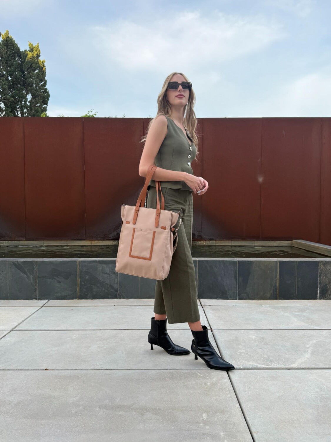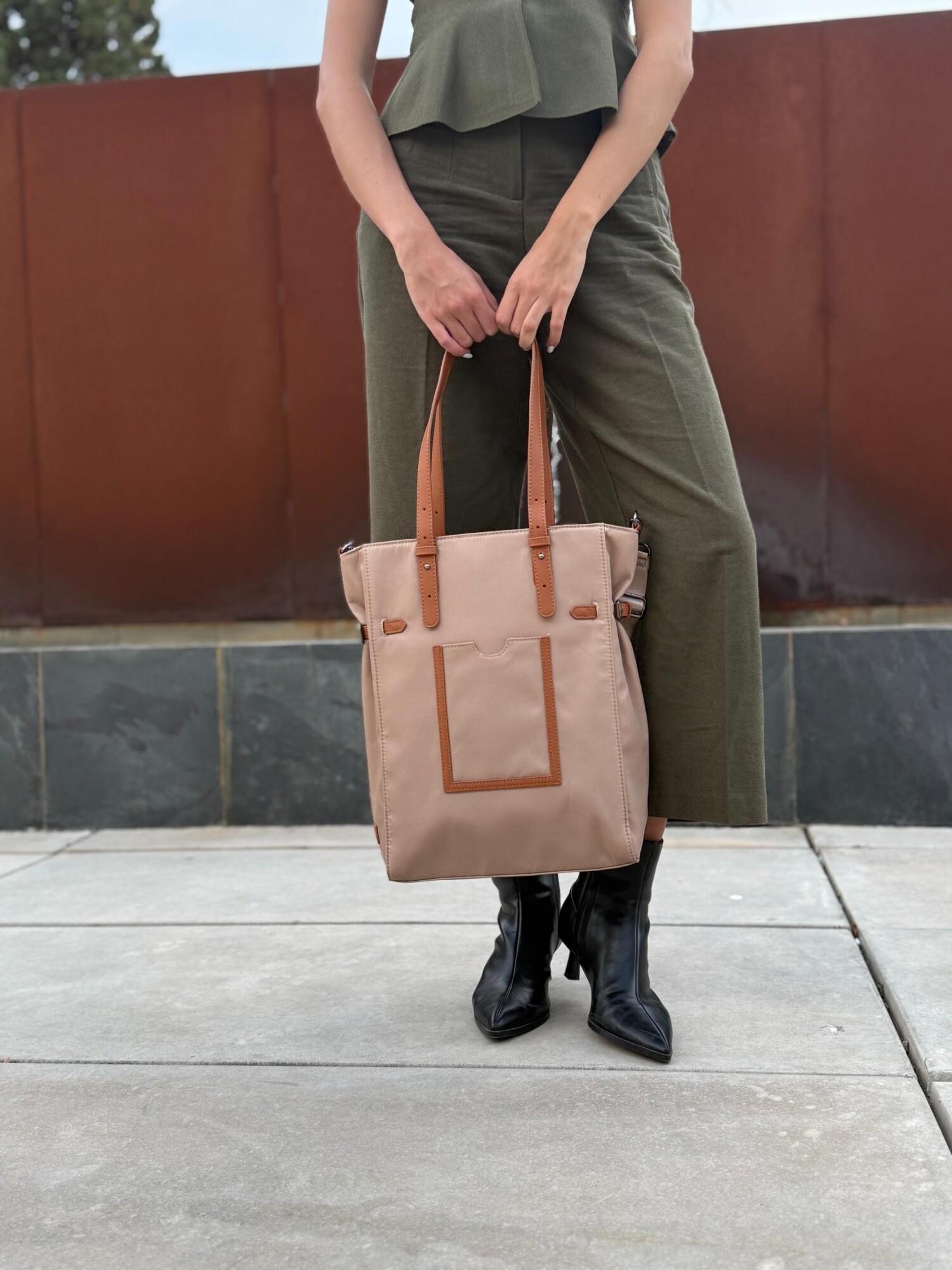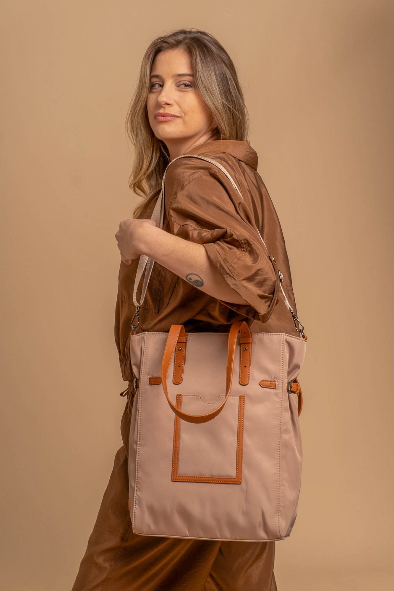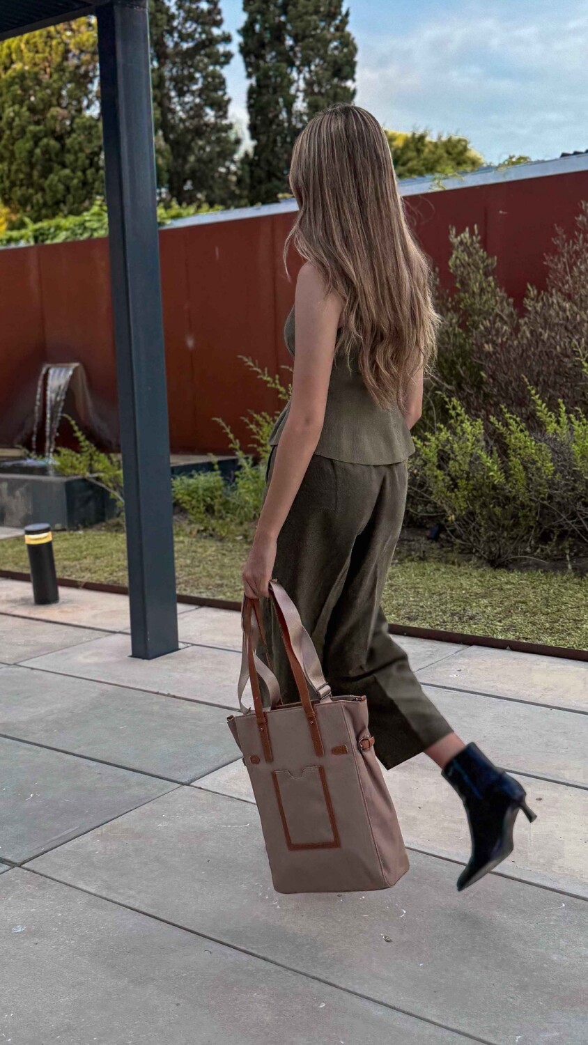 Bandolera elegante. Cuenta con asas dobles, correa ajustable y bolsillo frontal. Ideal para uso diario gracias a su diseño funcional y moderno.