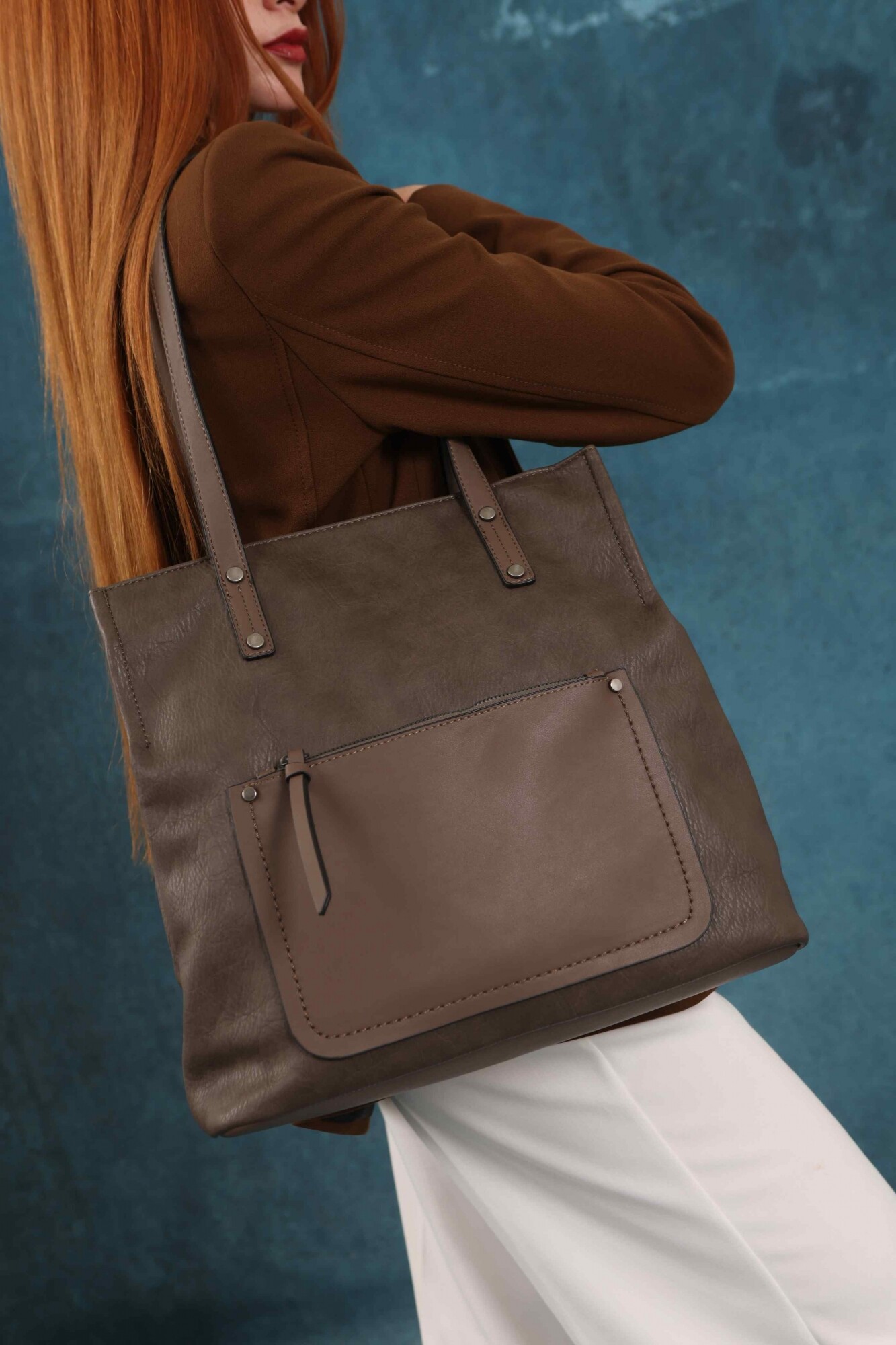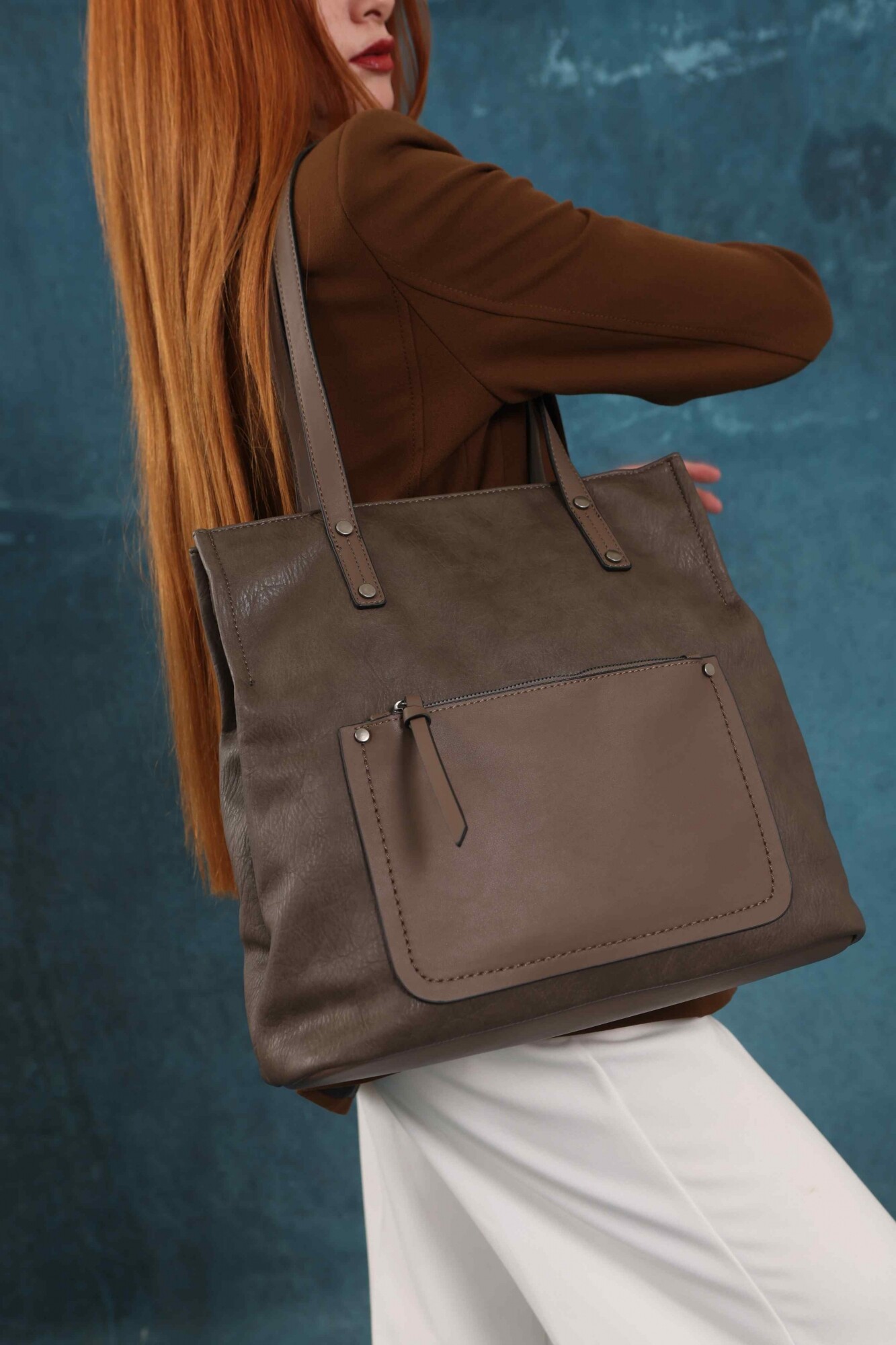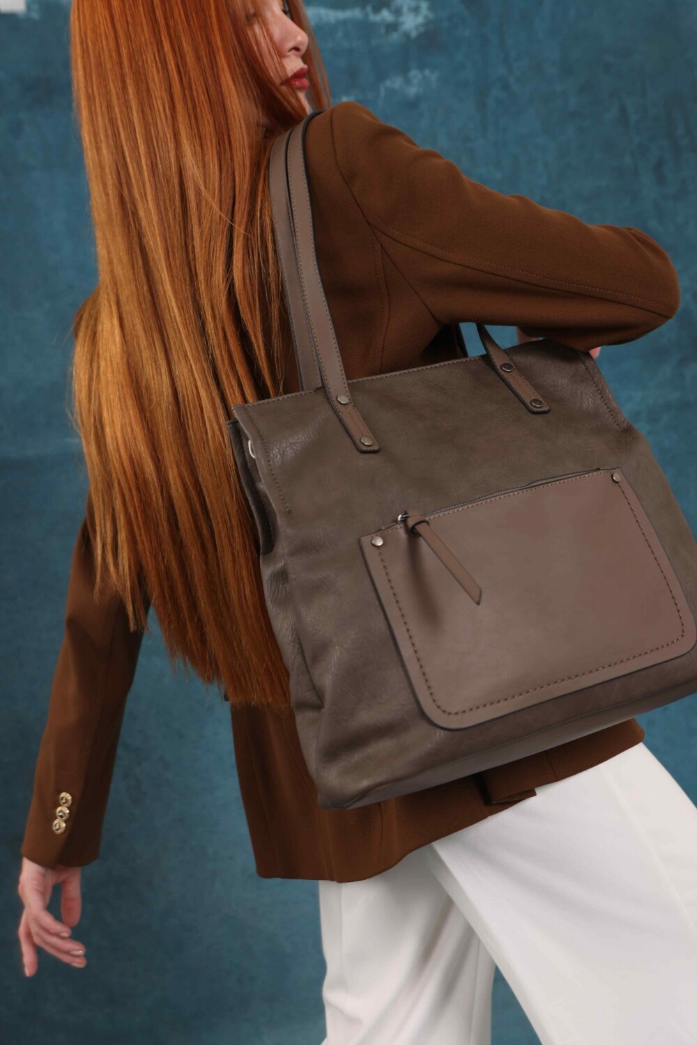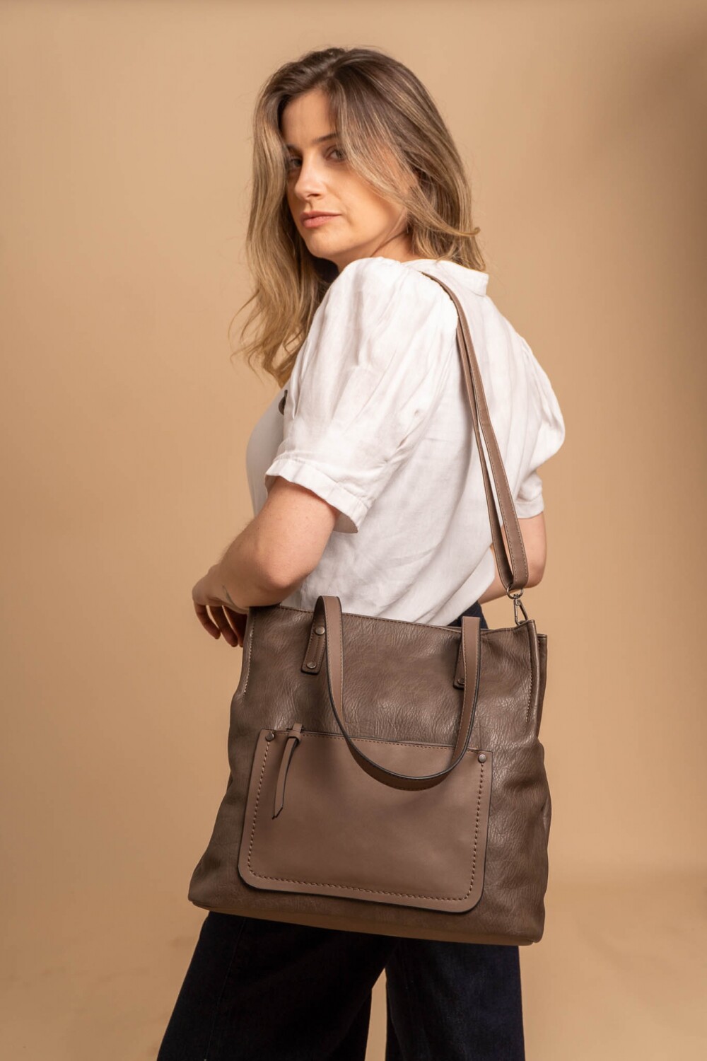 Cartera bandolera grande con dos asas cortas y una correa larga regulable. Cuenta con dos divisiones internas y un bolsillo frontal con cierre. Diseño práctico y elegante, ideal para el uso diario.