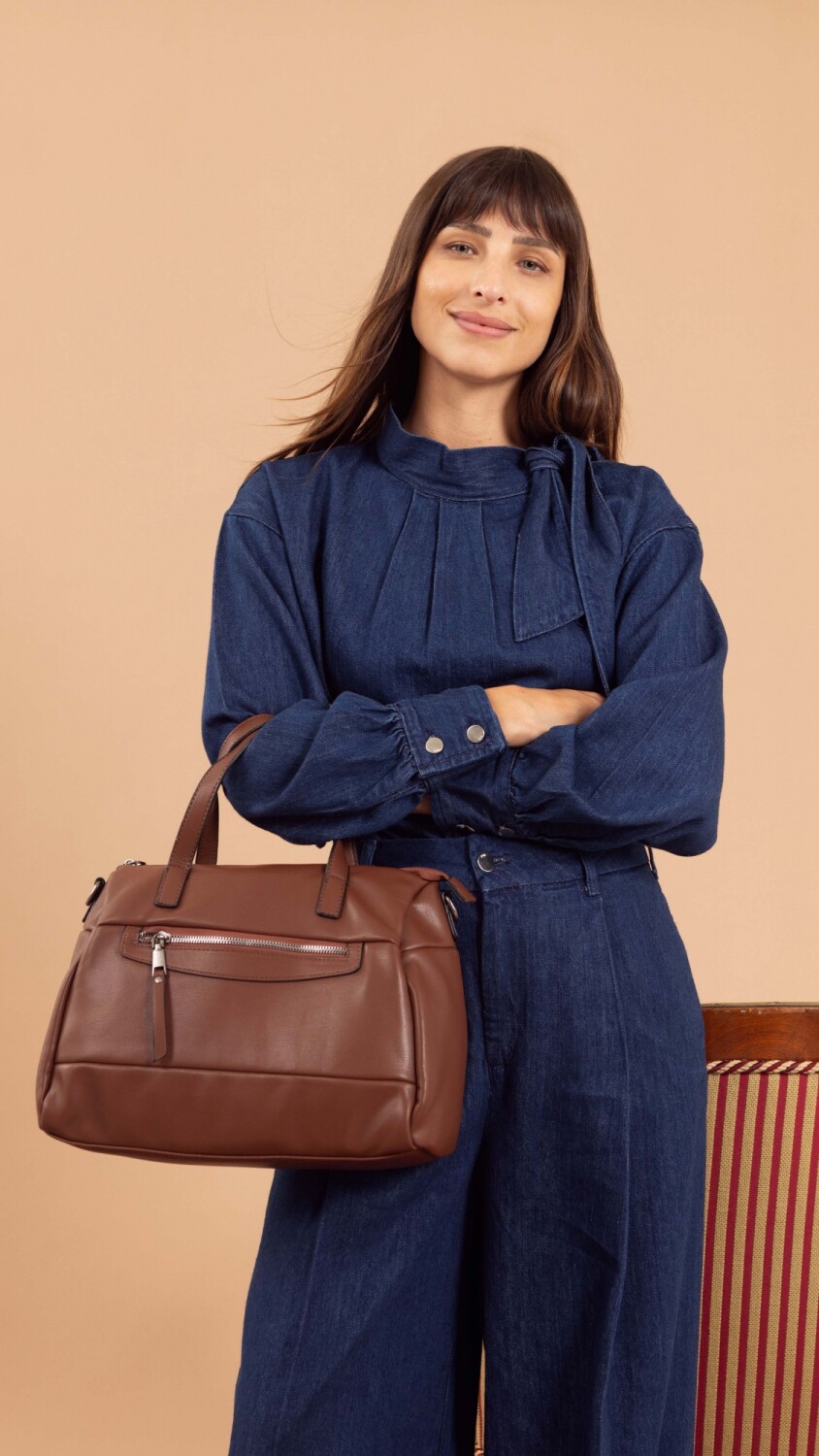 Cartera de correa corta con cierre principal, bolsillos interiores y exteriores en la parte delantera y trasera. Incluye correa larga ajustable para mayor comodidad y versatilidad en el uso diario.