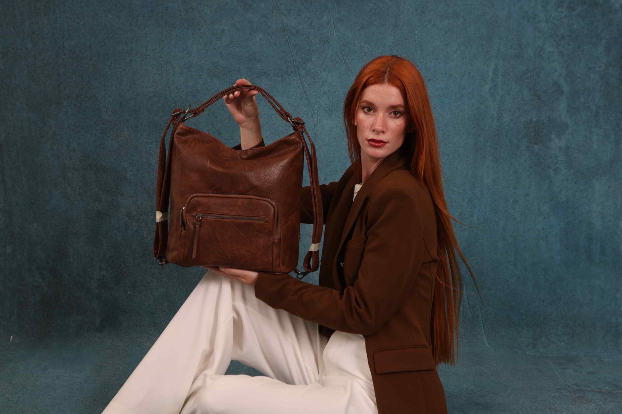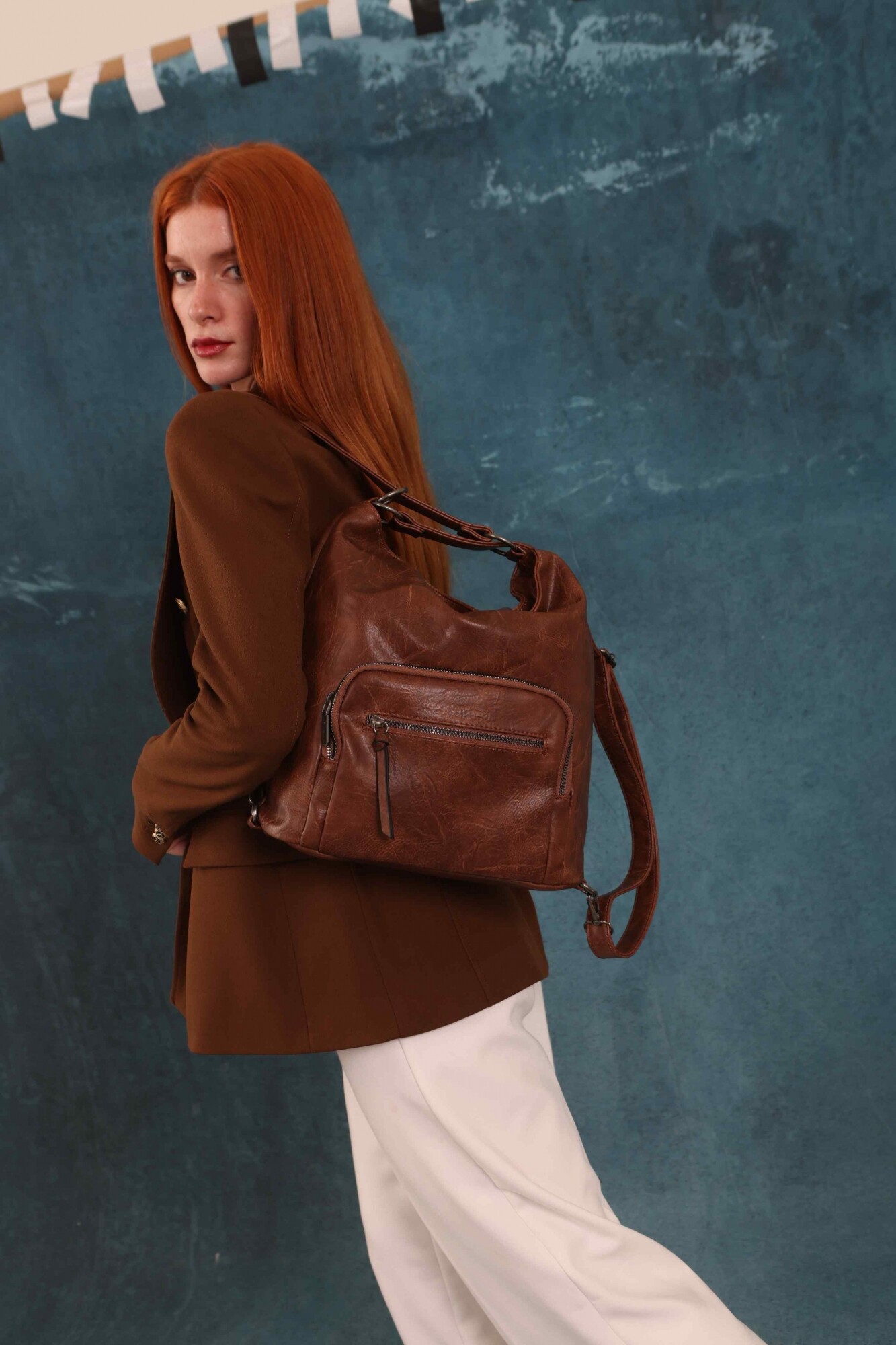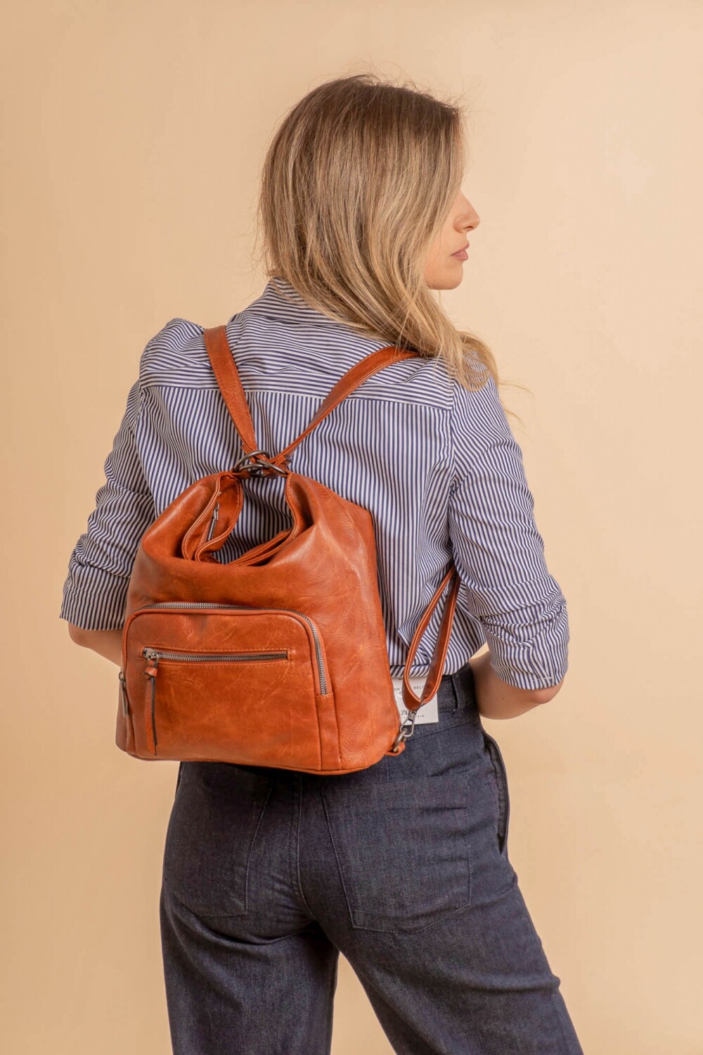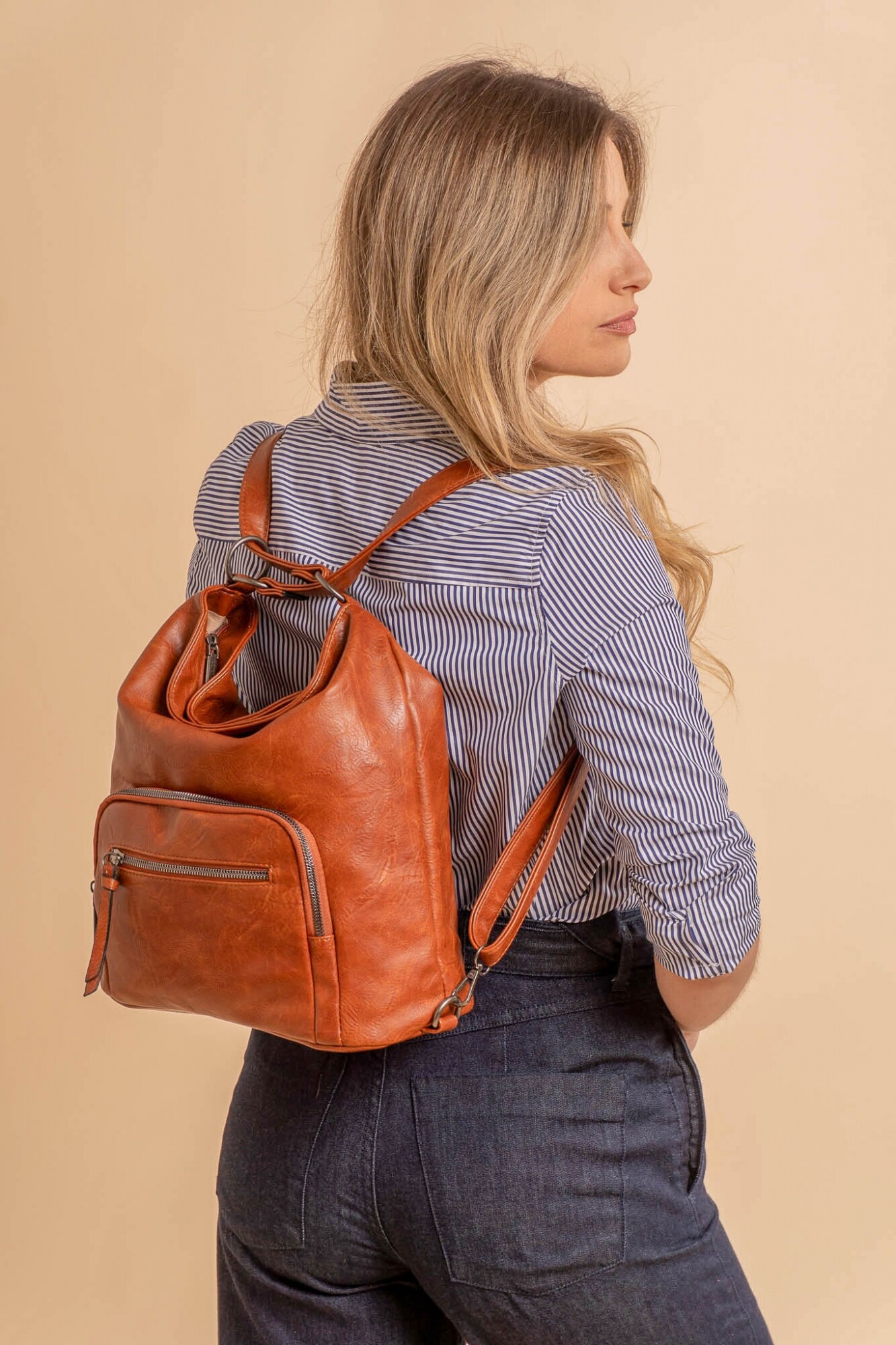 Cartera mochila símil cuero, practica y versátil. Con compartimiento principal amplio y bolsillos frontales con cierre para mayor organización. Correas ajustables y asa superior para llevar al hombro o como una mochila . ideal para uso diario.
