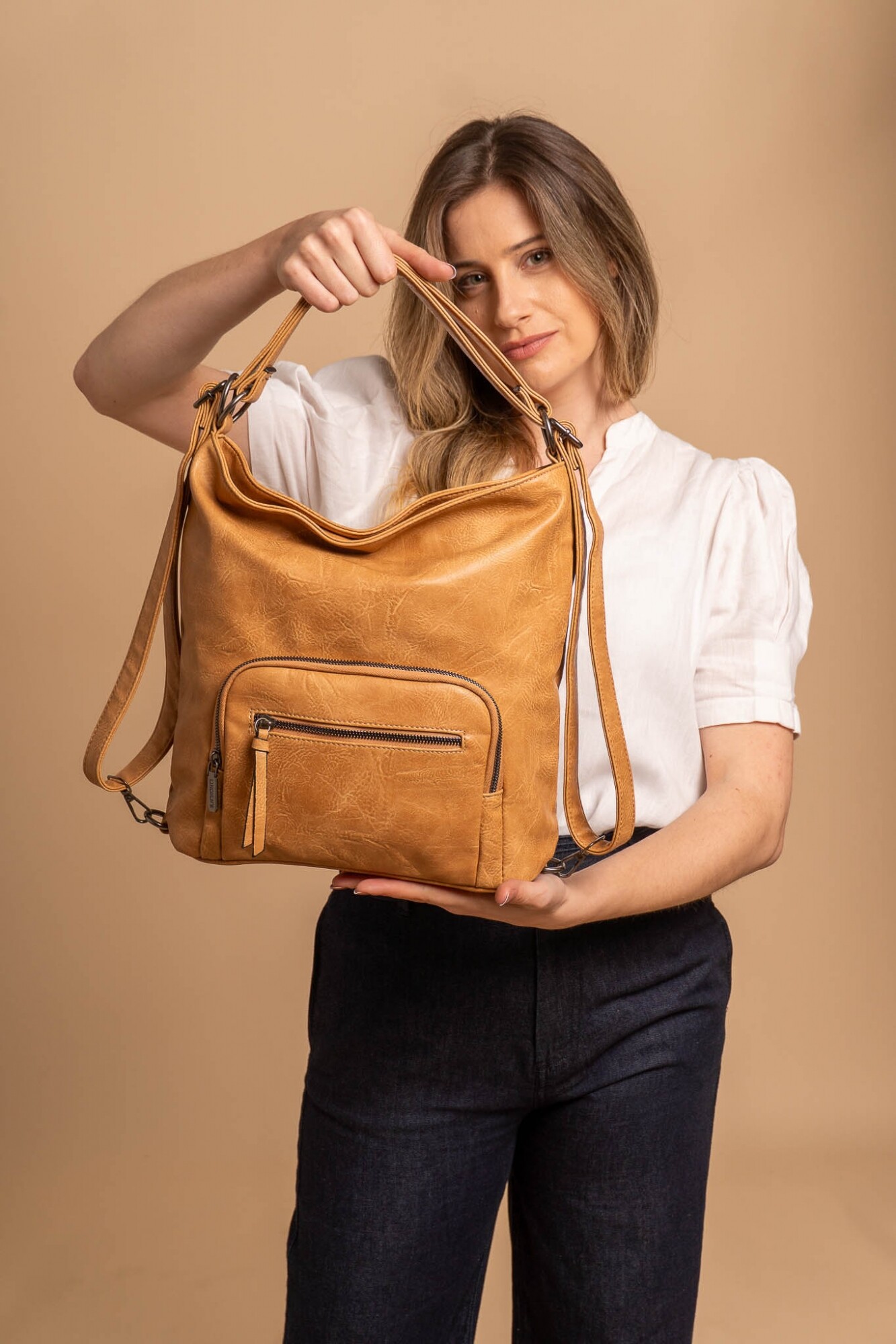 Cartera mochila símil cuero, practica y versátil. Con compartimiento principal amplio y bolsillos frontales con cierre para mayor organización. Correas ajustables y asa superior para llevar al hombro o como una mochila . ideal para uso diario.