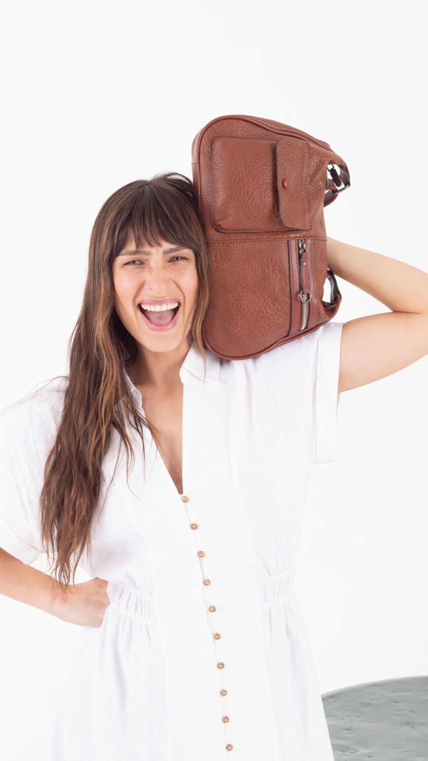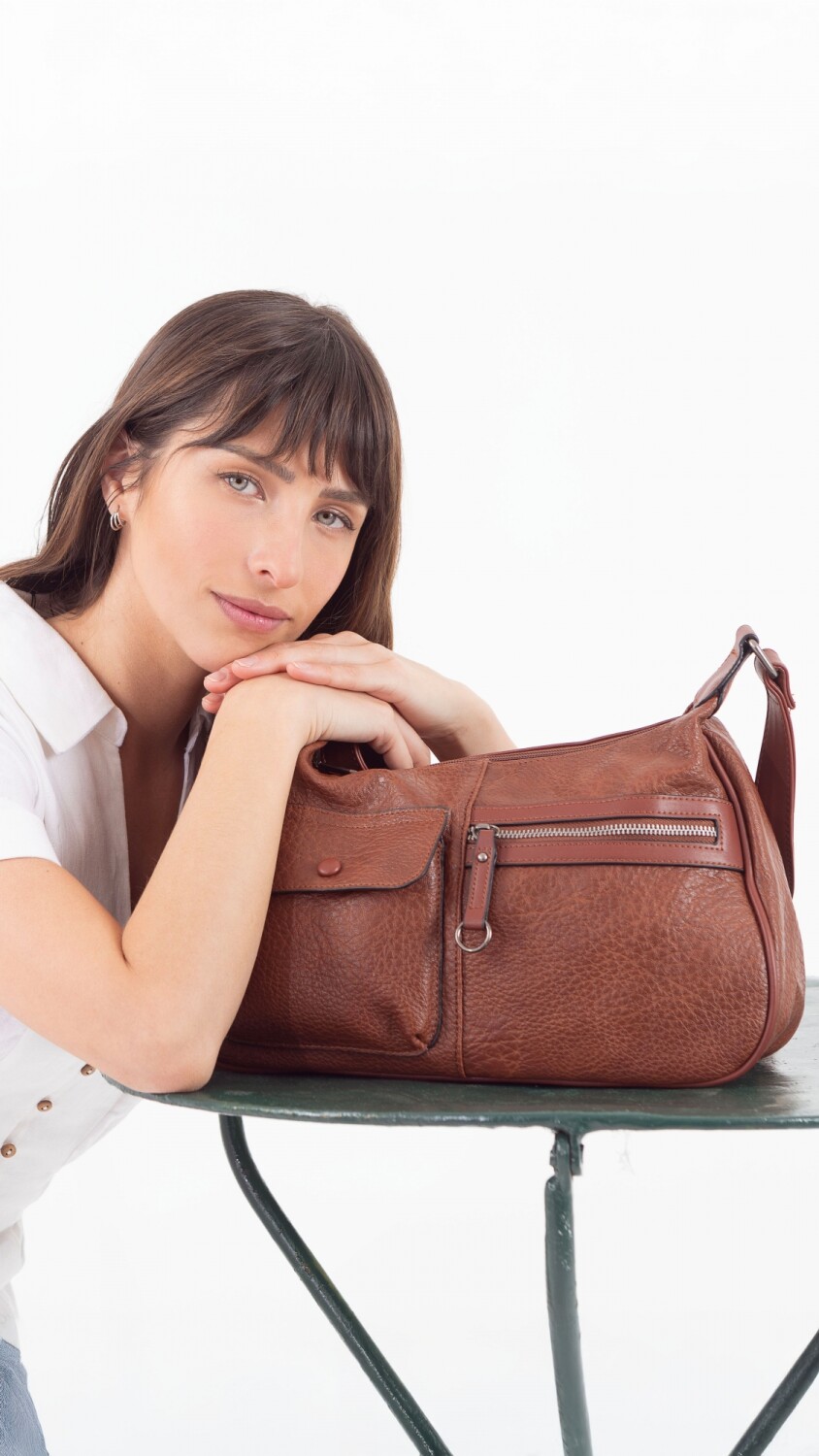Cartera práctica con dos cierres principales y un cierre posterior. Cuenta con dos bolsillos frontales: uno con botón y otro con cierre. Incluye correa extensible para mayor comodidad y ajuste.