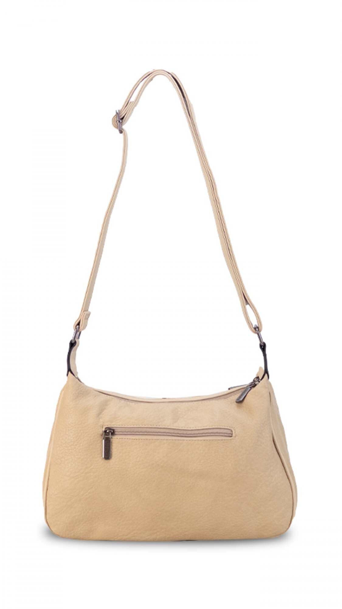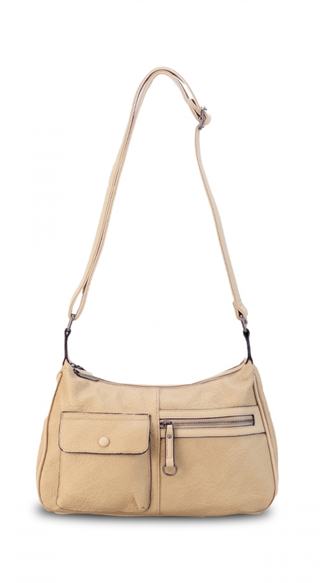 Cartera práctica con dos cierres principales y un cierre posterior. Cuenta con dos bolsillos frontales: uno con botón y otro con cierre. Incluye correa extensible para mayor comodidad y ajuste.