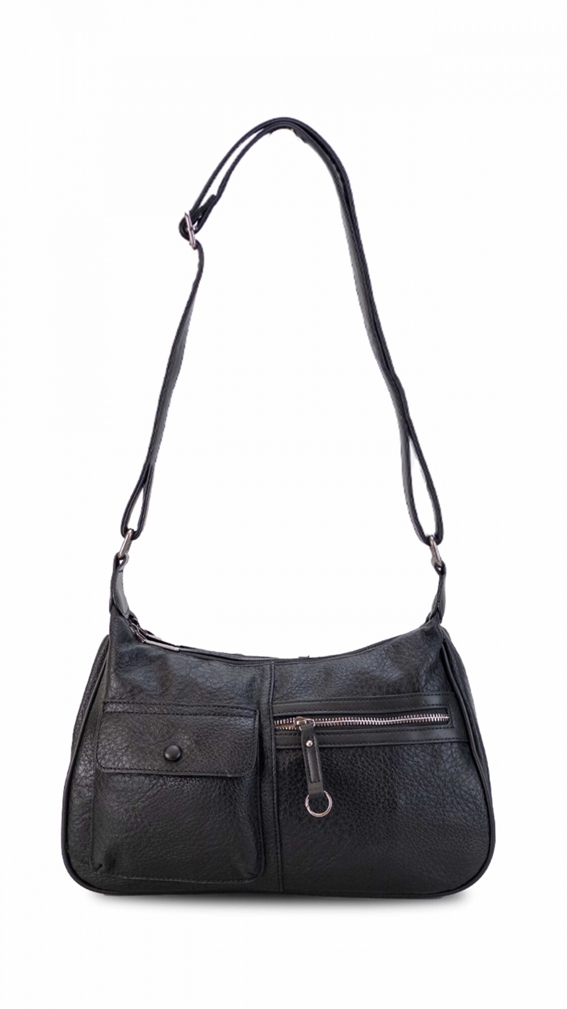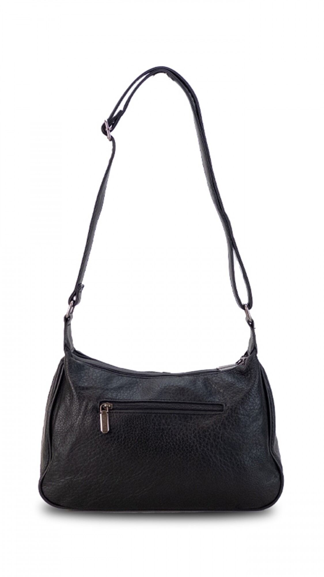 Cartera práctica con dos cierres principales y un cierre posterior. Cuenta con dos bolsillos frontales: uno con botón y otro con cierre. Incluye correa extensible para mayor comodidad y ajuste.