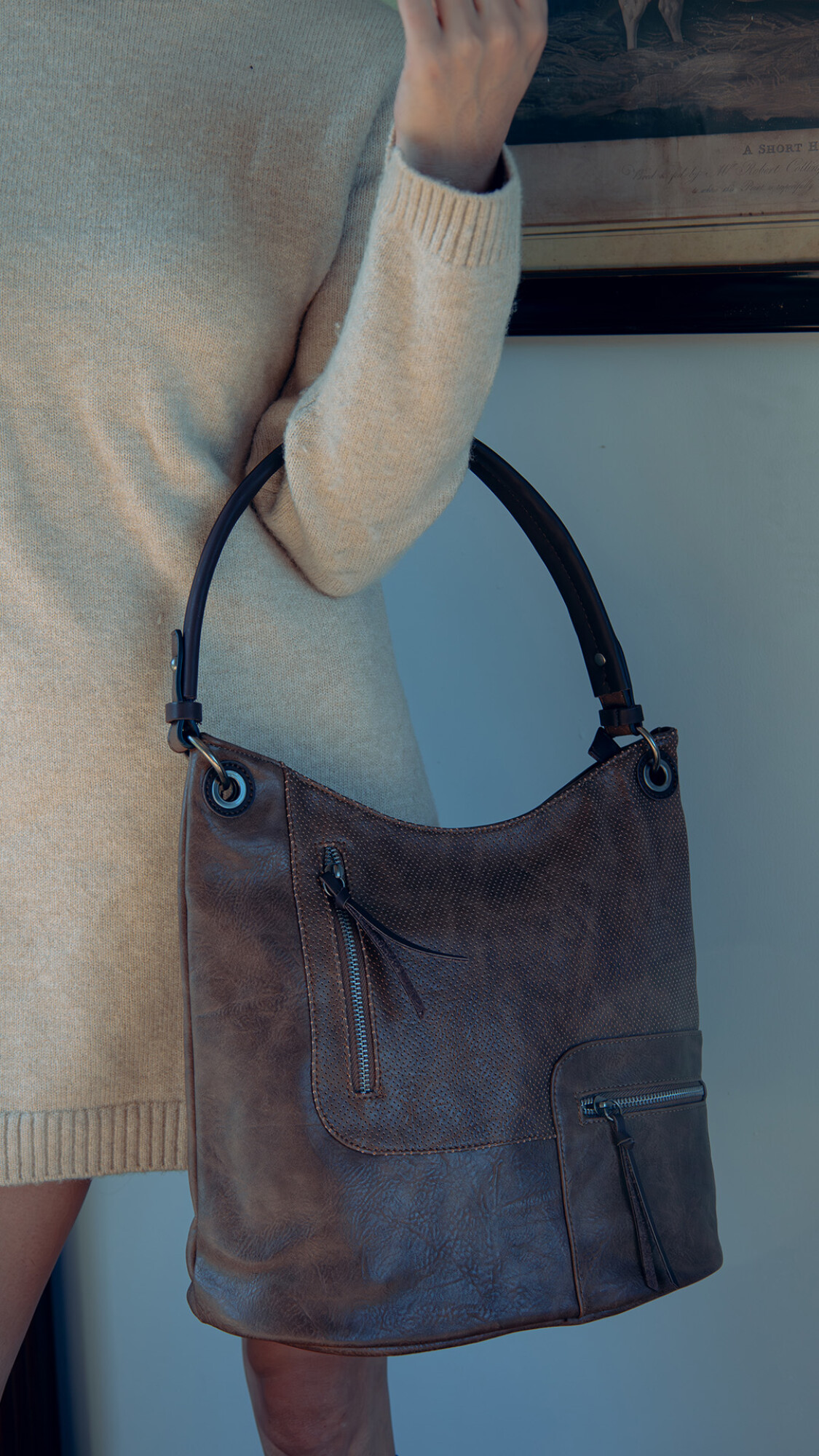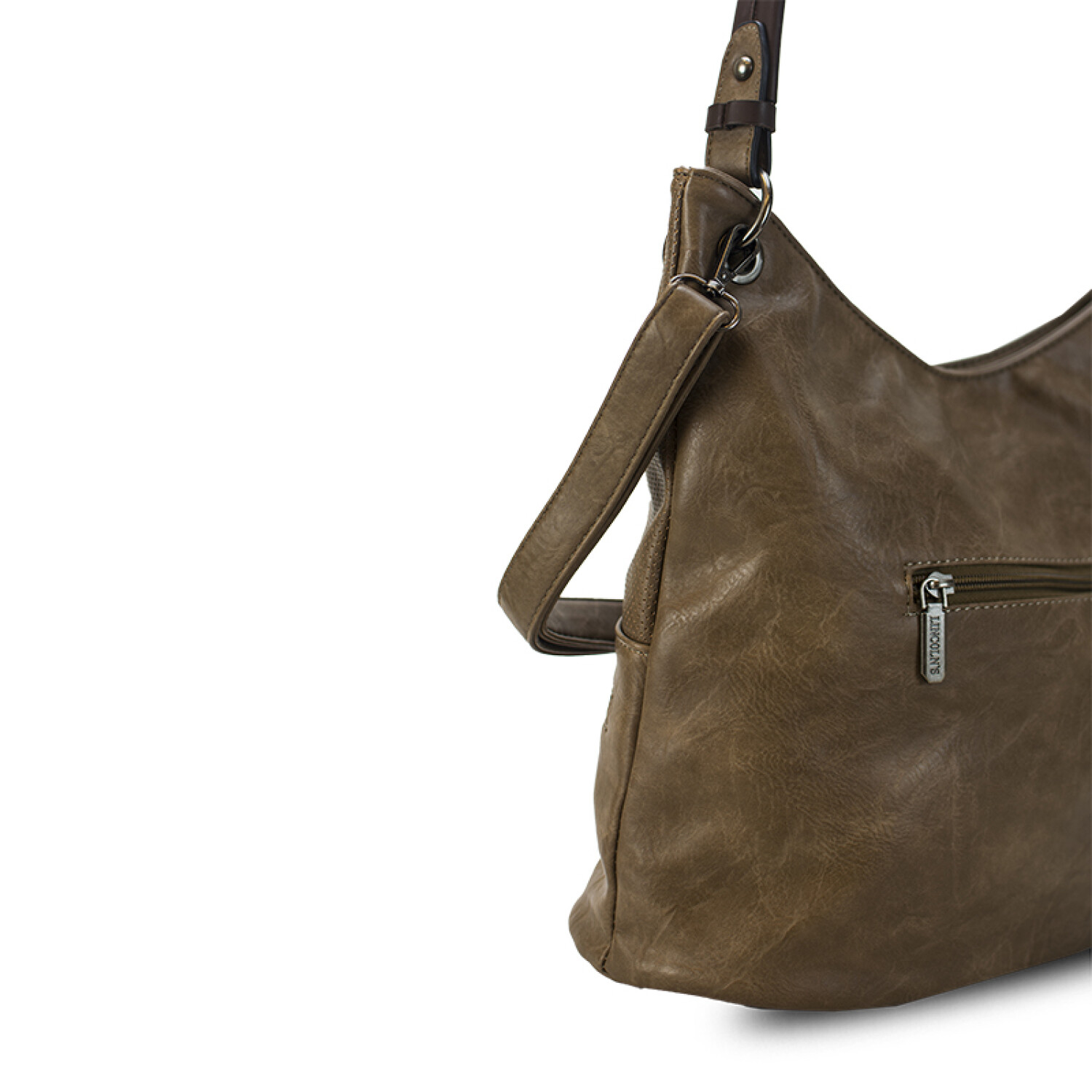 Cartera con detalle de calado y apertura superior con cierre y dos bolsillos con cierre metálico al frente. Bolsillo atrás con cierre. Incluye división al medio y bolsillos internos. Correa corta para el hombro y correa larga desmontable y regulable.