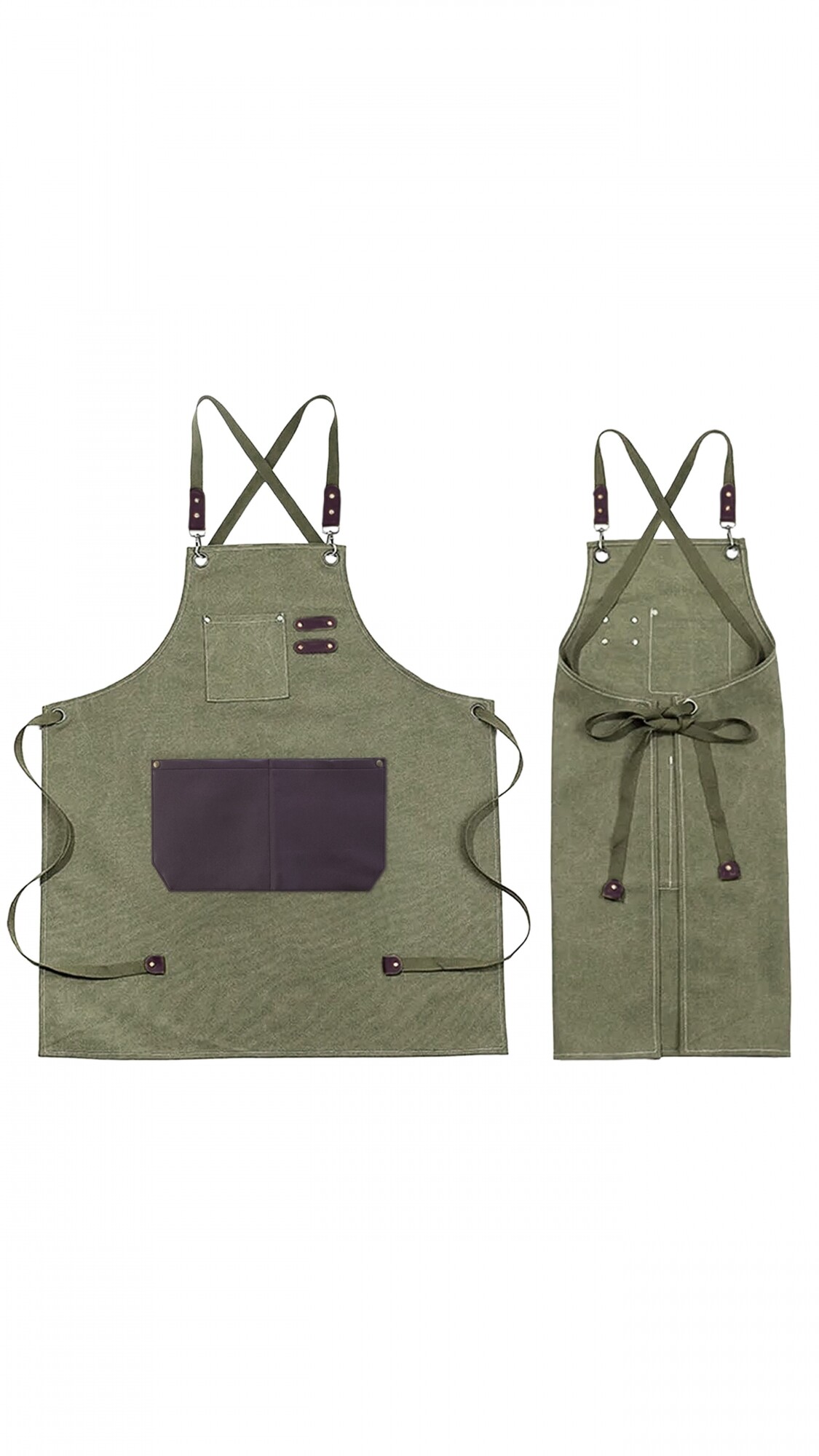 Delantal en tela Canvas, diseño cruzado en la espalada para mayor comodidad. tiras en algodón con detalles en símil cuero y herrajes metálicos. Amplio bolsillo frontal cambiando. Ideal para la parrilla.