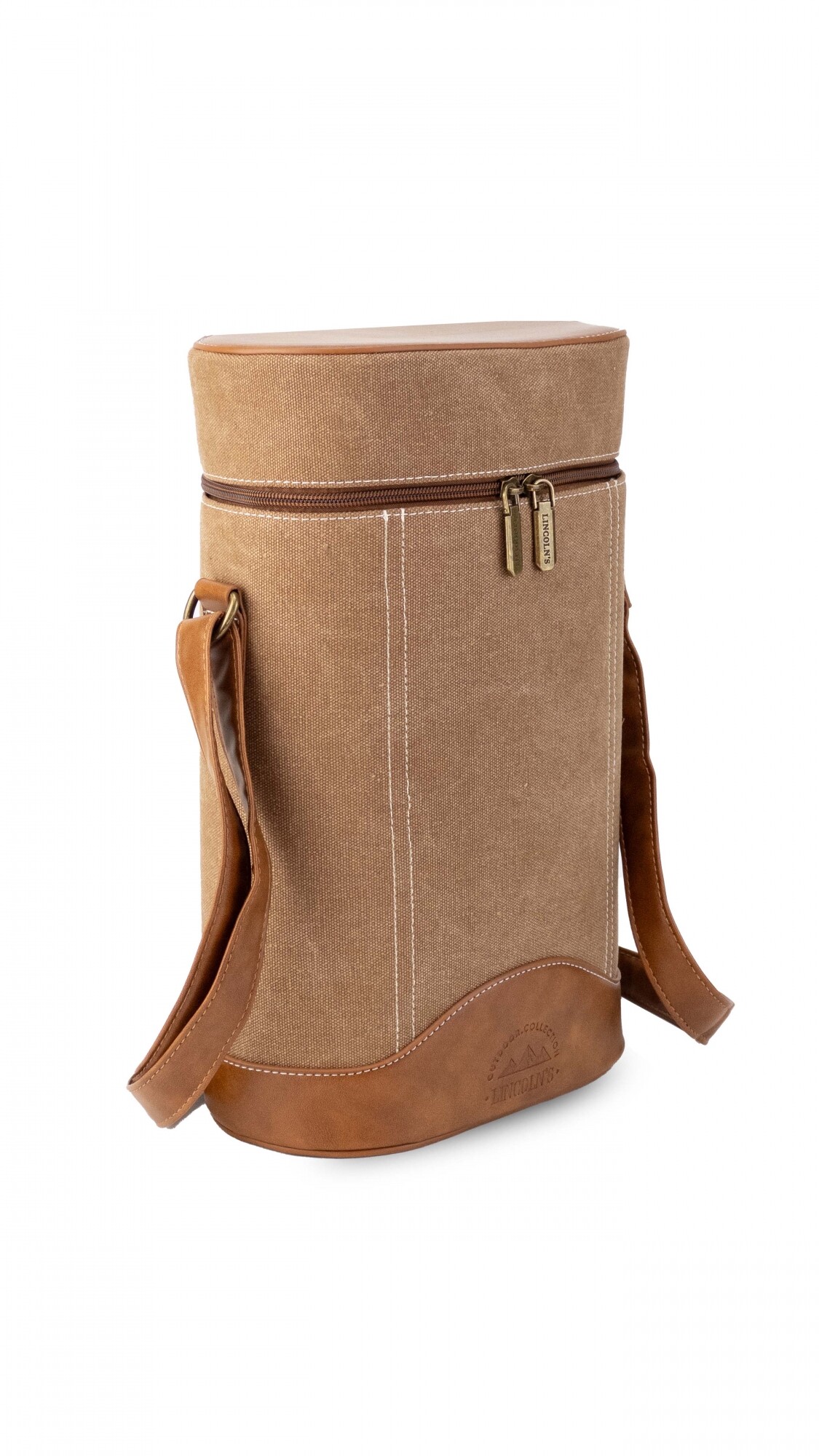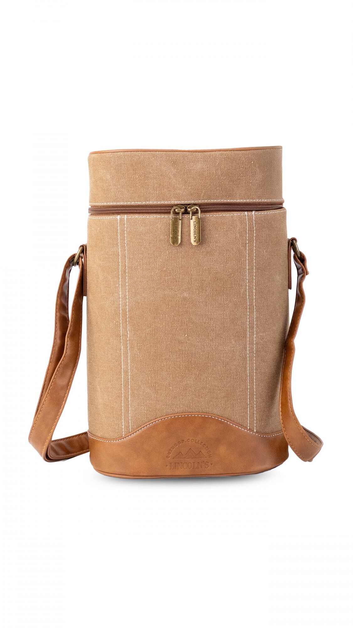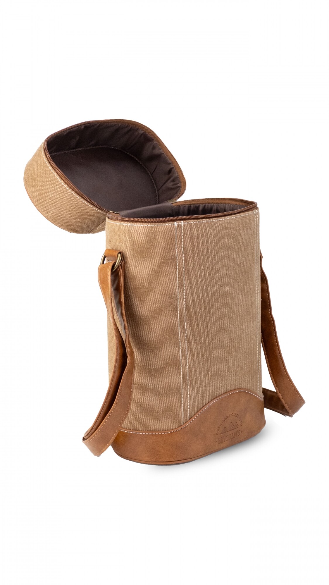 Matera con tapa y cierre combinada en tela y detalle en símil cuero. Cuenta con una división en el medio y una practica correa ajustable para llevar al hombro.