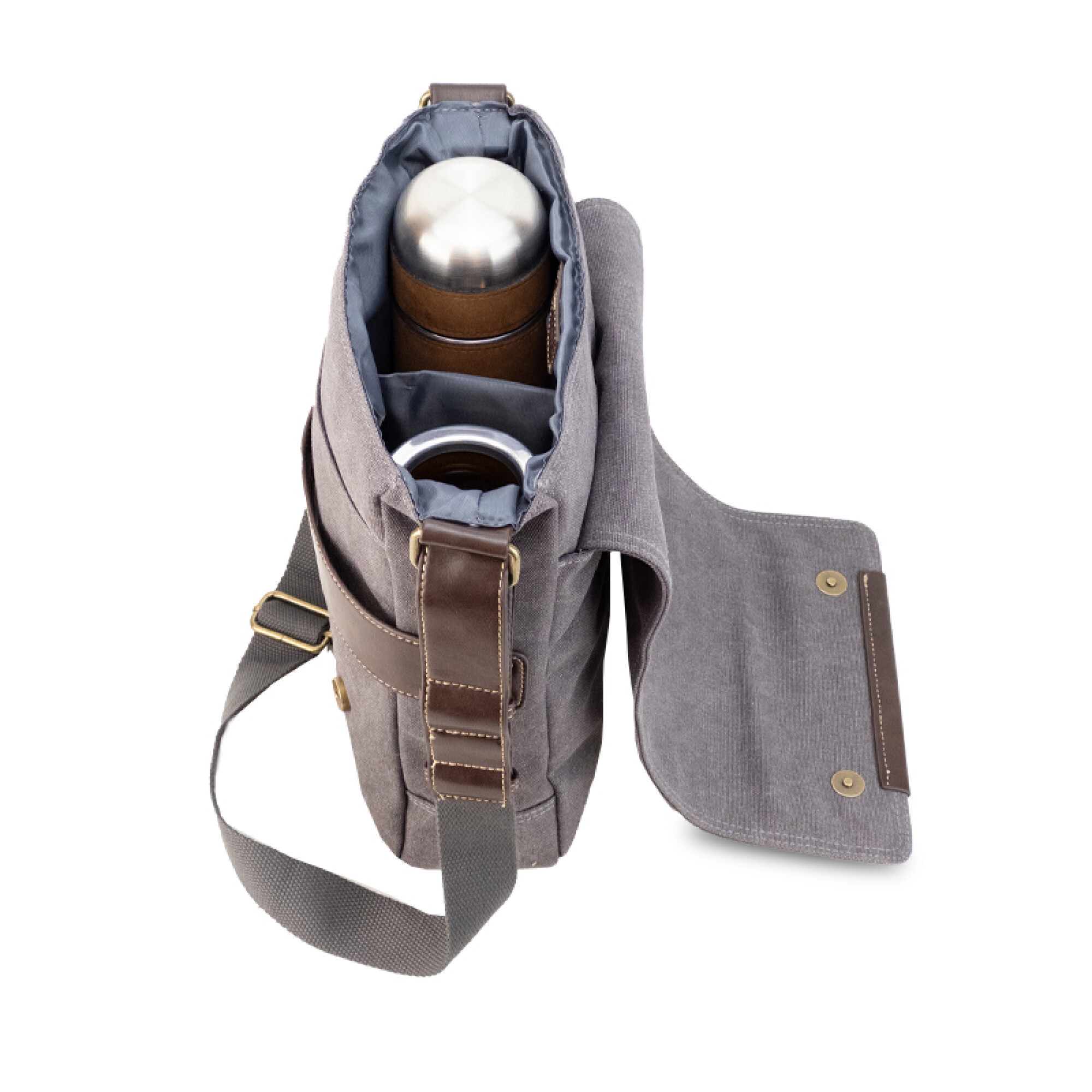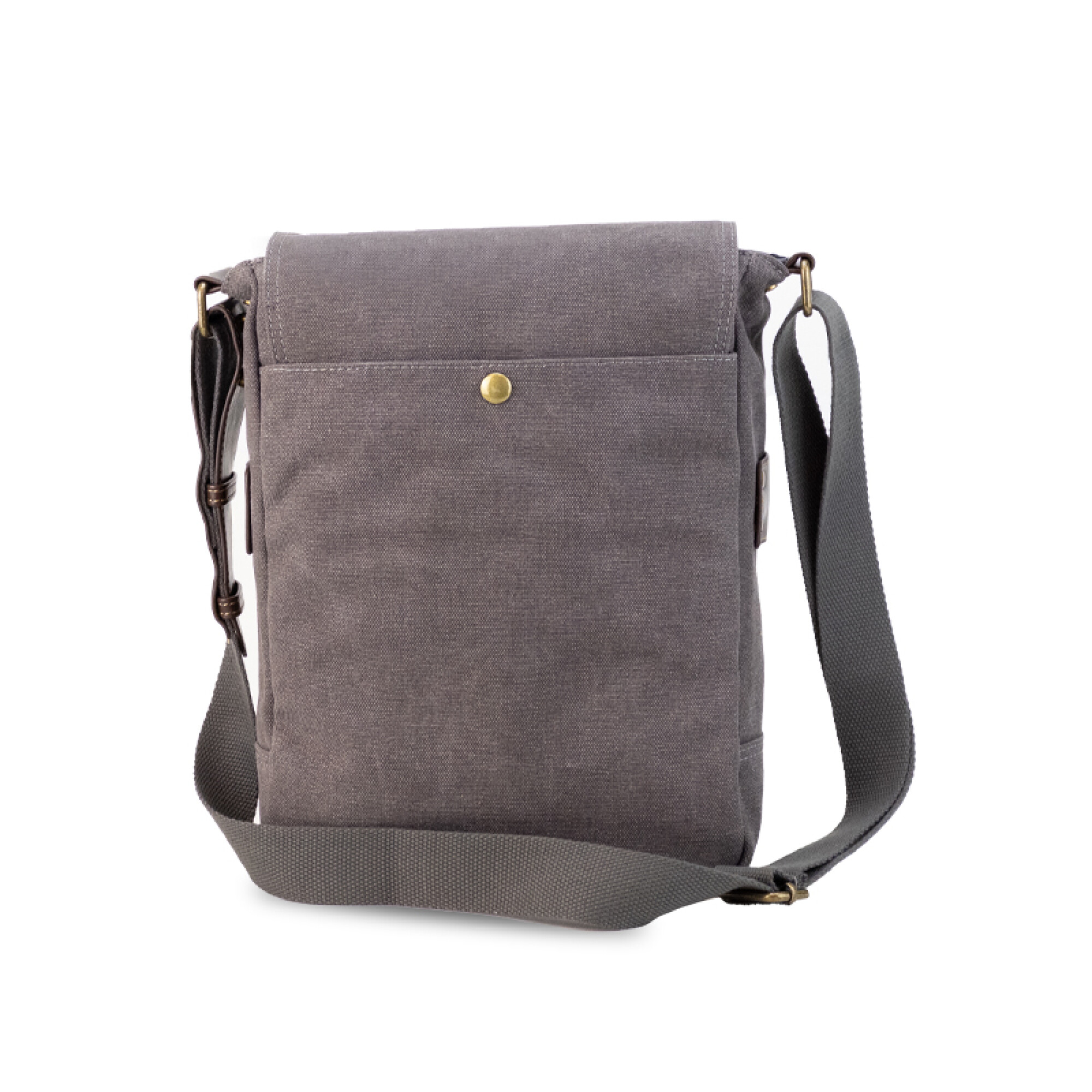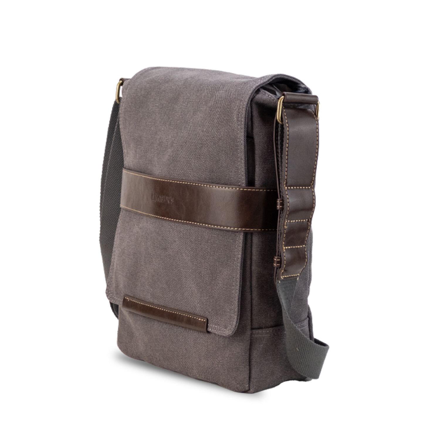 Matera canvas combinada con símil cuero. Tapa y broches magnéticos con bolsillo tipo guantera bajo la tapa. División al medio con velcro para desmontar y usar como morral. Bolsillo con broche magnético atrás. Correa larga regulable.