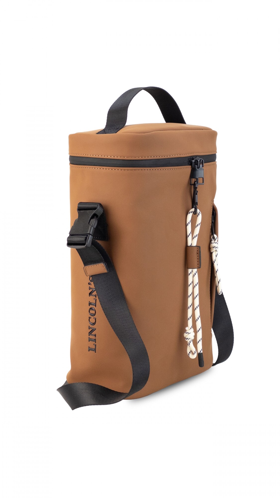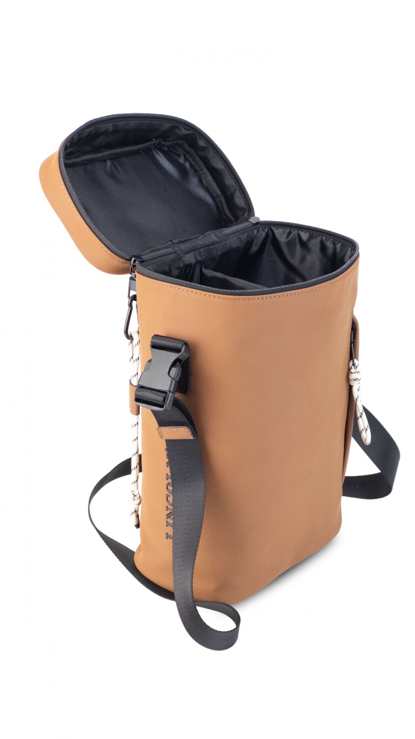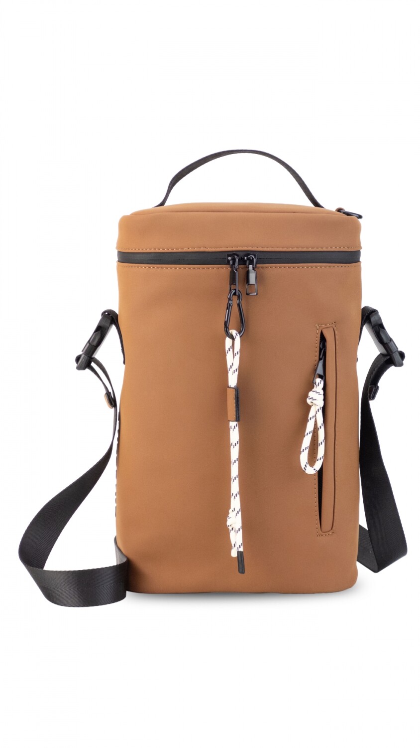 Matera en tela tipo neopreno, resistente y liviana. Su interior es forrado con división para mejor organización. Cuenta con cierre superior y asa de mano, bolsillo lateral con cierre y detalles en cordón. La correa es regulable para llevar cómodamente.