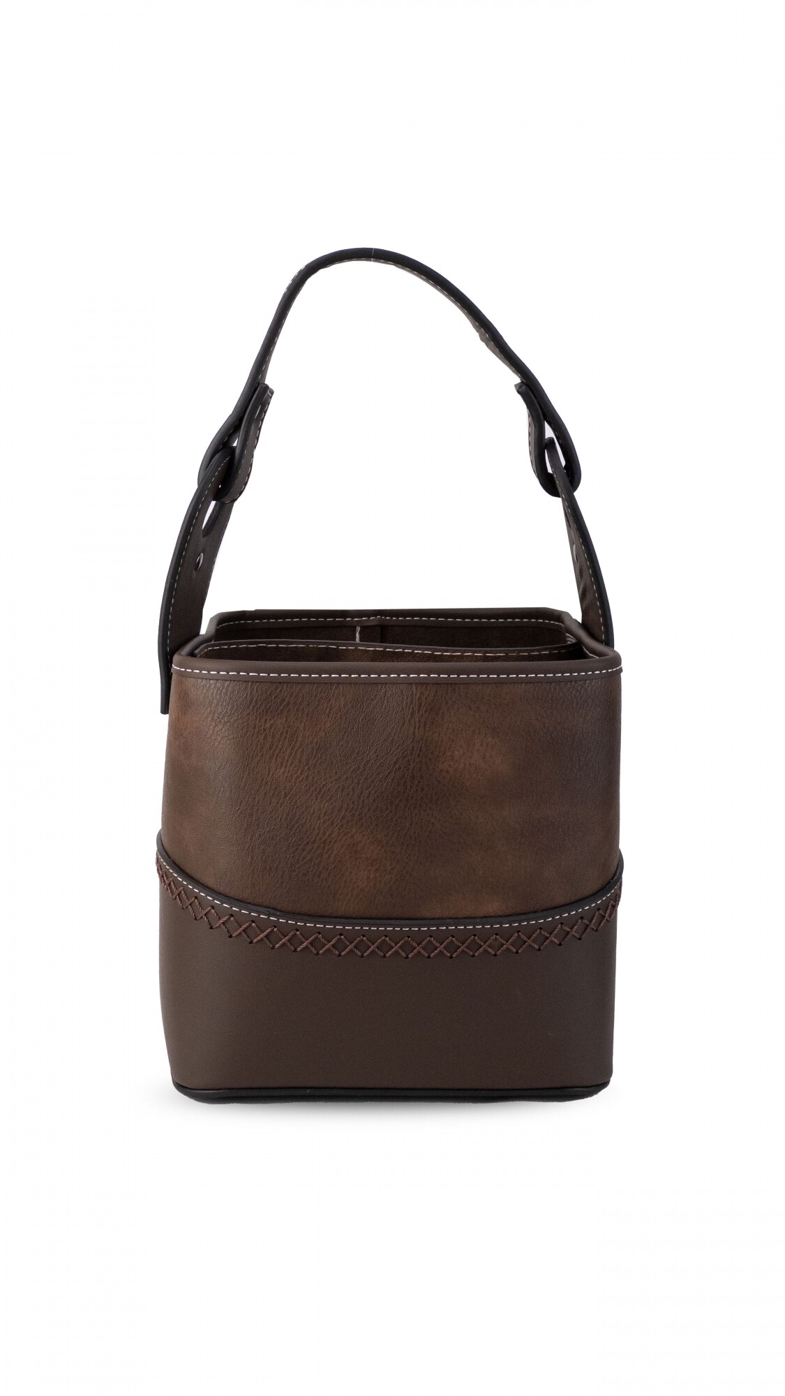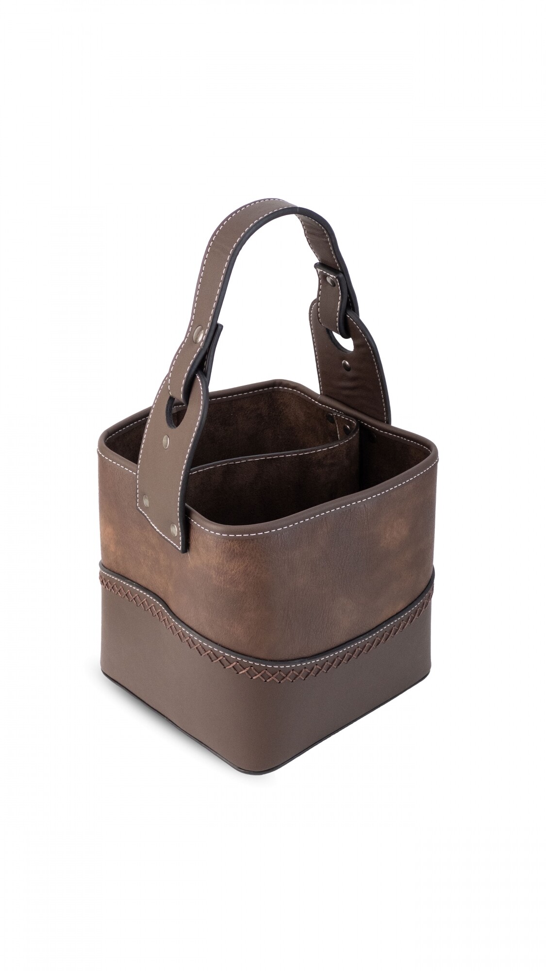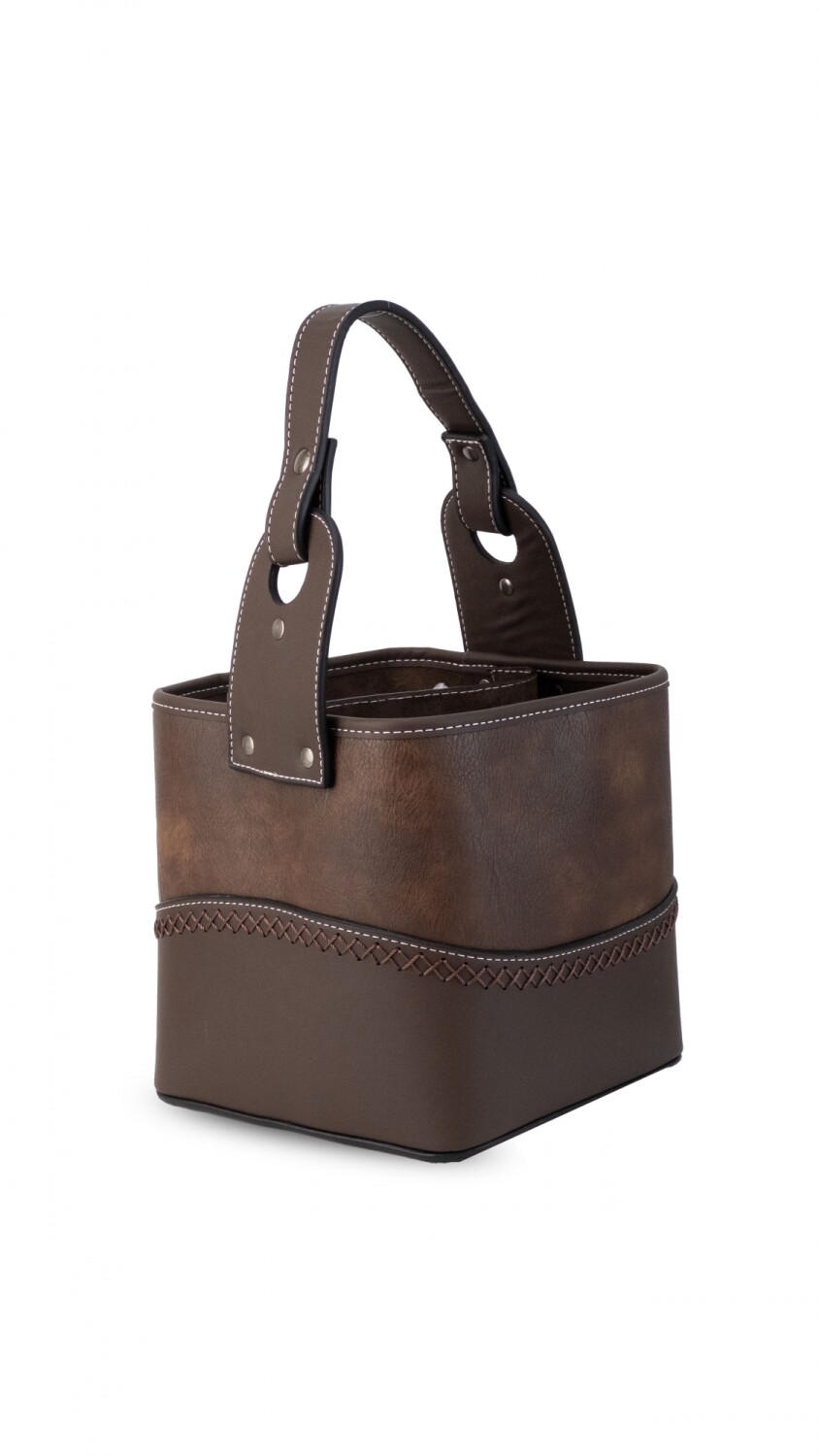 Posa termo matera reforzada en símil cuero. Diseño elegante y funcional con costuras visibles, base firme y detalle trenzado decorativo. Ideal para transportar termo y mate con estilo.