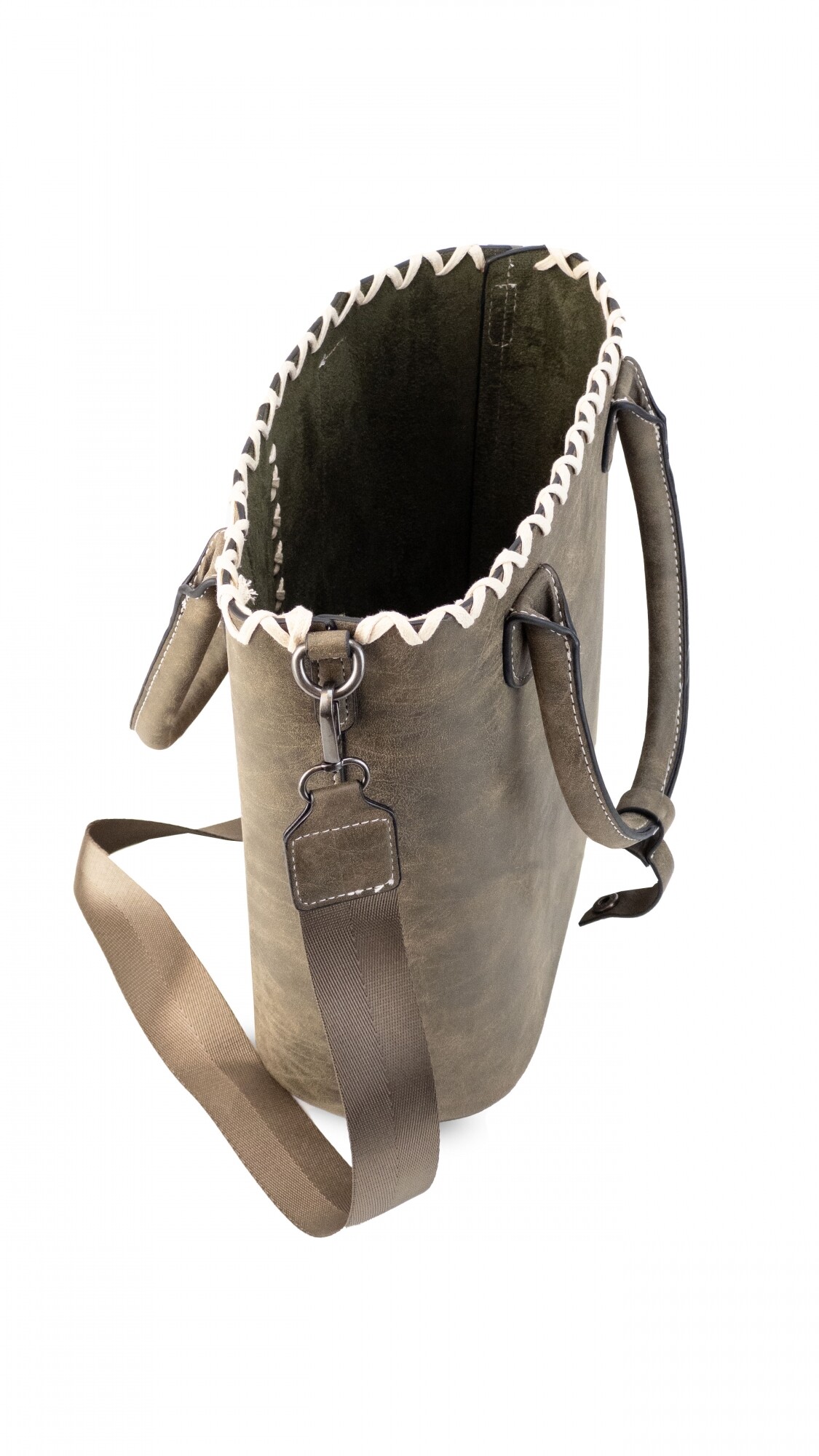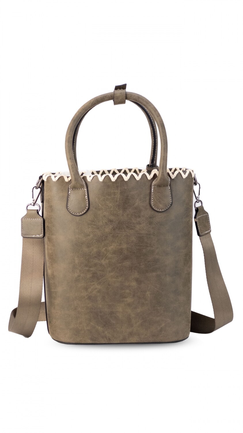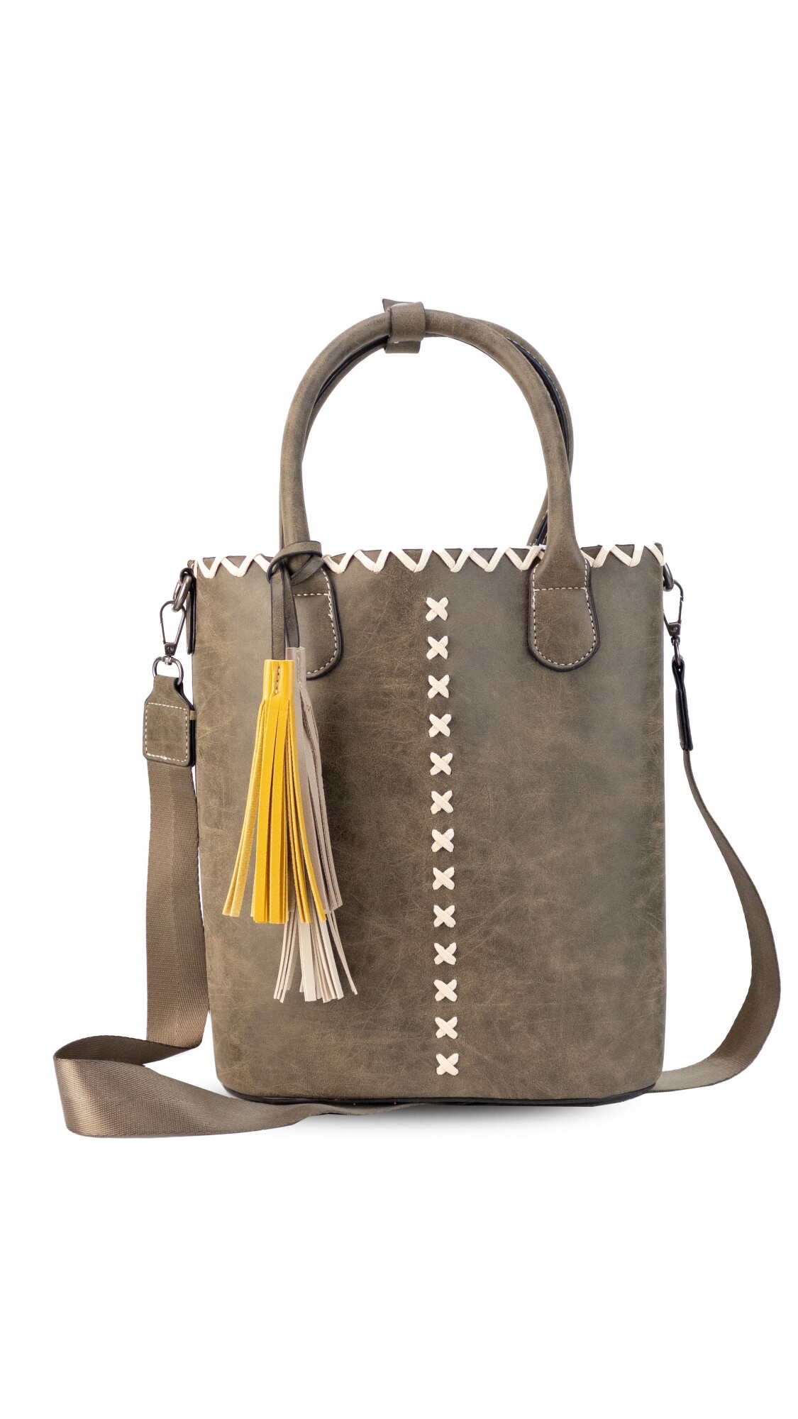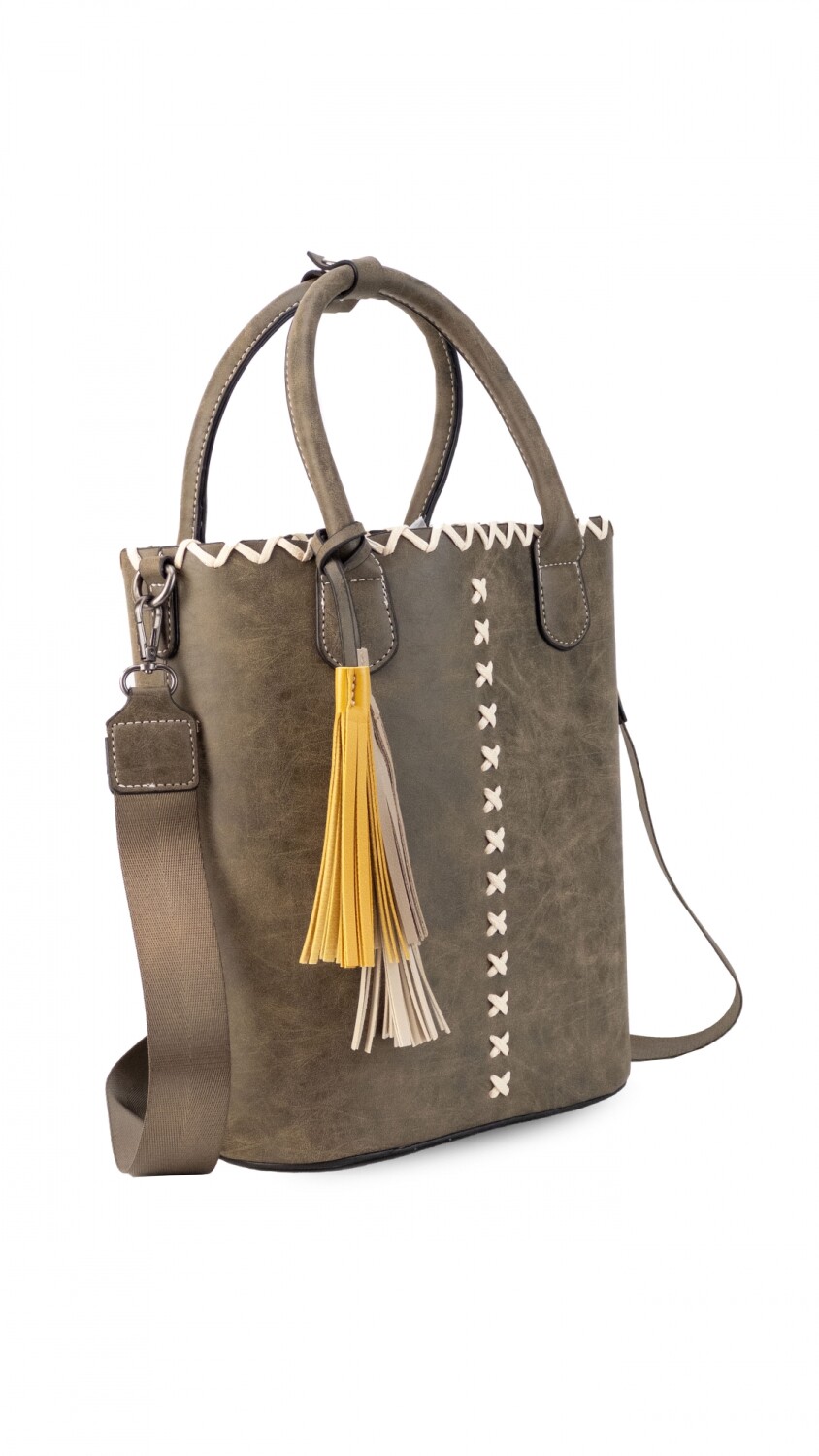 Matera en símil cuero, con costuras cruzadas decorativas y flecos multicolor. Incluye correa regulable y manijas reforzadas. Diseño moderno, resistente y con terminaciones artesanales de calidad.