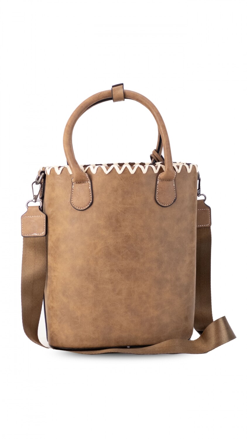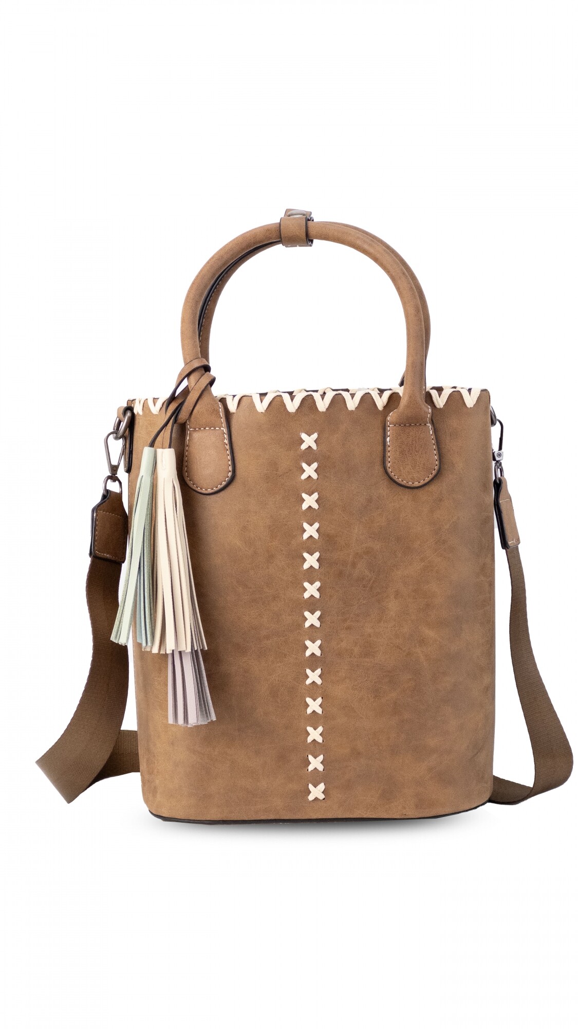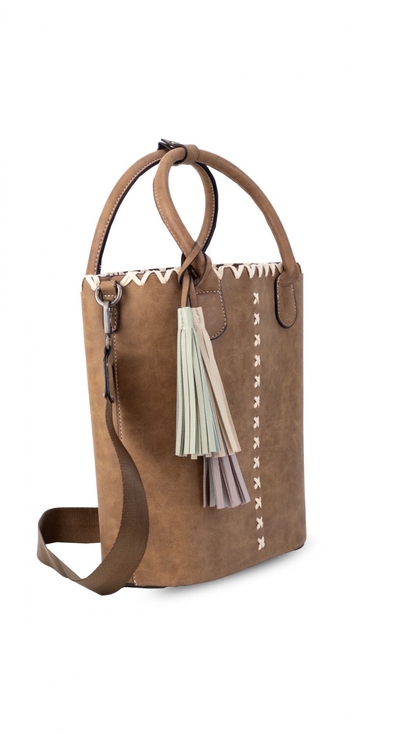 Matera en símil cuero, con costuras cruzadas decorativas y flecos multicolor. Incluye correa regulable y manijas reforzadas. Diseño moderno, resistente y con terminaciones artesanales de calidad.