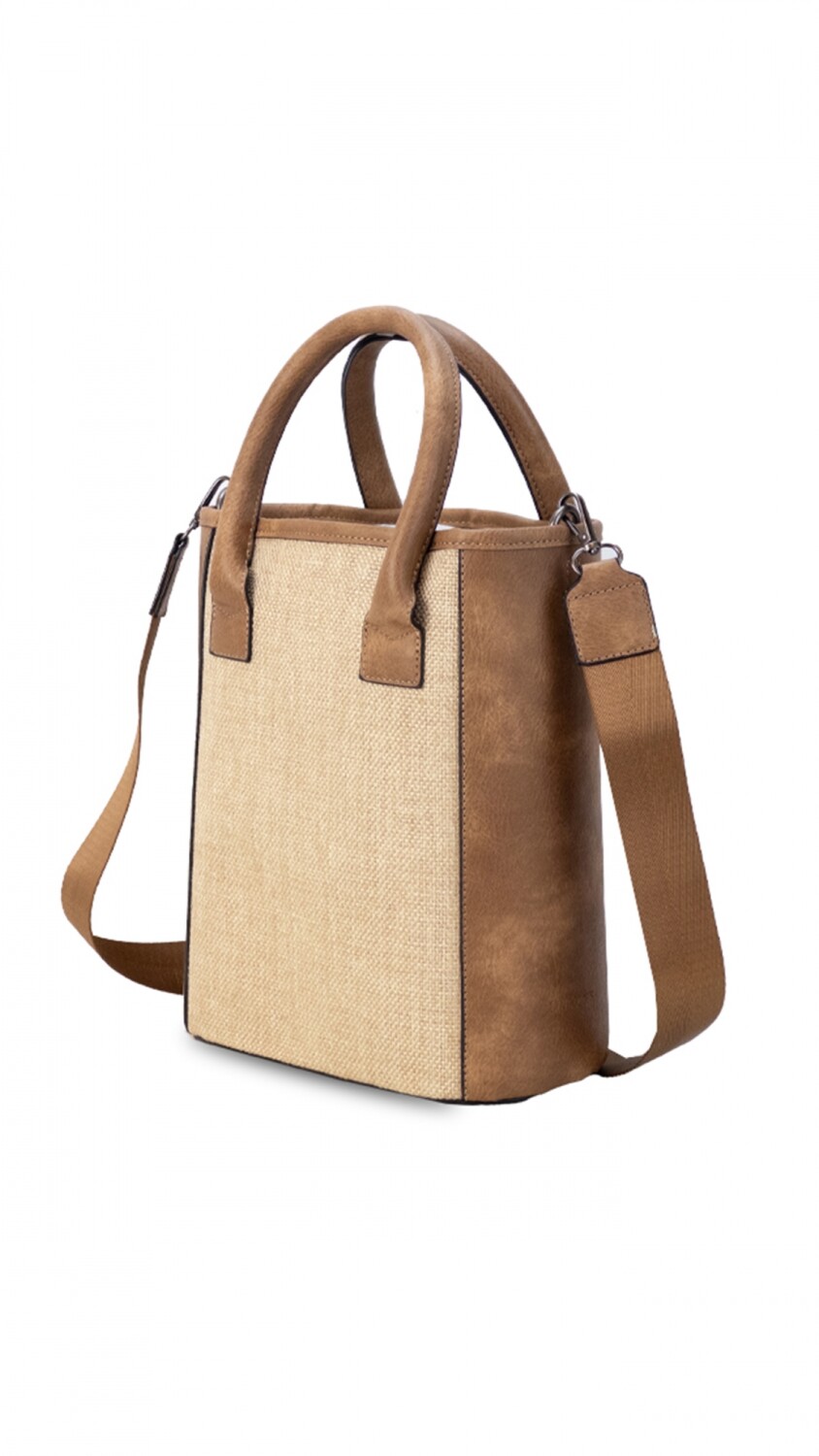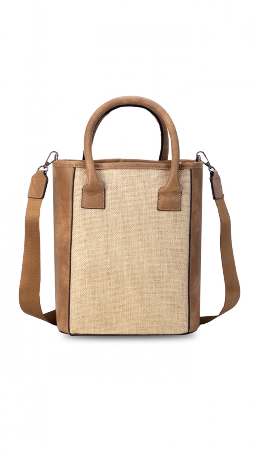 Matera con diseño frontal en telar rayado y liso, ofreciendo un toque único y artesanal.