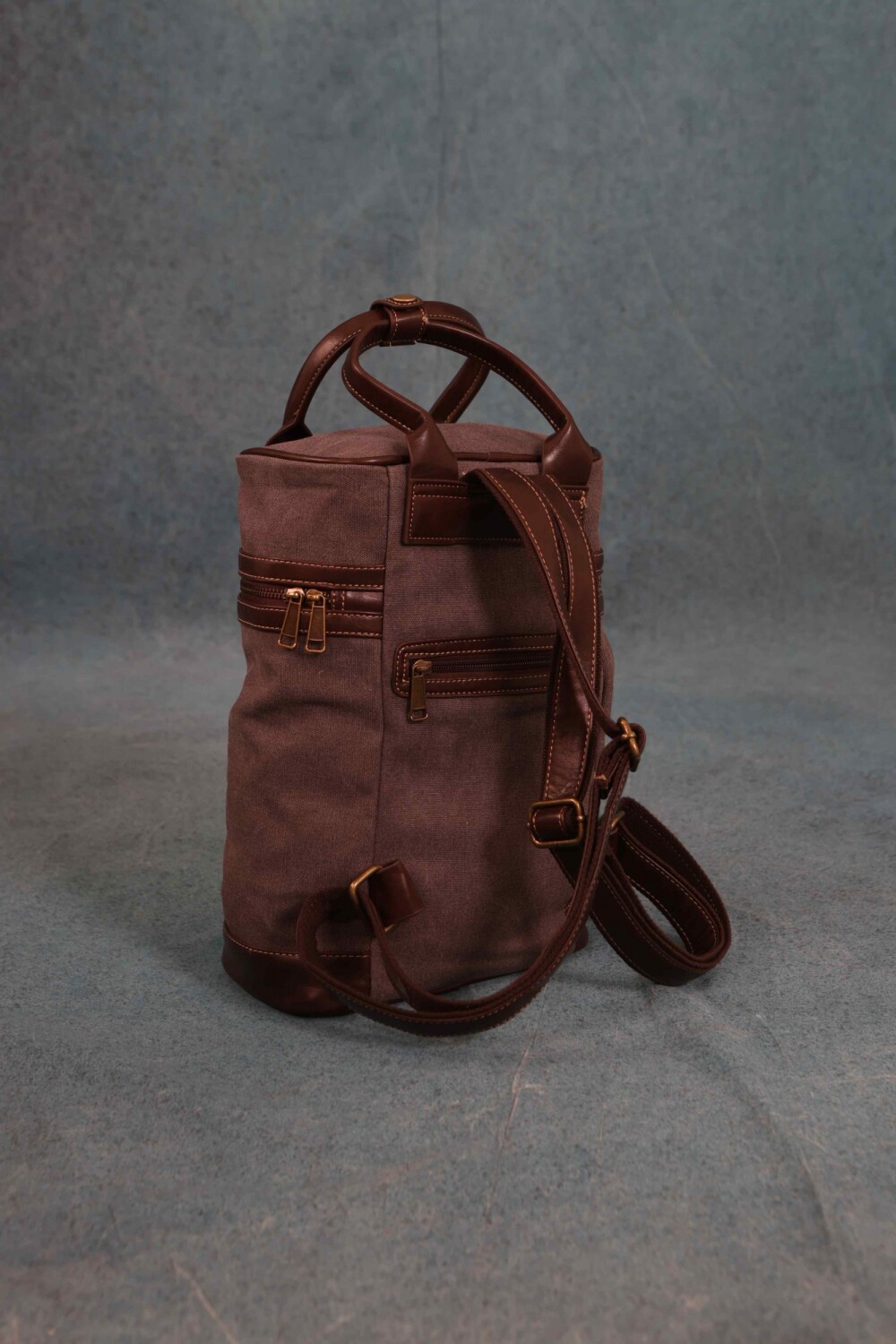 Original matera mochila en tela canvas combinada con símil cuero. Tapa con cierre metálico y bolsillo en la parte posterior. Doble asa de mano y correas largas regulables para a espalda.