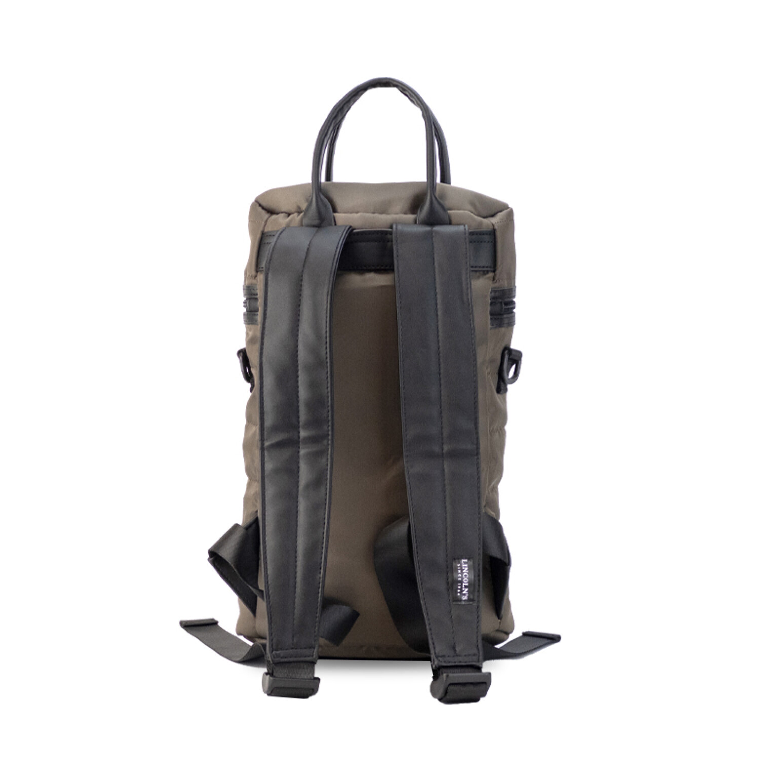 Matera estilo mochila en nylon combinada con símil cuero, tapa con cierre metálico. Cuenta con bolsillo interno, asas y correa extensible.
