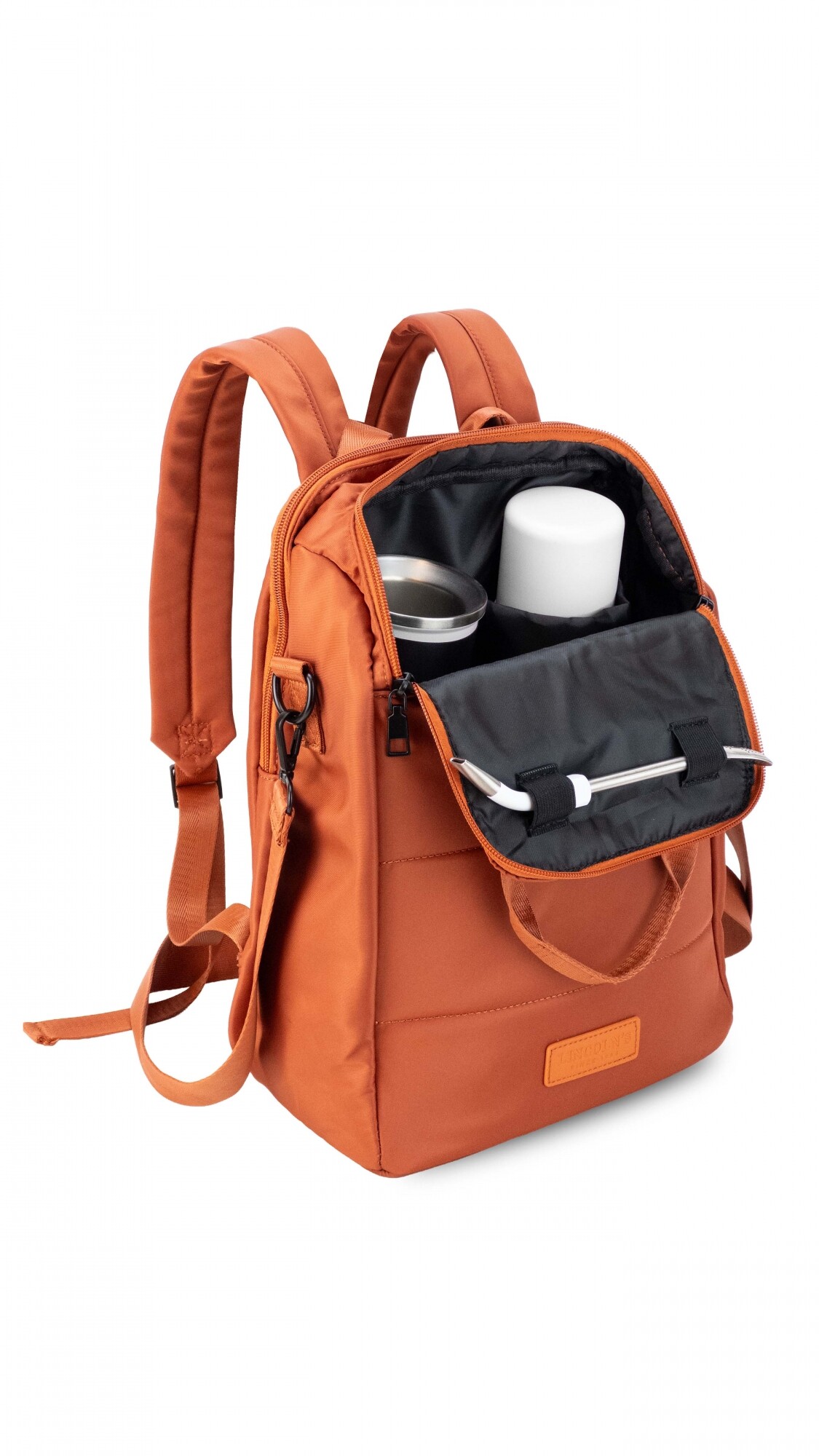 Matera mochila en tela impermeable. Cuenta con dos compartimientos: uno para llevar tu kit matero y el otro para objetos personales. Bolsillos internos y a demás de las asas de mochila cuenta un asa de mano y correa ajustable de colgar. Practica y cómoda.