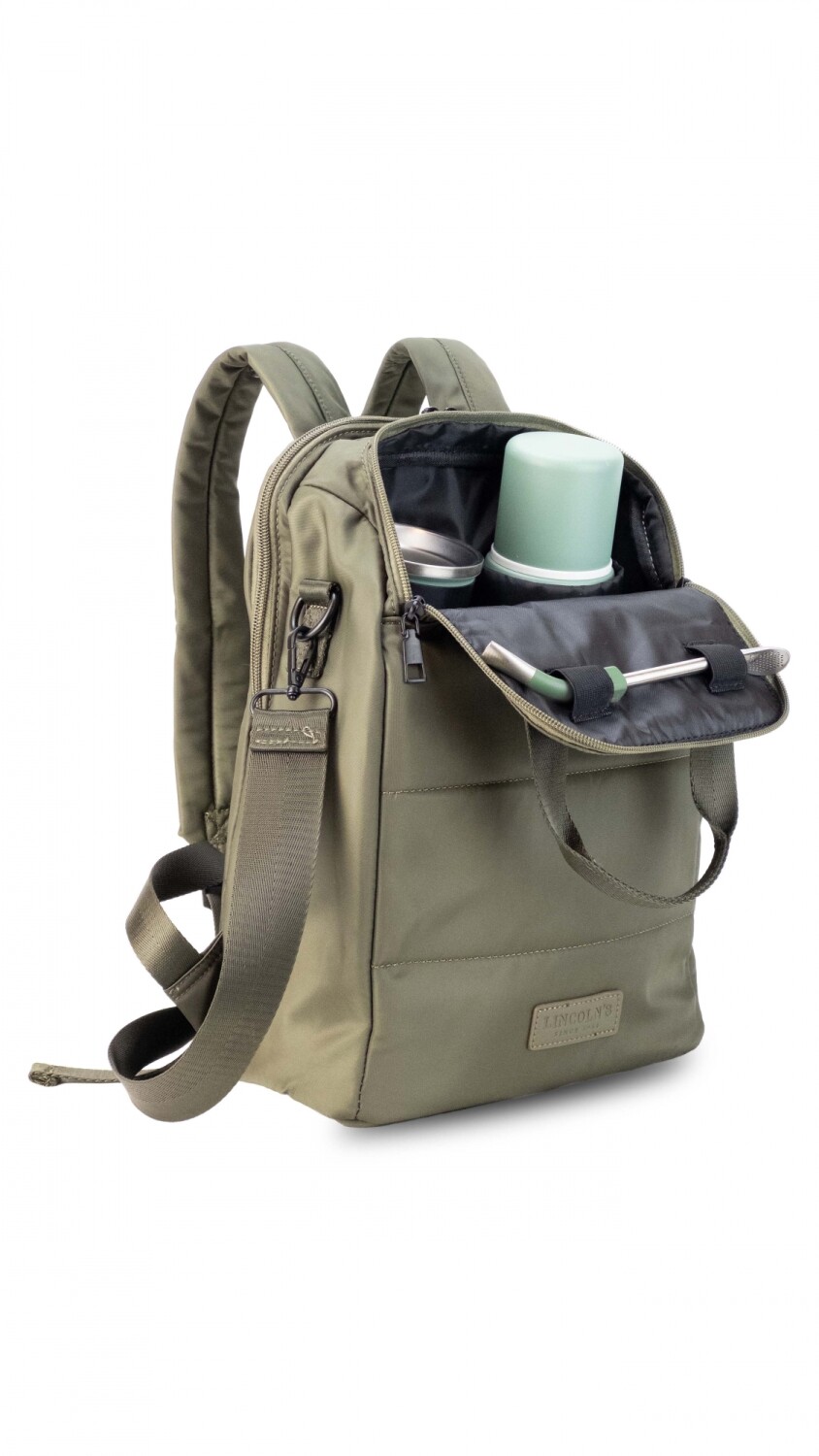 Matera mochila en tela impermeable. Cuenta con dos compartimientos: uno para llevar tu kit matero y el otro para objetos personales. Bolsillos internos y a demás de las asas de mochila cuenta un asa de mano y correa ajustable de colgar. Practica y cómoda.