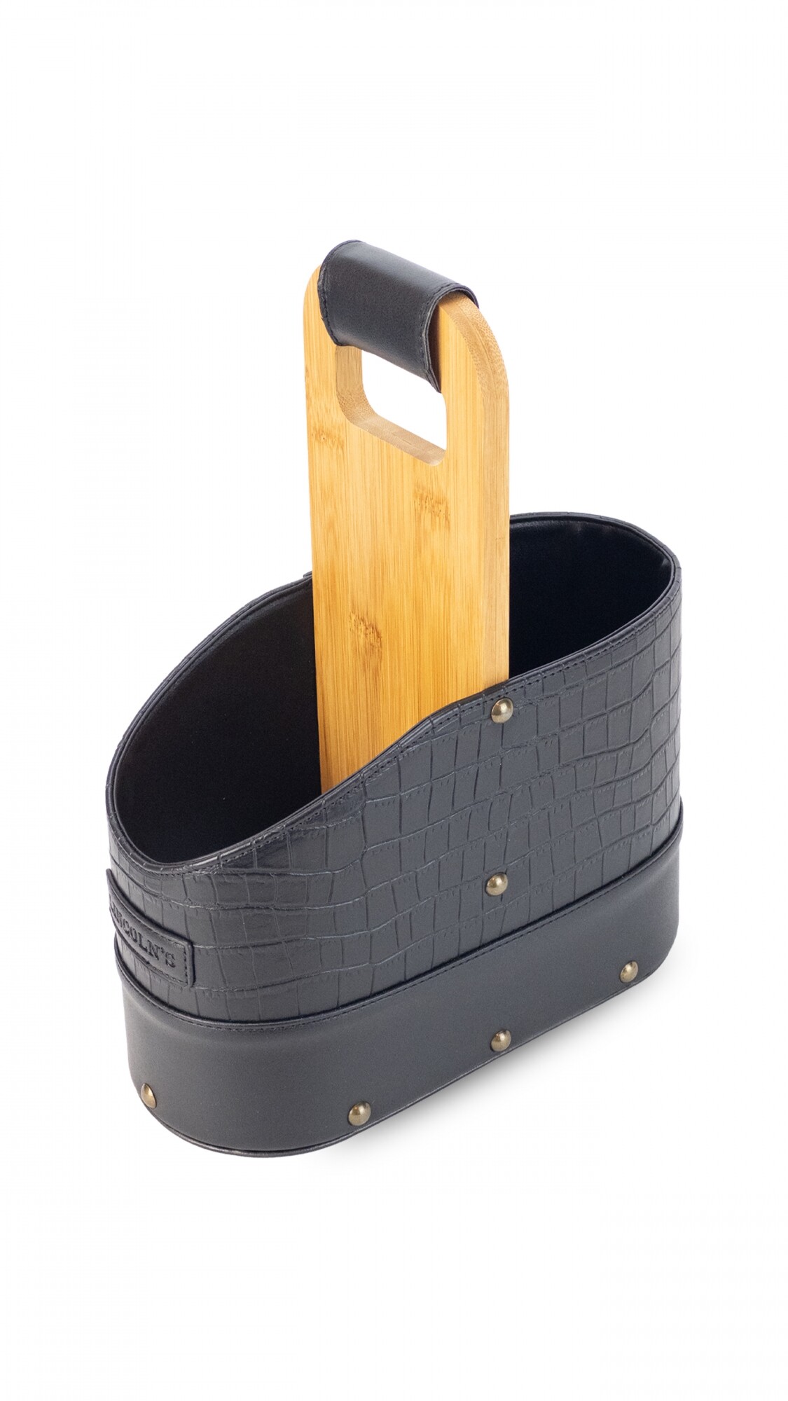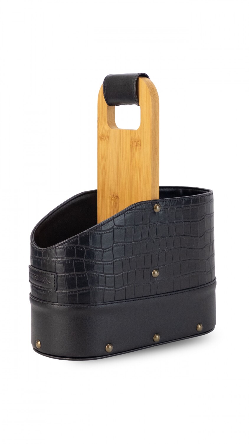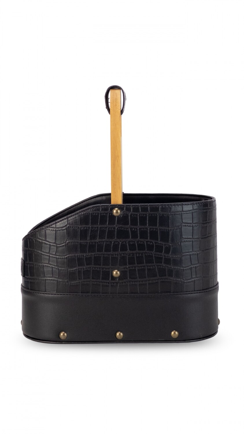 Posa termo con asa de madera y protección para el agarre. Forrado en símil cuero combinado en croco. Ideal para llevar termo y mate en el auto.
