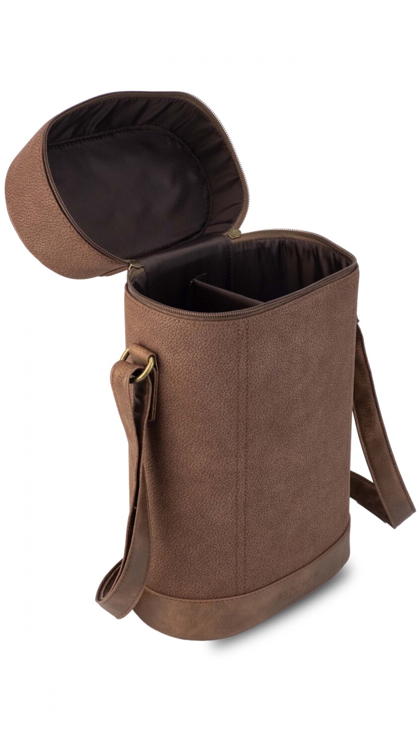 Matera confeccionada en símil cuero tipo engrasado, de textura suave. Interior forrado con división para mejor organización. Cuenta con tapa superior c/cierre y correa ajustable, ideal para transportar el equipo matero con comodidad.