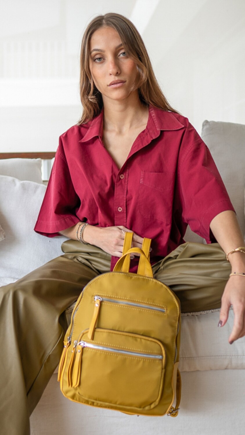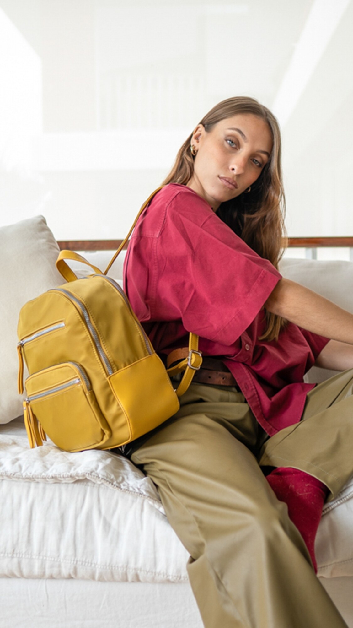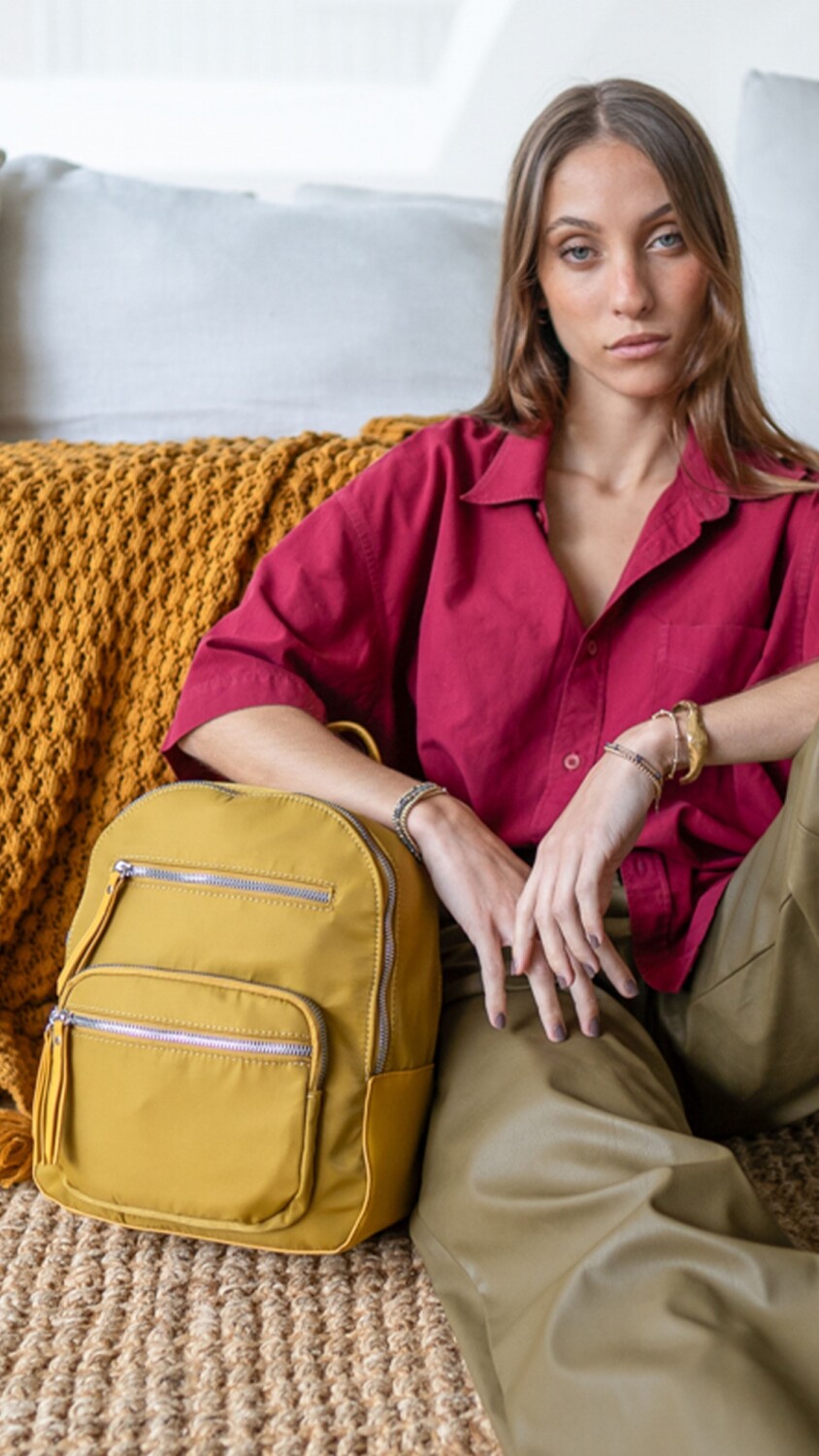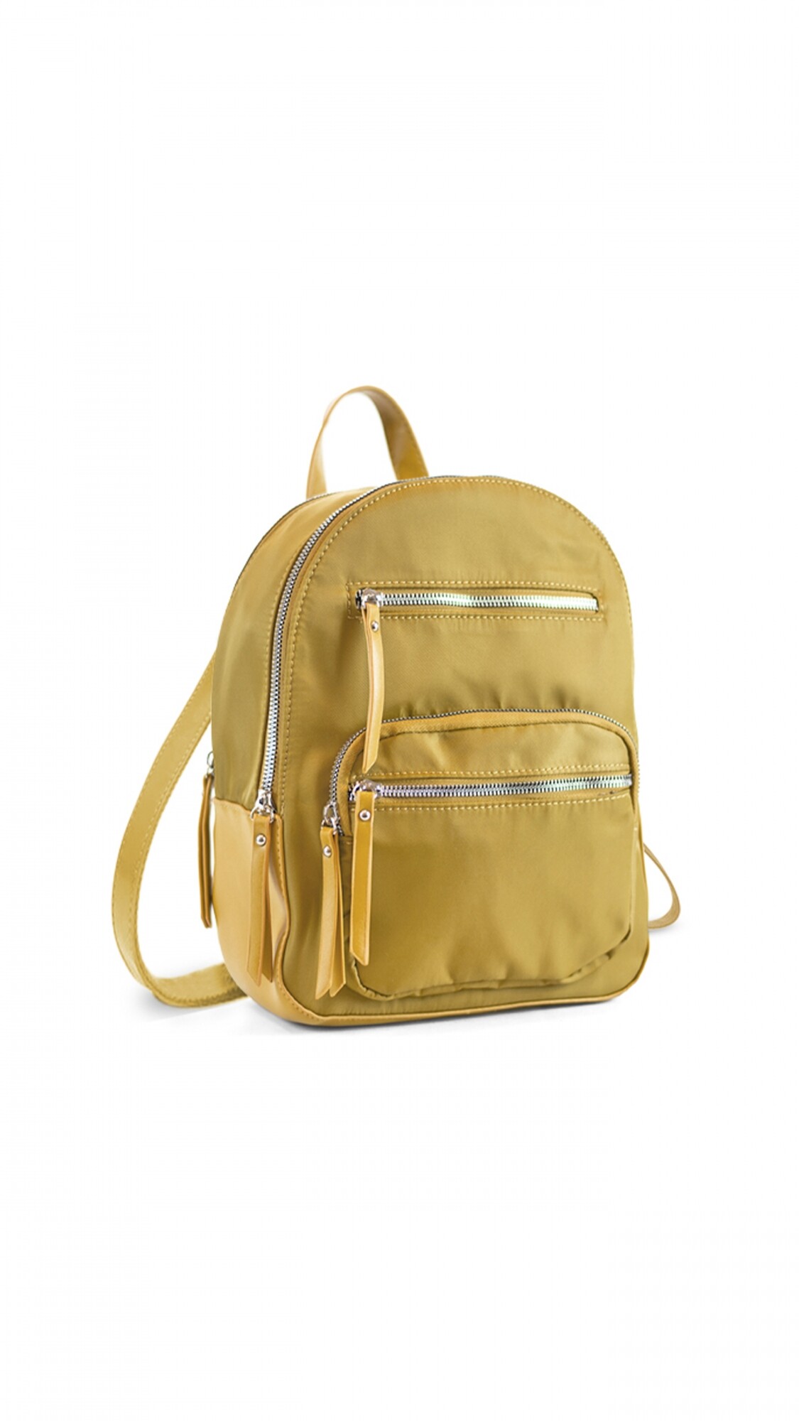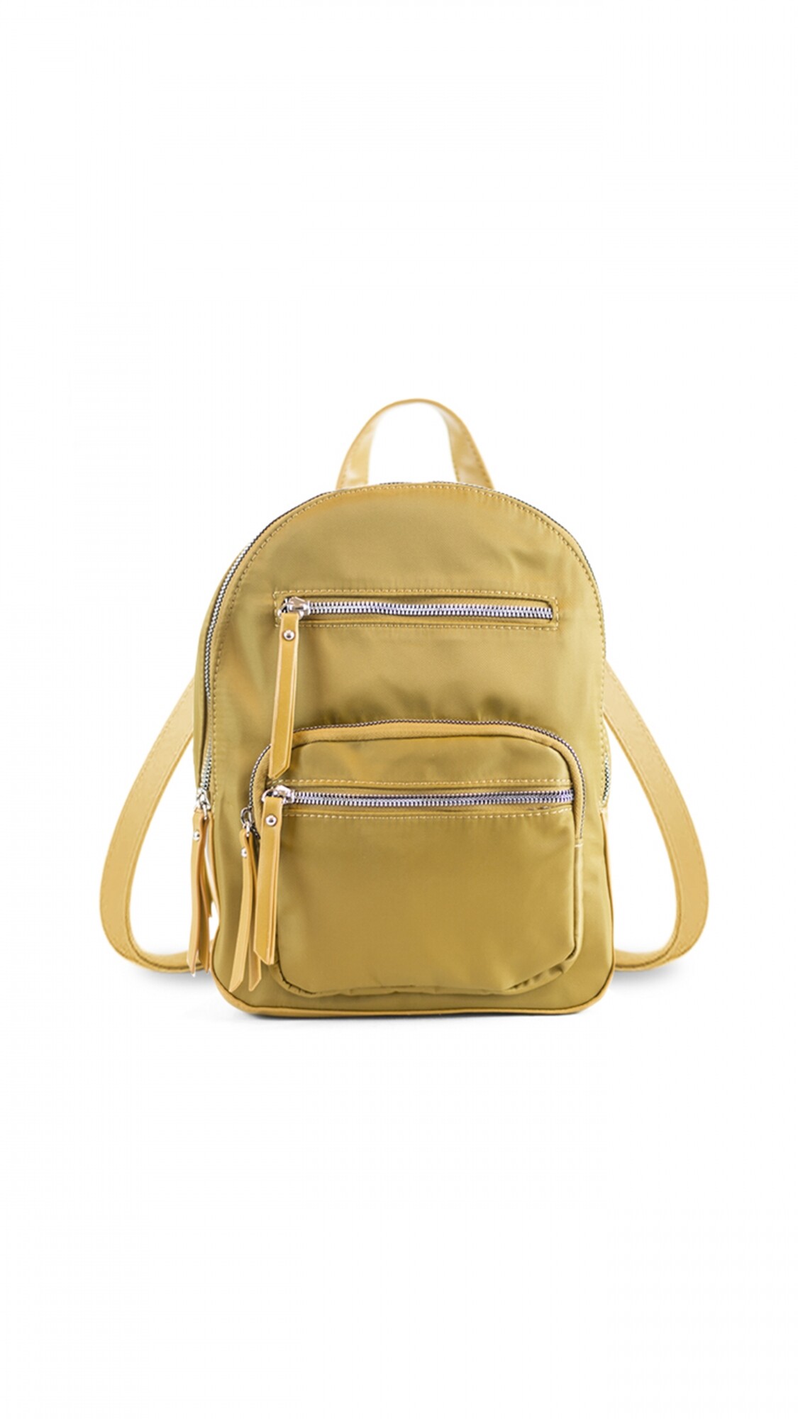 Mochila en tafeta. Doble apertura superior con cierre, tiradores metálicos.