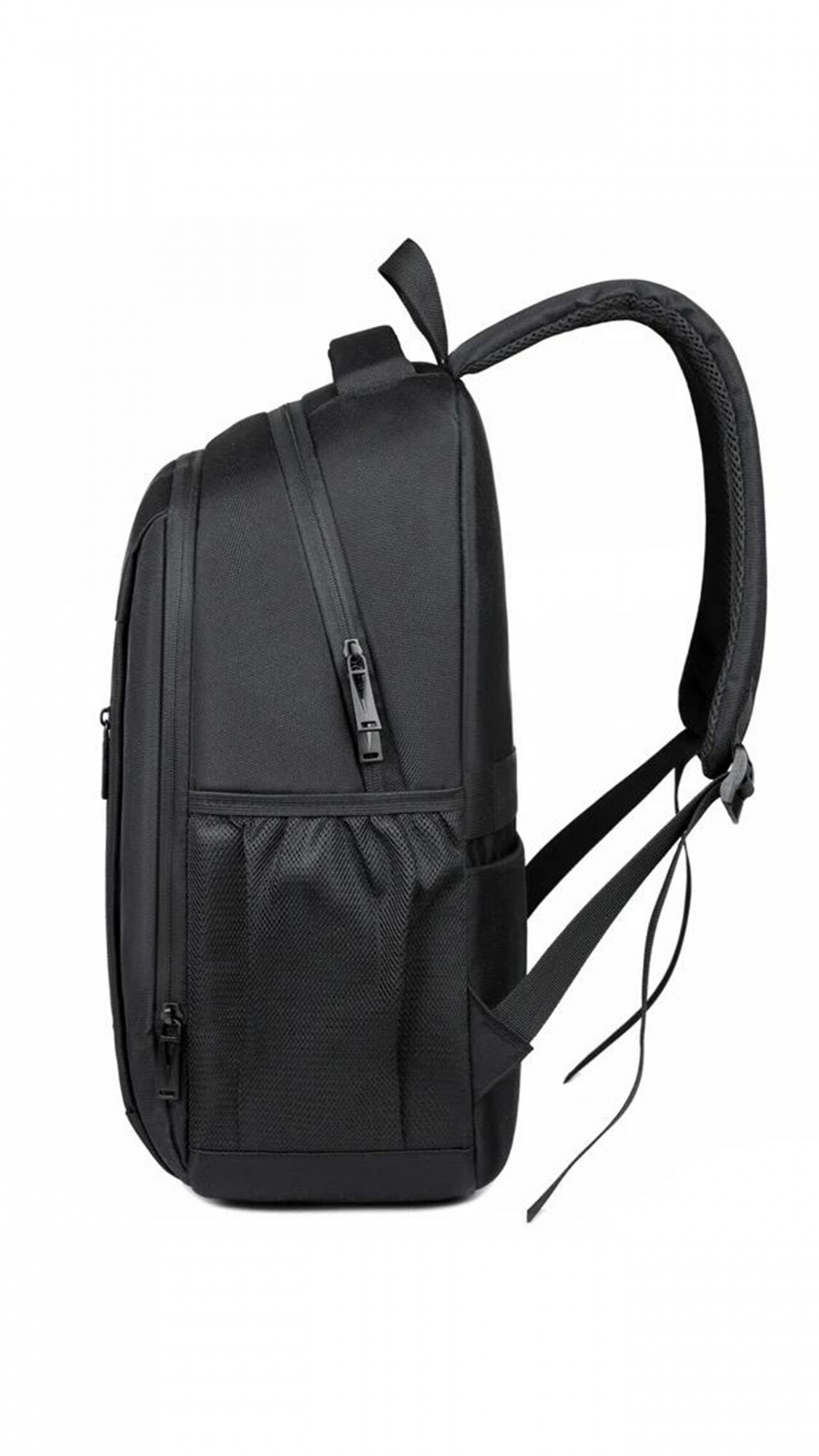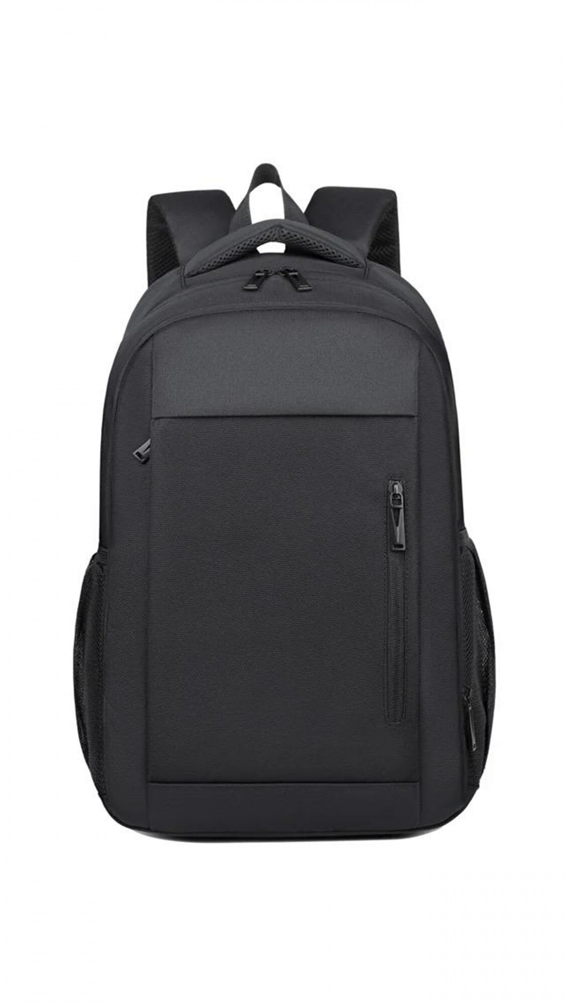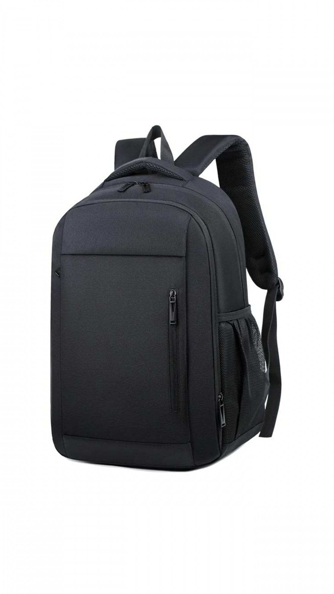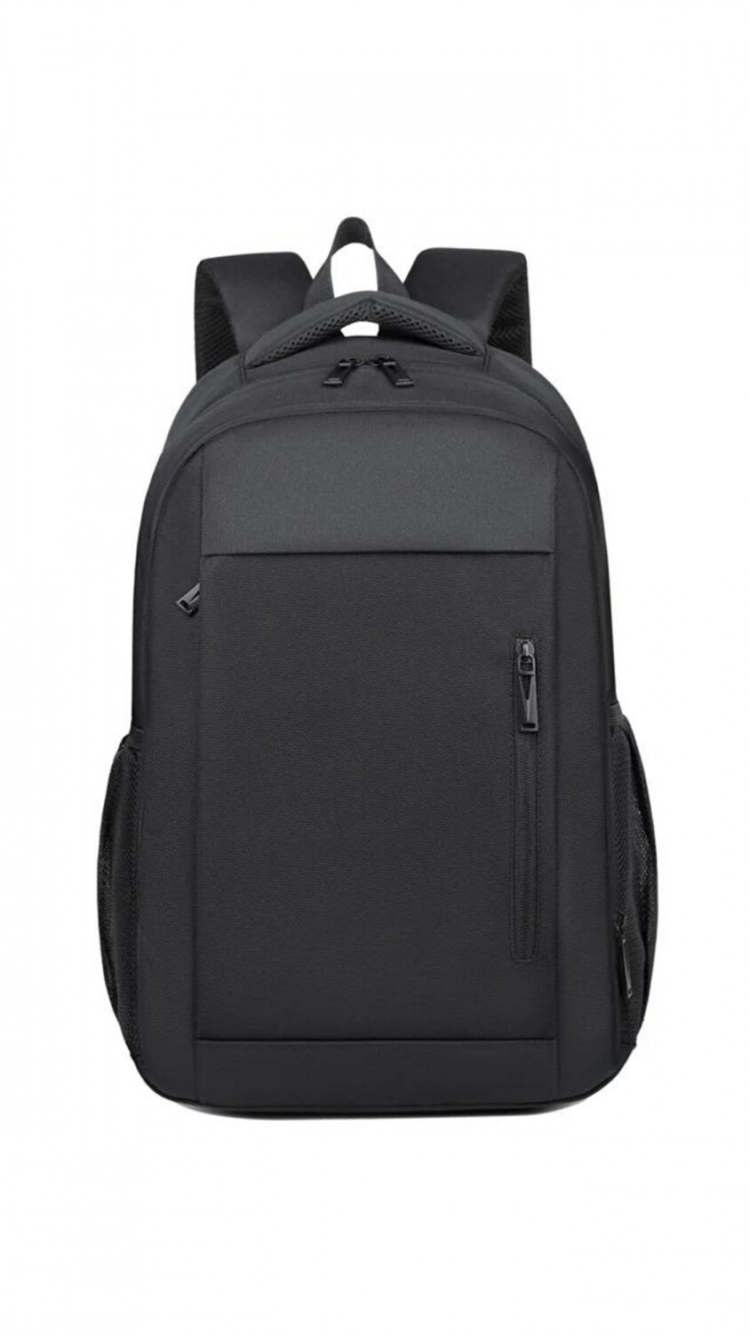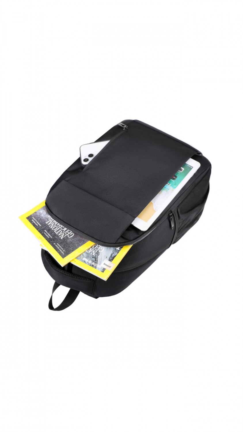 Mochila con bolsillos frontales verticales y capacidad para notebook. Tiene bolsillos laterales de rejilla y faja trasera para sujetarla a la valija. Diseño práctico y cómodo, ideal para viajes o uso diario, con excelente organización.