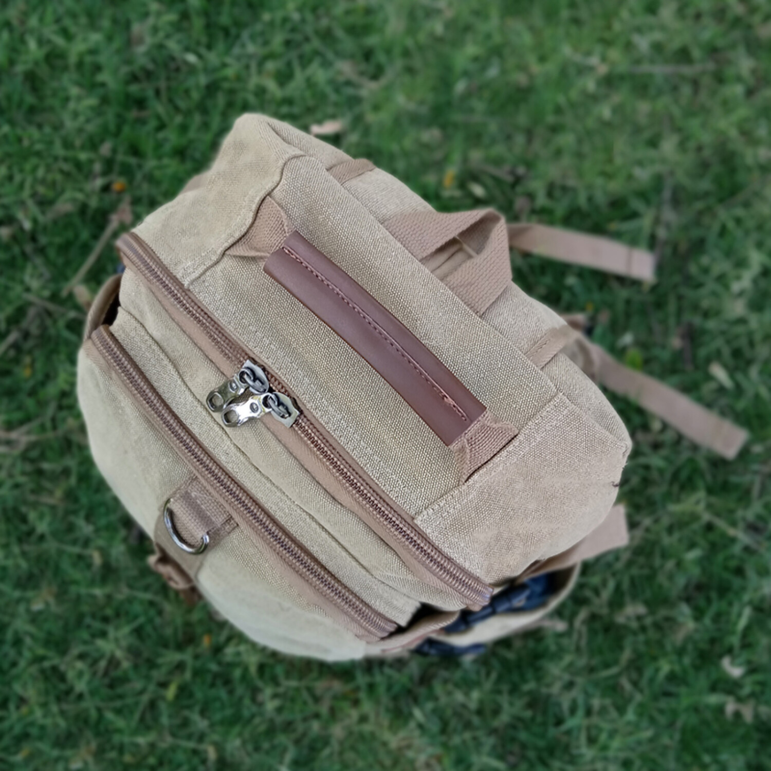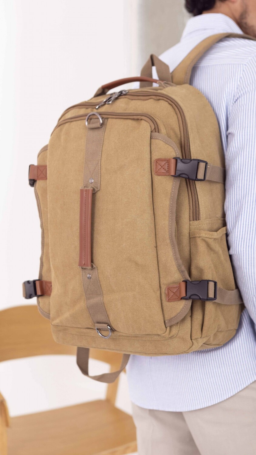 Versátil mochila - bolso canvas con presillas y broches plásticos para ajustar. Bolsillo al frente con cierre. Interior con repartición para laptop. Bolsillos laterales. Correas cortas de mano para su uso como bolso y correas para la espalda regulables.