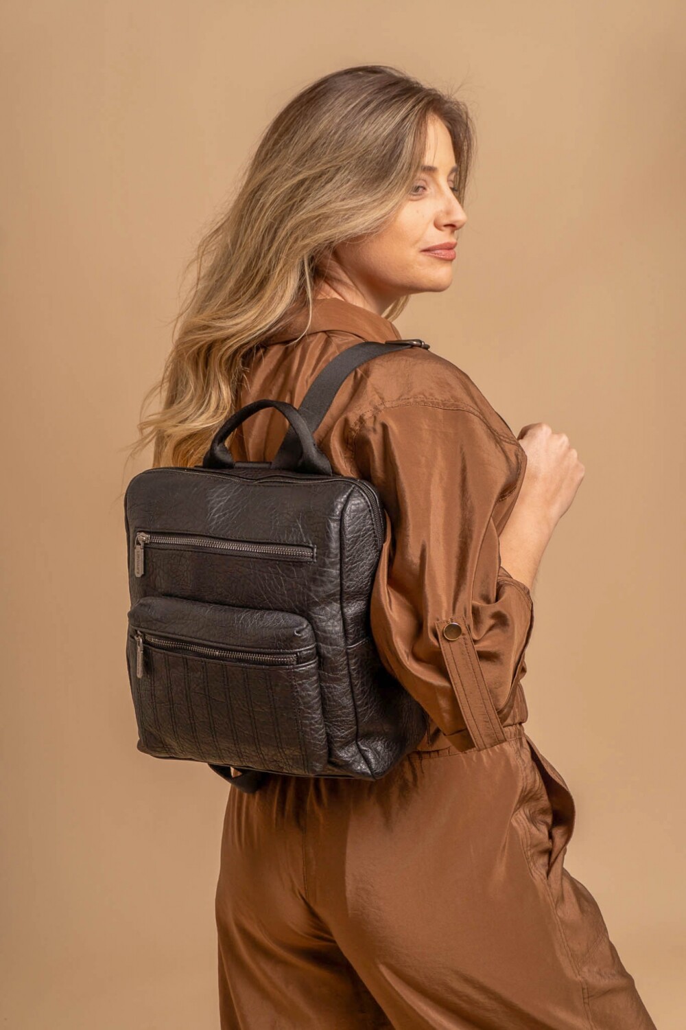 Mochila mediana de símil cuero con asa superior, dos compartimientos con cierre y bolsillos frontales. Práctica y urbana, ideal para el día a día con estilo y comodidad.