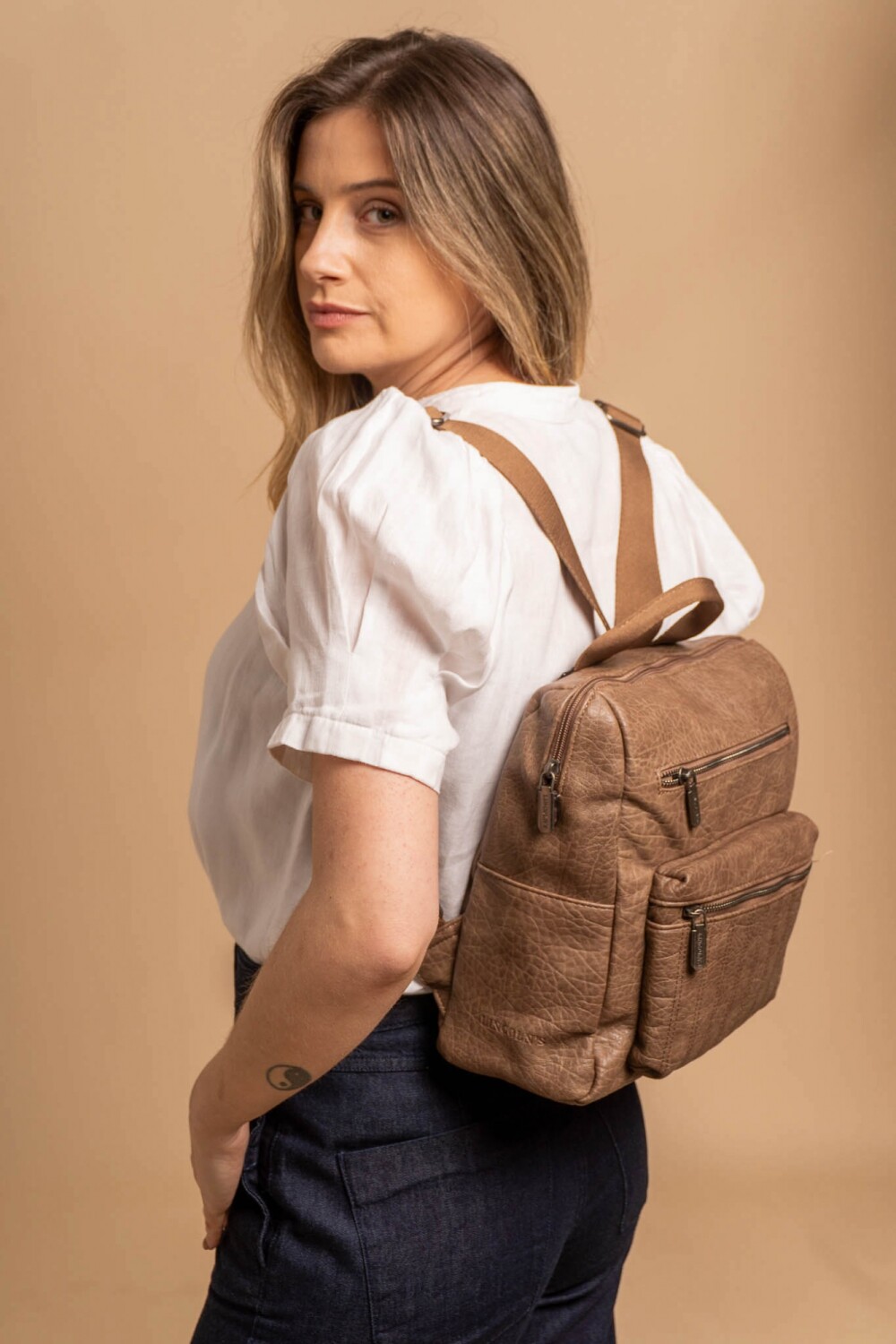 Mochila mediana de símil cuero con asa superior, dos compartimientos con cierre y bolsillos frontales. Práctica y urbana, ideal para el día a día con estilo y comodidad.
