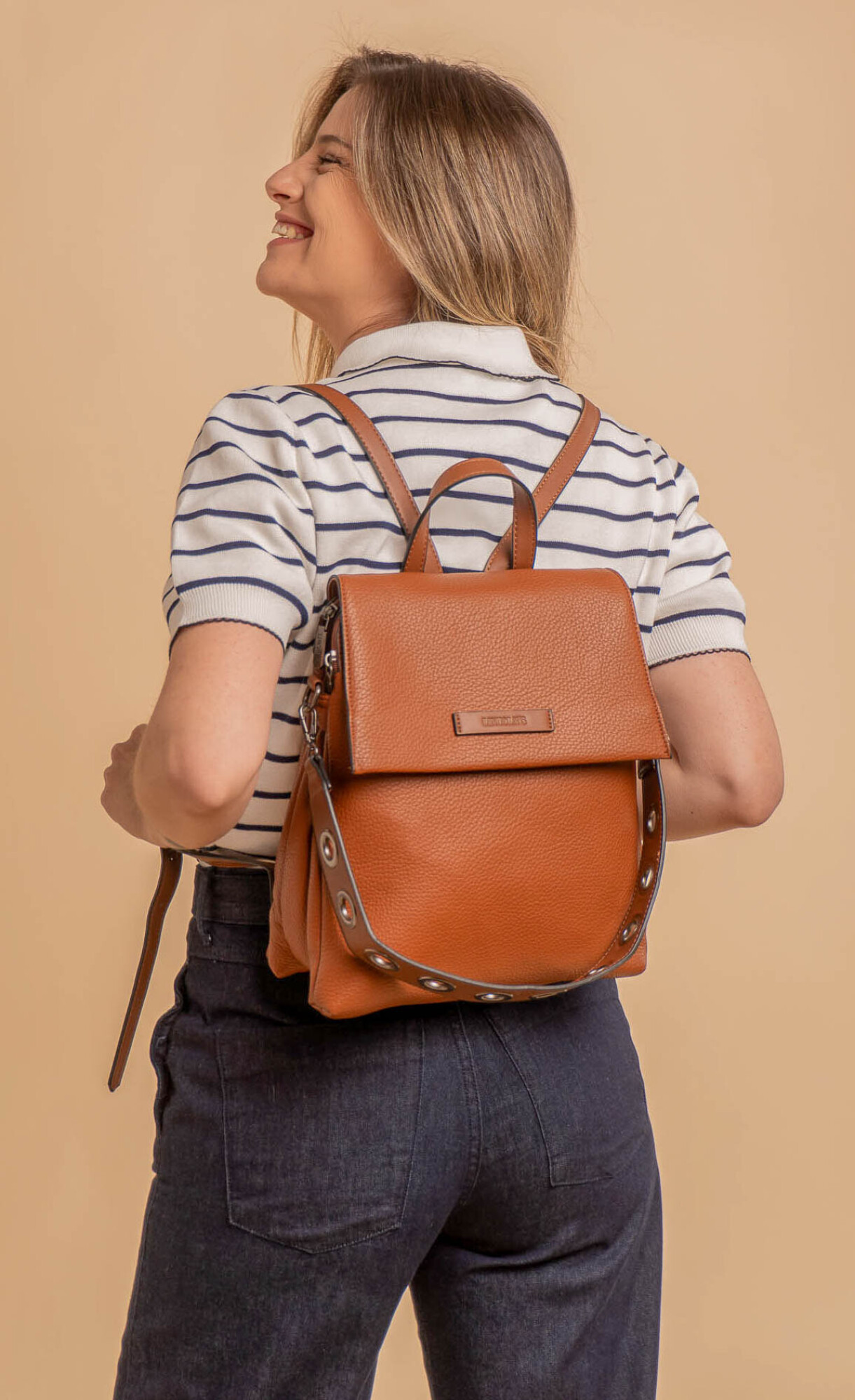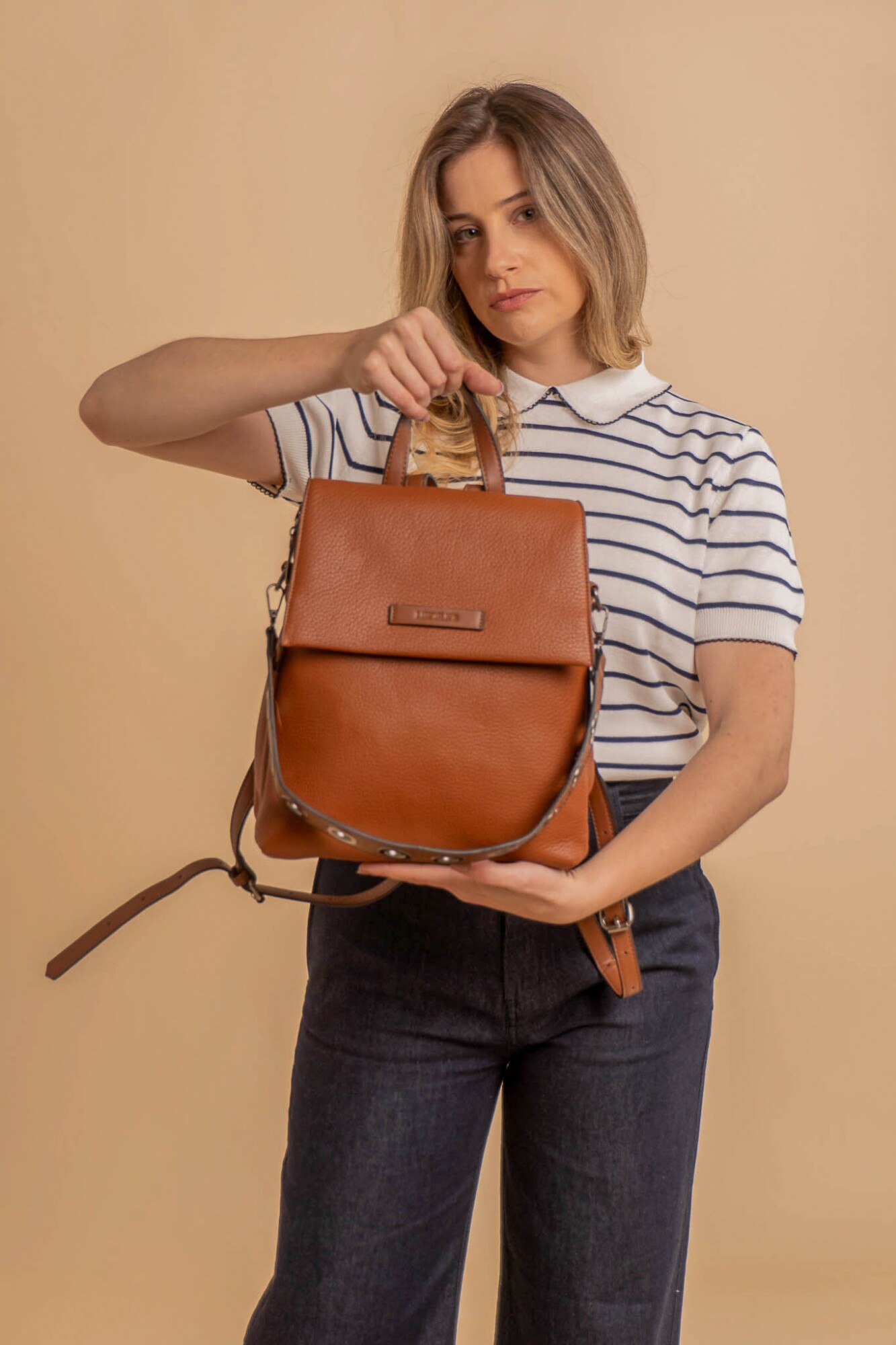 Mochila cartera con tapa, tiene dos compartimientos mas división interna al medio, doble cierre para mayor seguridad y bolsillo trasero con cierre. Práctica, moderna y perfecta para llevar todo organizado.