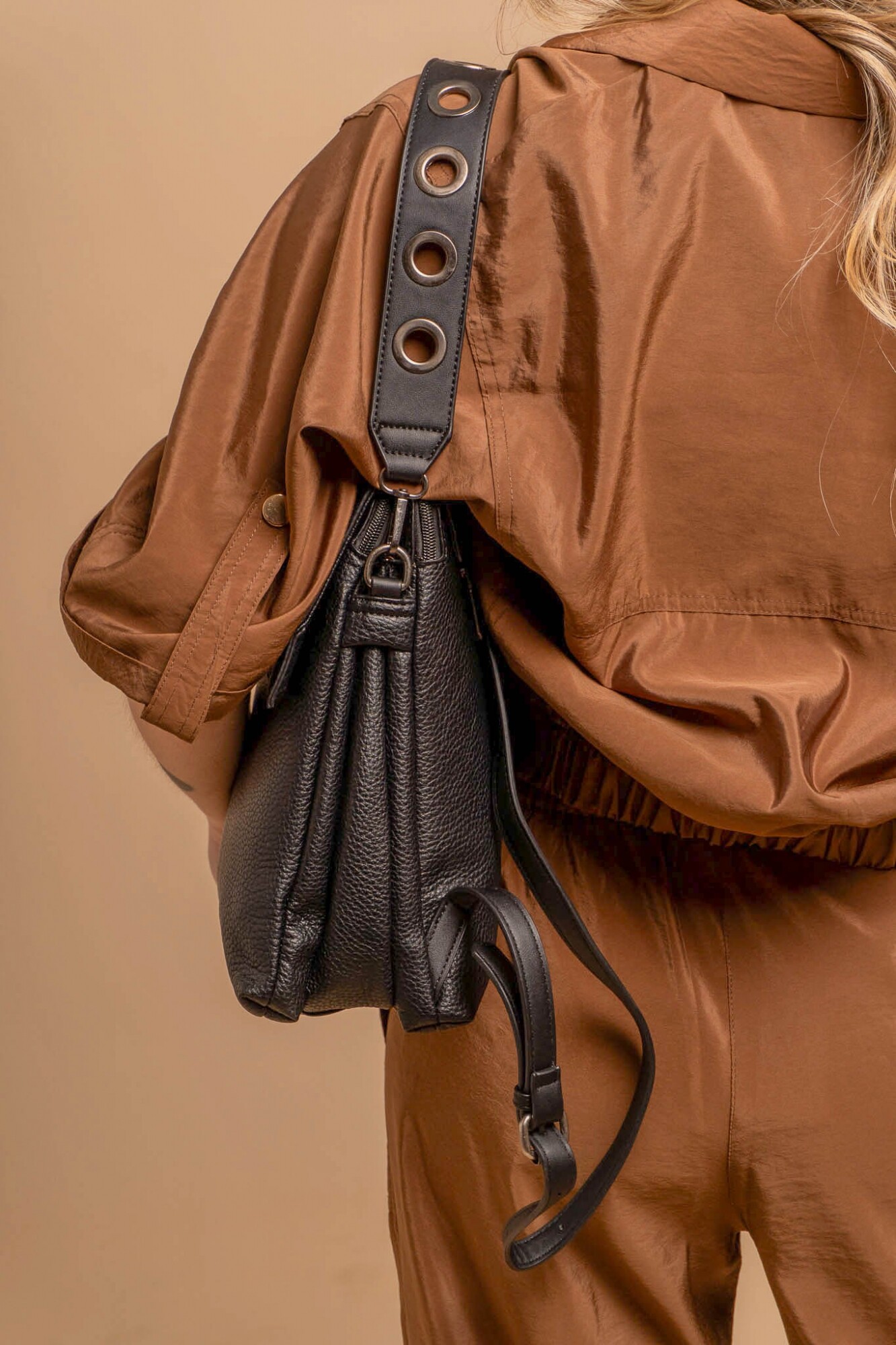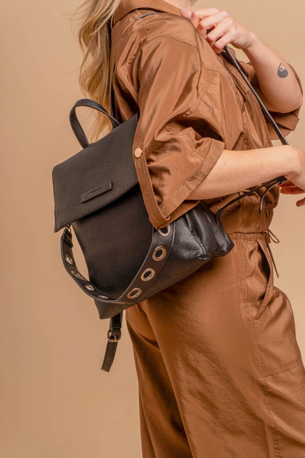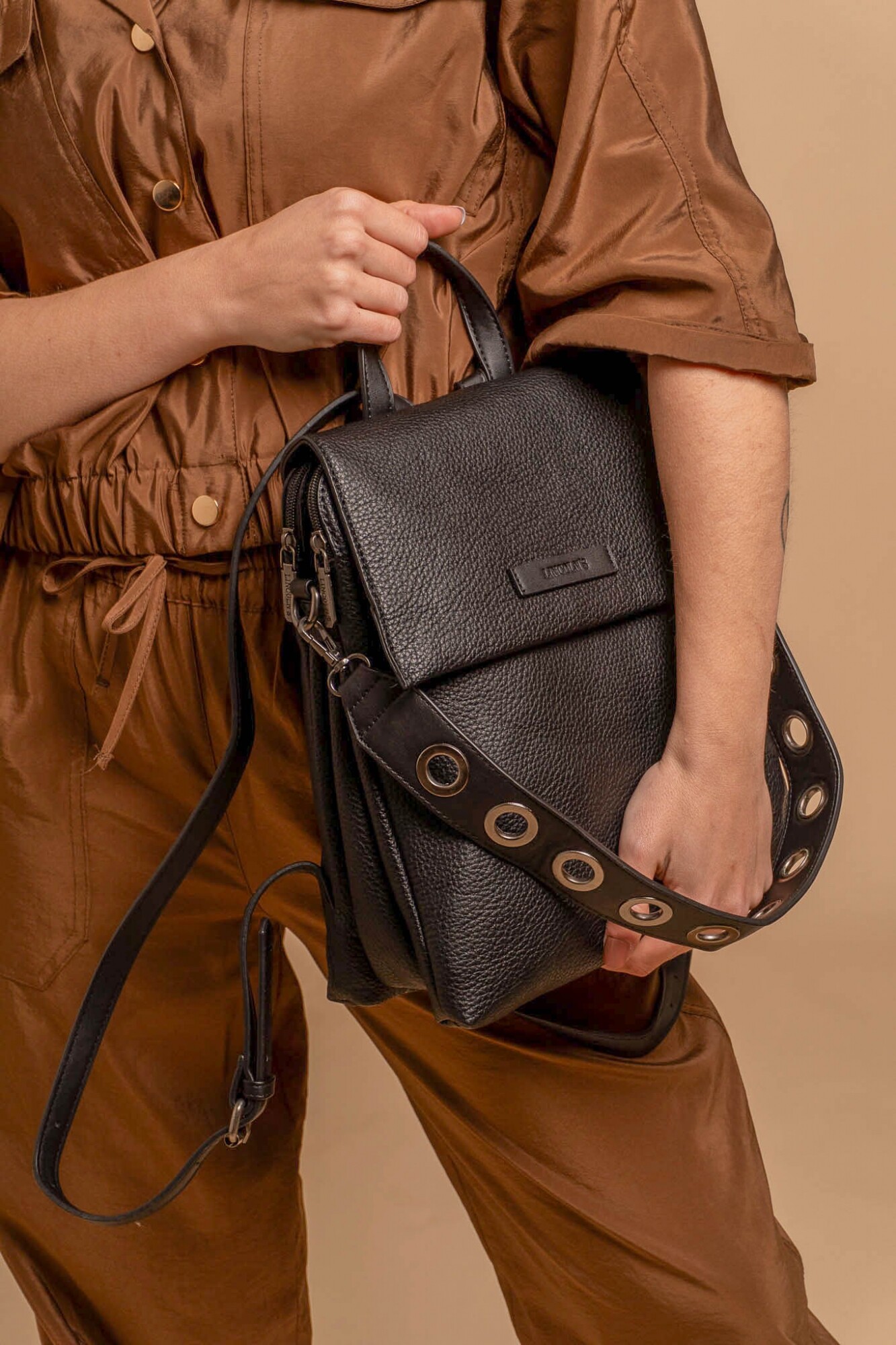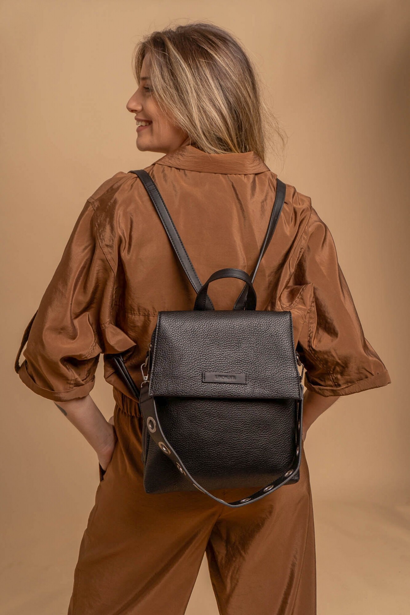 Mochila cartera con tapa, tiene dos compartimientos mas división interna al medio, doble cierre para mayor seguridad y bolsillo trasero con cierre. Práctica, moderna y perfecta para llevar todo organizado.