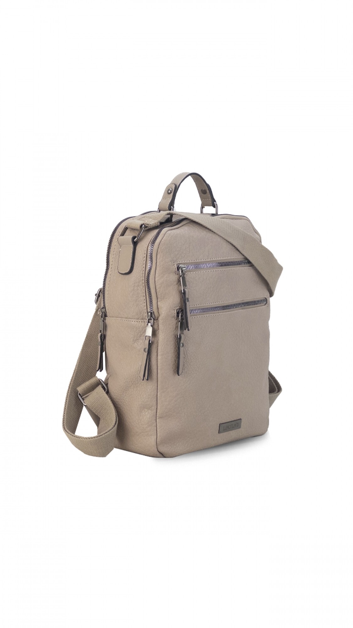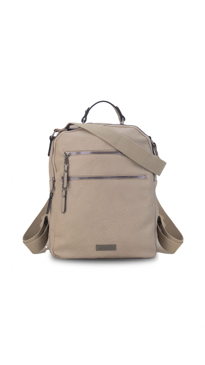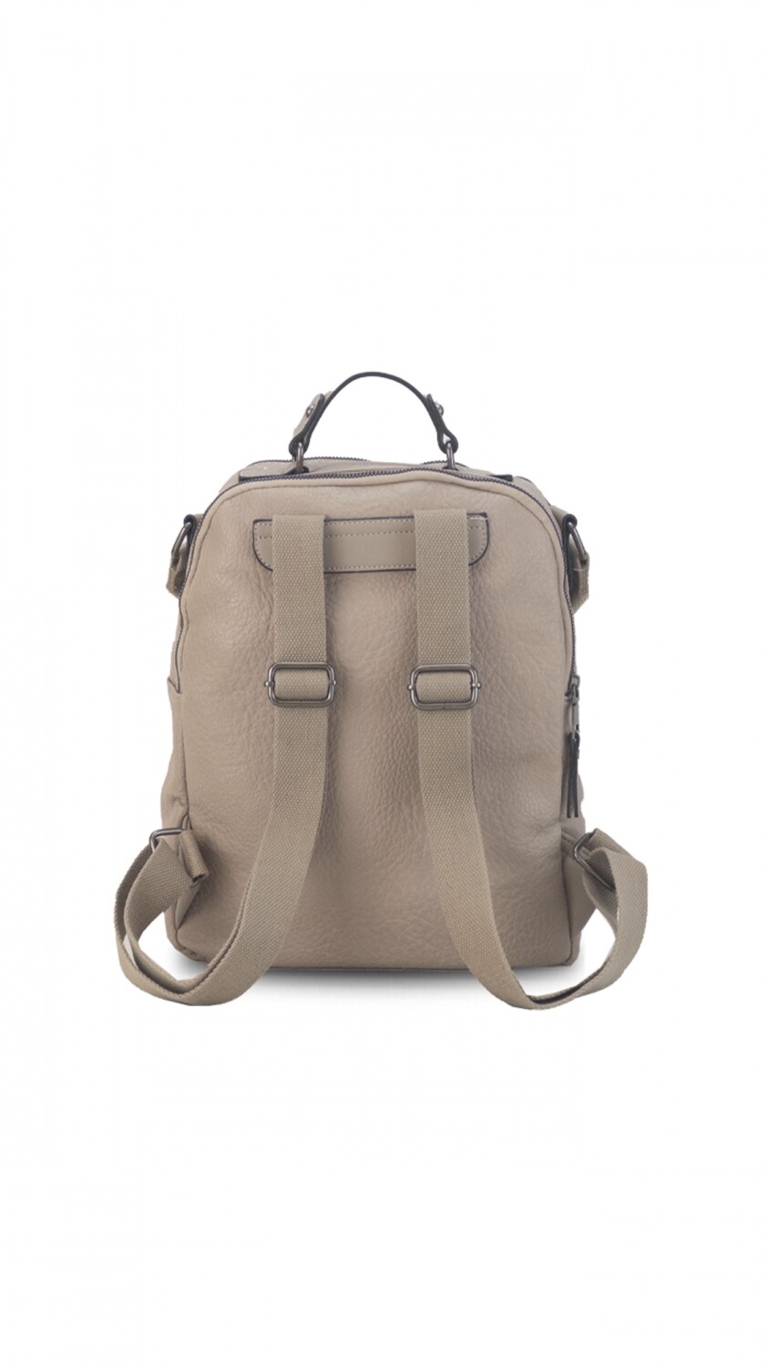 Mochila símil cuero. Apertura con doble apertura superior con cierre.
