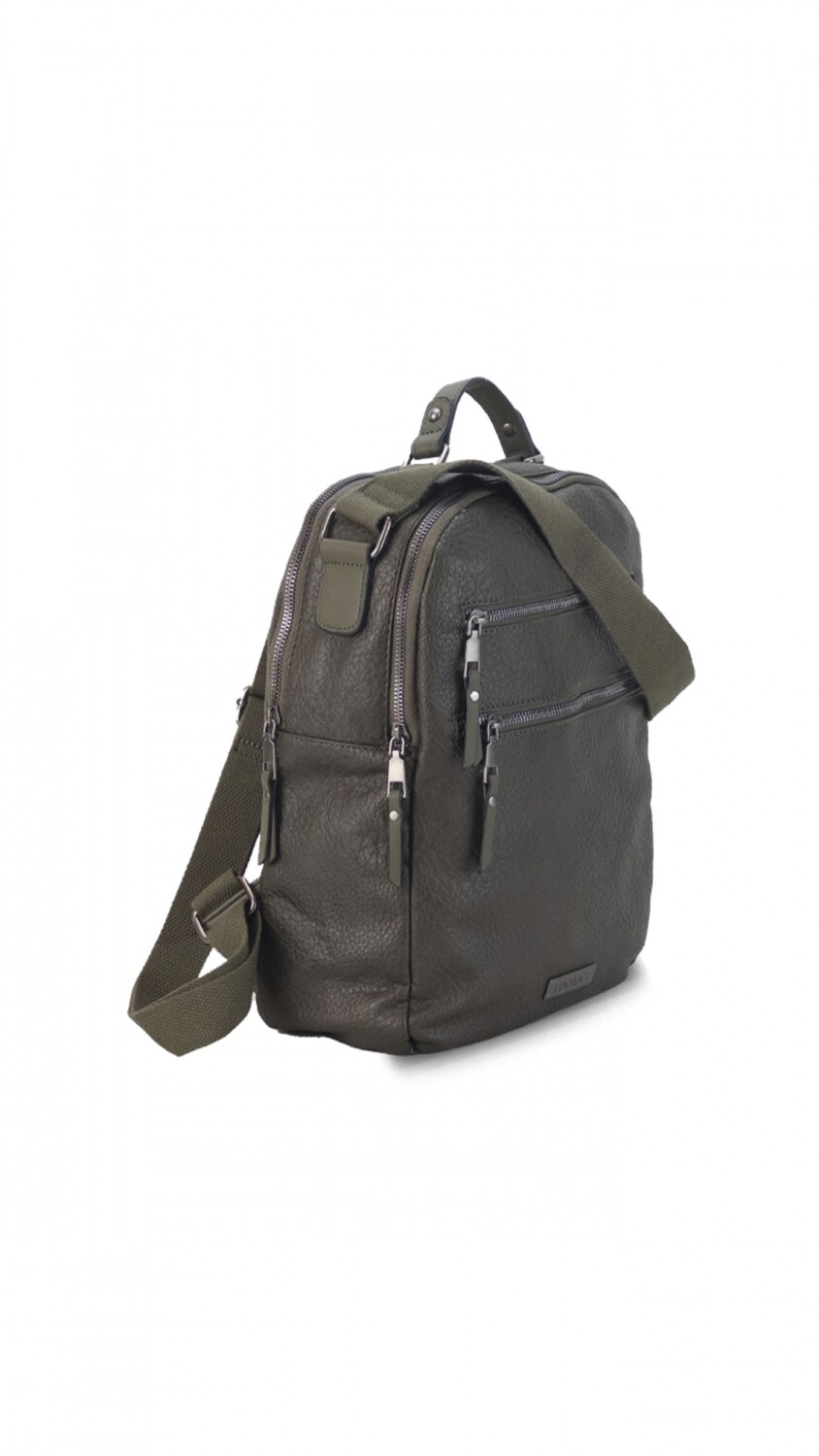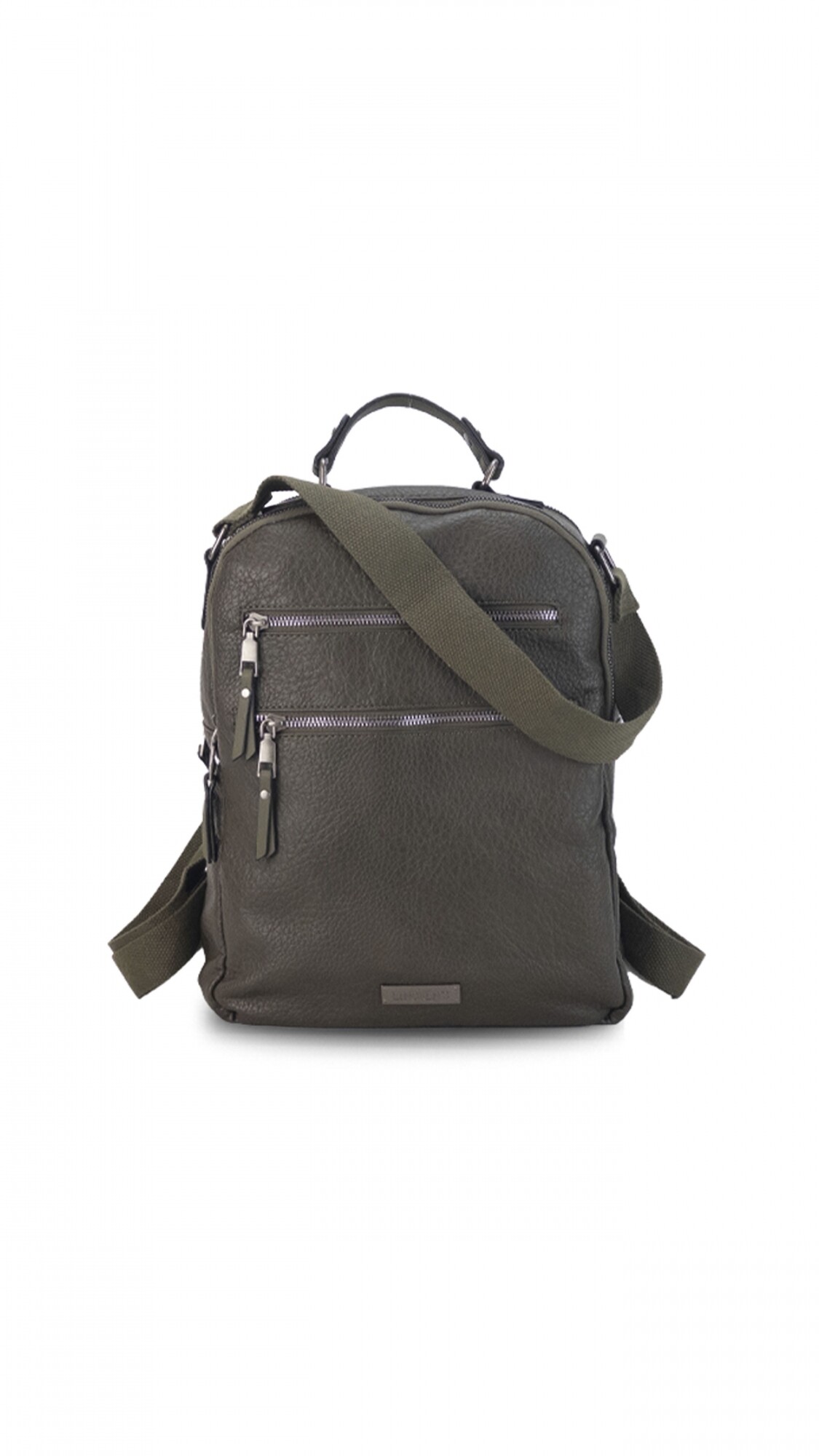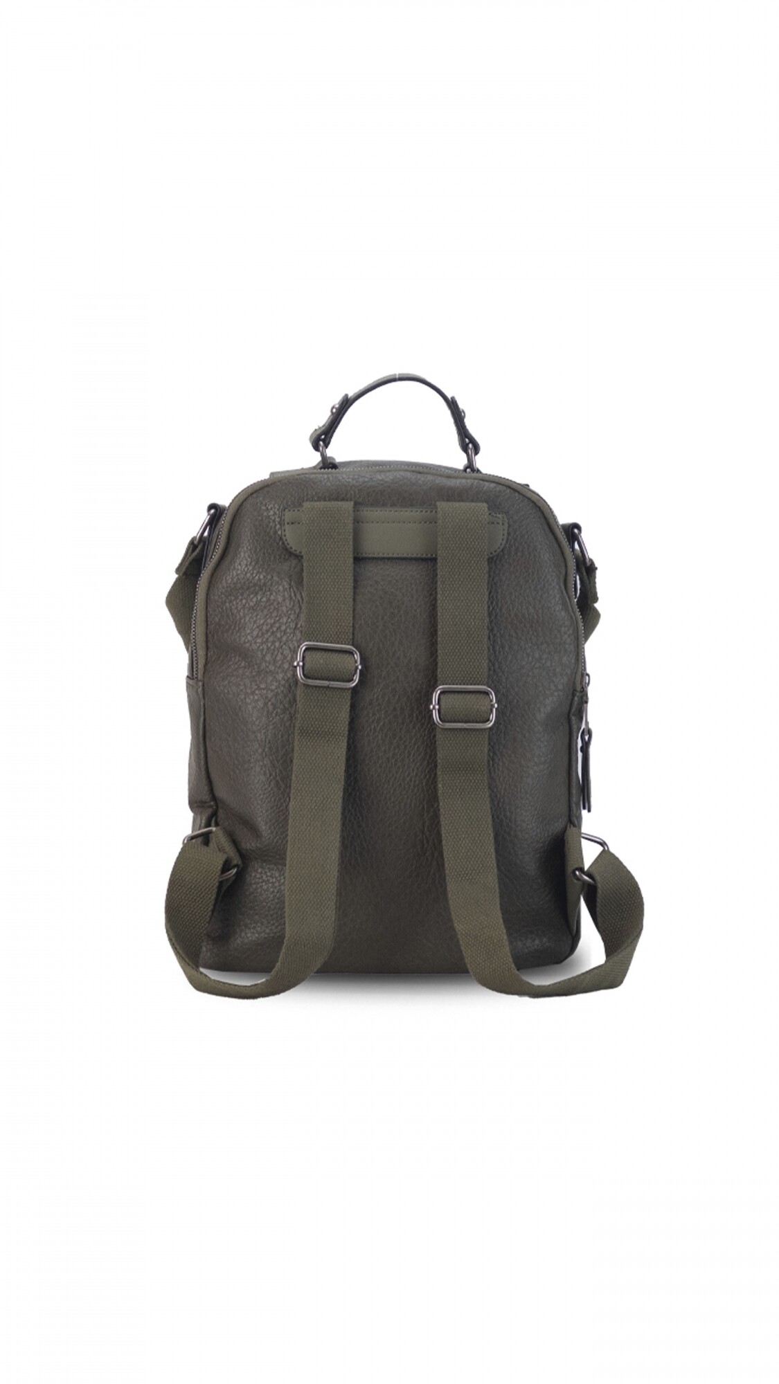 Mochila símil cuero. Apertura con doble apertura superior con cierre.
