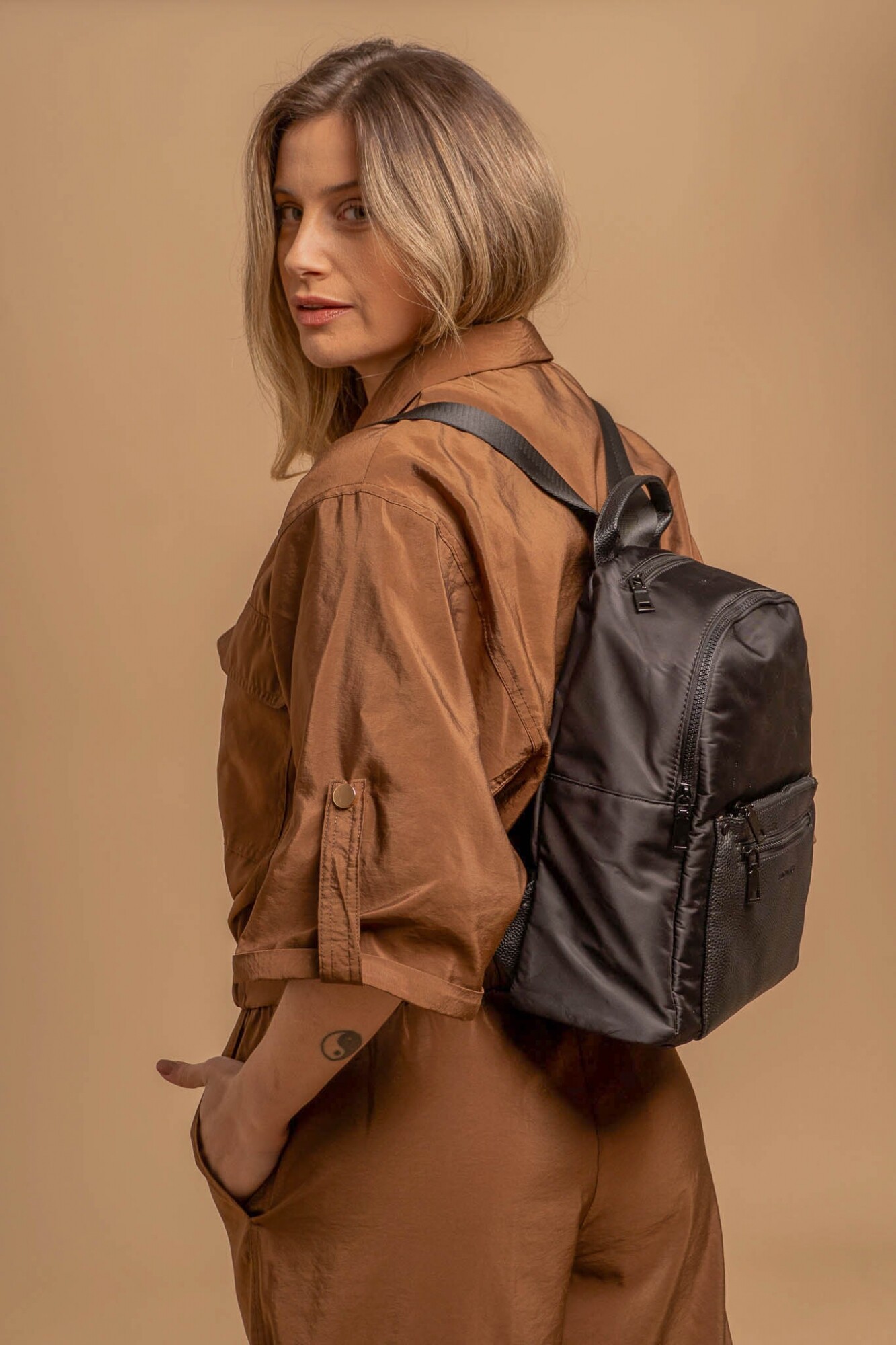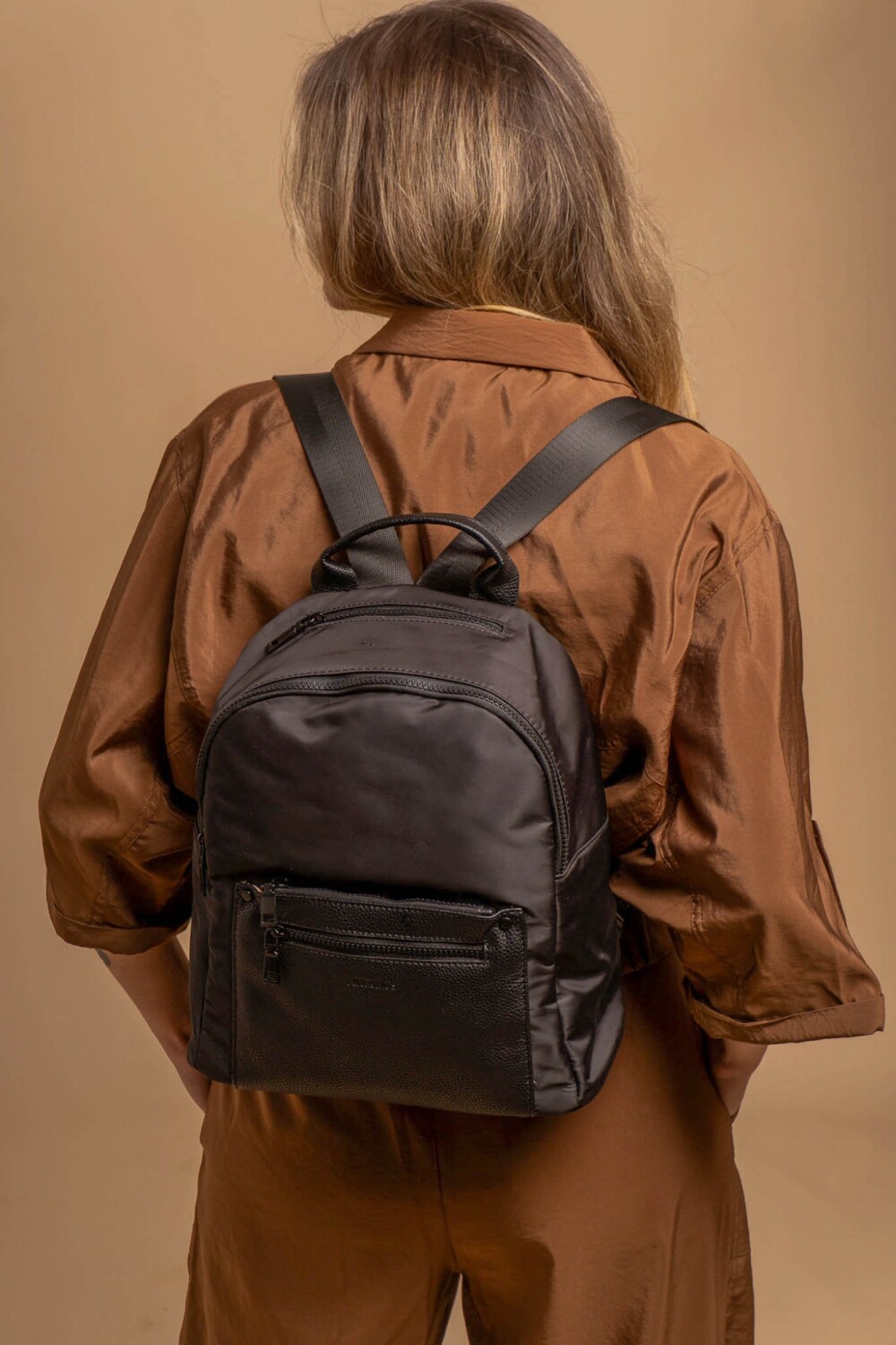 Mochila urbana de diseño moderno, combinado, tela resistente y con detalle en símil cuero. cuenta con amplio compartimiento principal y bolsillo frontal con cierre, ideal para llevar tus pertenencias con estilo y comodidad.