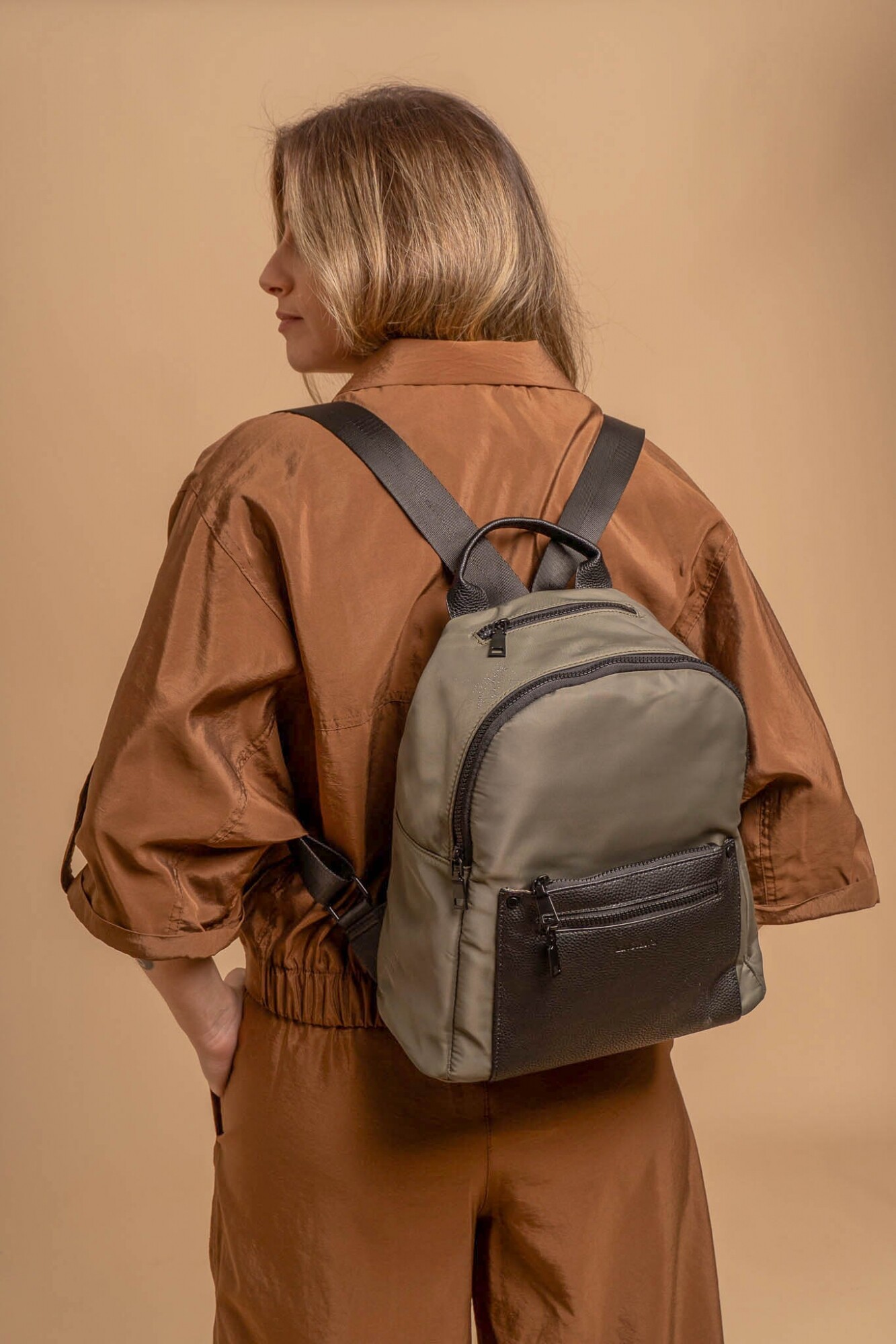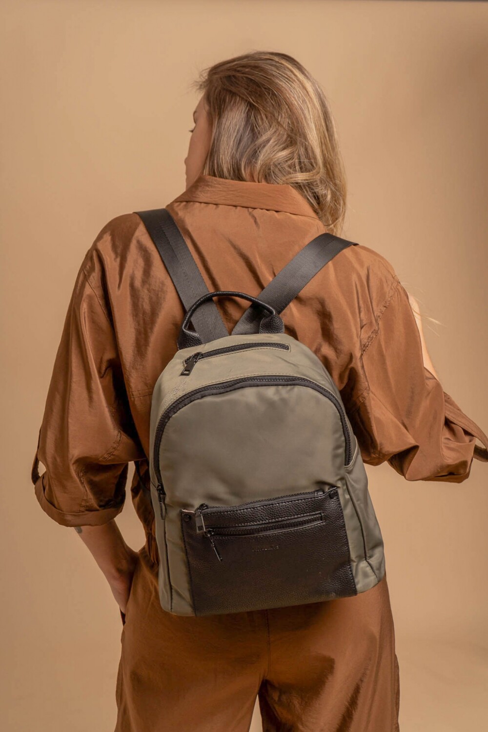 Mochila urbana de diseño moderno, combinado, tela resistente y con detalle en símil cuero. cuenta con amplio compartimiento principal y bolsillo frontal con cierre, ideal para llevar tus pertenencias con estilo y comodidad.